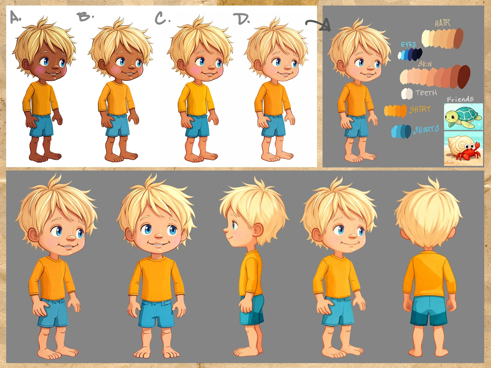 I began with quick sketches based on Jeff’s son, then used AI-assisted exploration to test a style inspired by modern children's book illustrations . From there, I refined the design in Photoshop, explored skin tone variations for approval, and created a turnaround to keep the character consistent throughout the book.