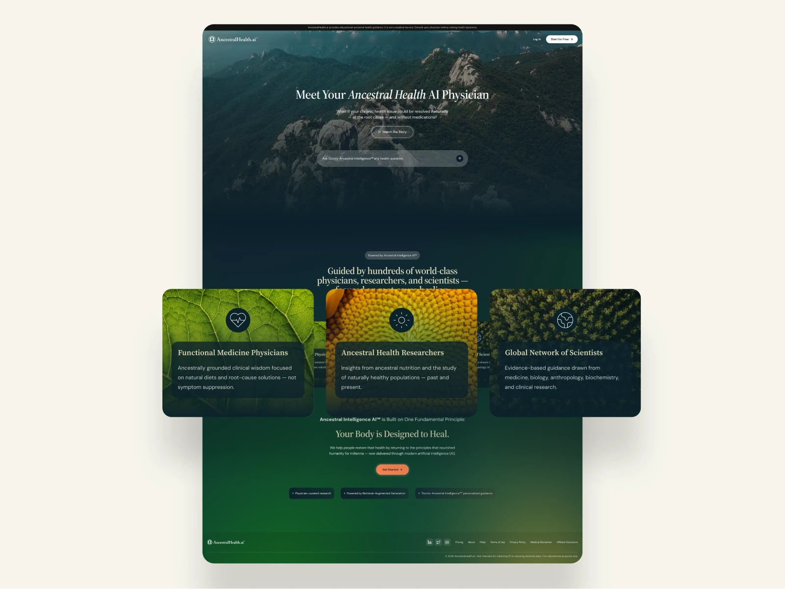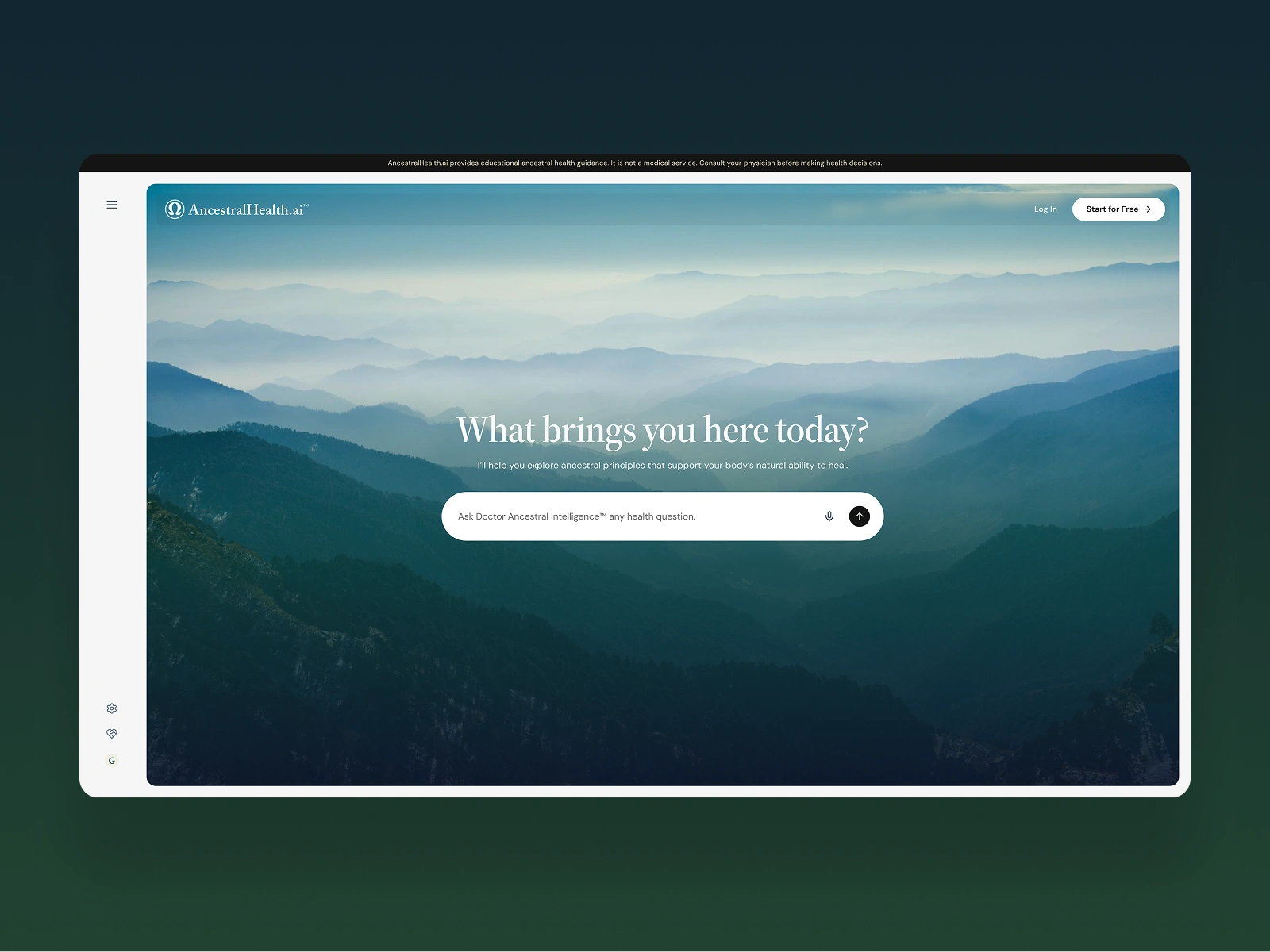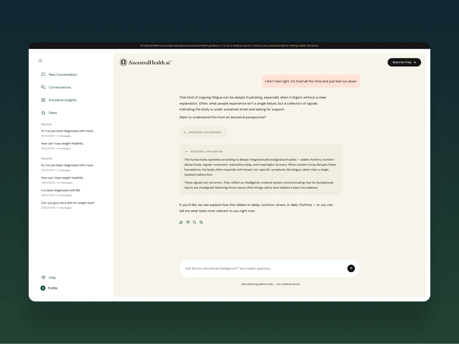 A web platform delivering natural, empathetic conversations. The AI explains ancestral health principles, offers lifestyle guidance, and encourages exploration while emphasizing safety and collaboration with healthcare providers.
