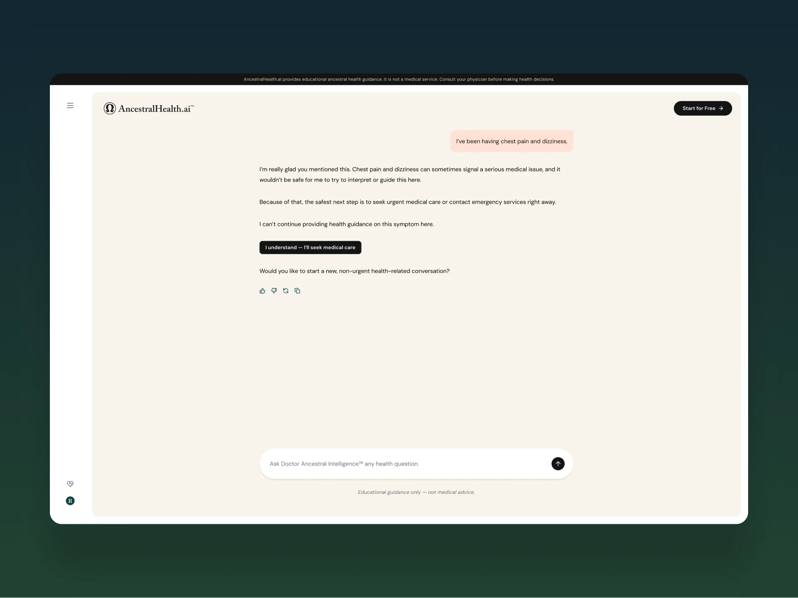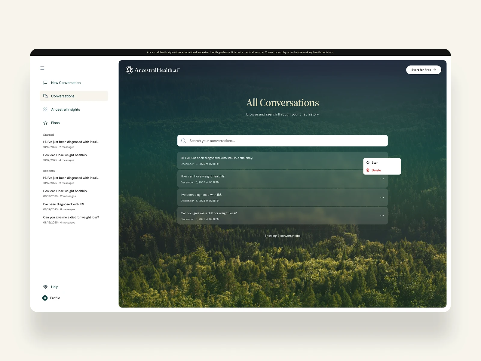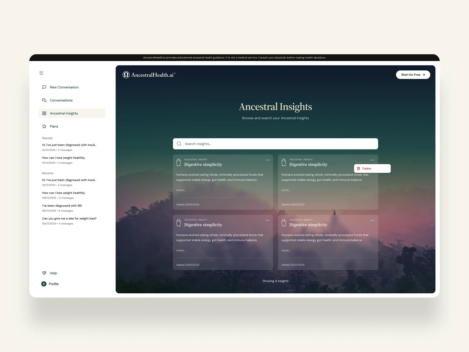 A web platform delivering natural, empathetic conversations. The AI explains ancestral health principles, offers lifestyle guidance, and encourages exploration while emphasizing safety and collaboration with healthcare providers.