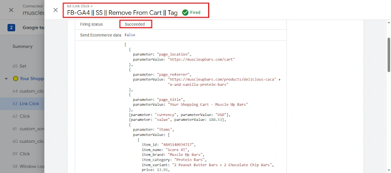 15. Successfully tested the Remove From Cart tag fired.