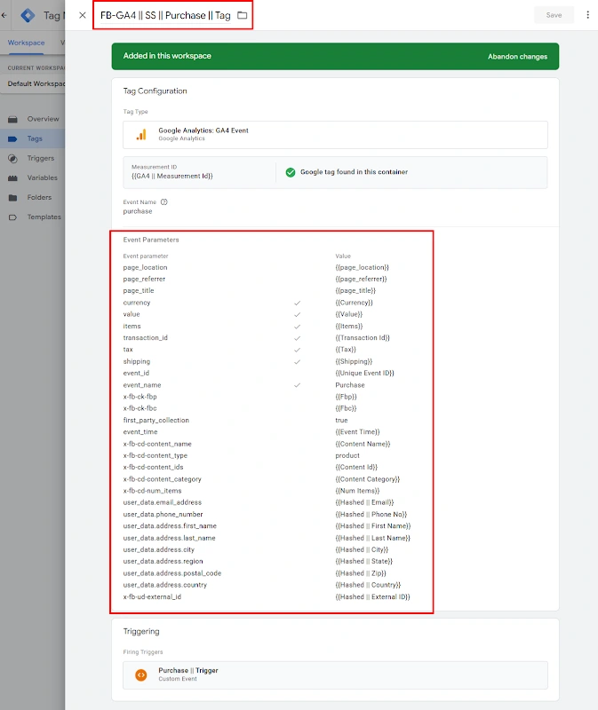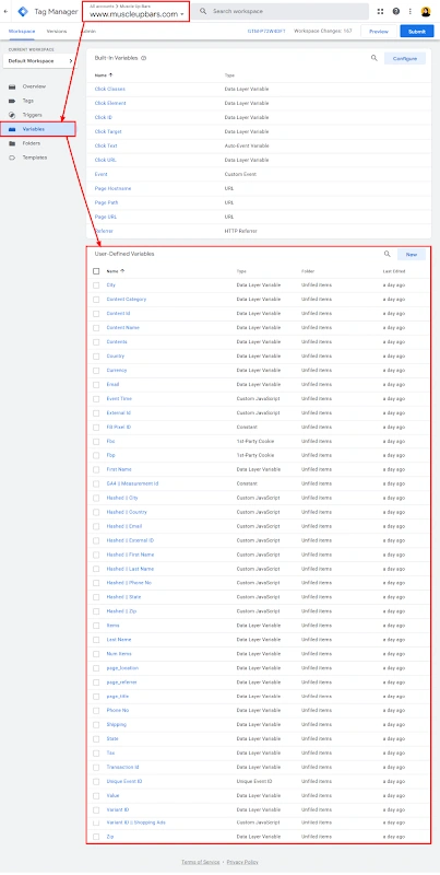 10. All required GTM variables created and user identifiers (email, phone, name, etc.) hashed to ensure privacy-compliant event forwarding.