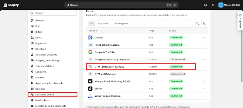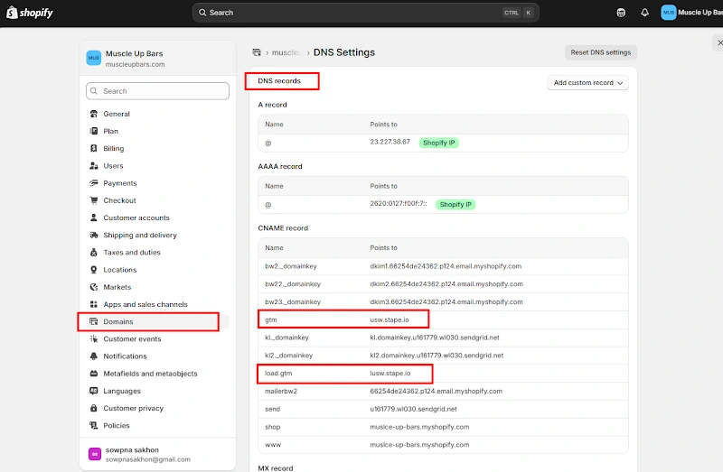 7. CNAME records for gtm and load.gtm configured in Shopify DNS to route all tracking requests through the custom server side domain for improved data reliability.