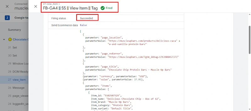 12. Successfully tested the View Item tag, confirming all product details, page data, and ecommerce parameters are firing correctly.