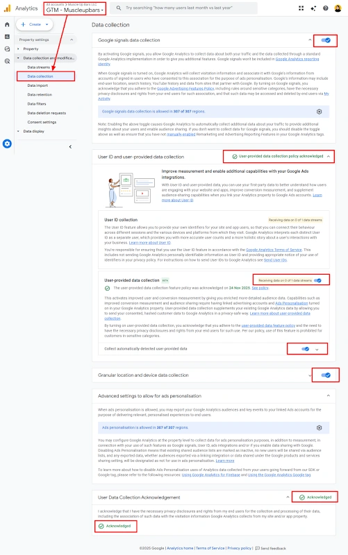 4. GA4 data collection fully optimized with Google Signals, User Provided Data, and granular location enabled, delivering more accurate insights, stronger remarketing, and improved conversion attribution.