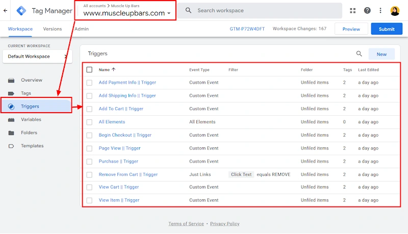 9. All required triggers have been created to fire each GA4 and Meta event accurately, ensuring every ecommerce action is captured at the right moment.