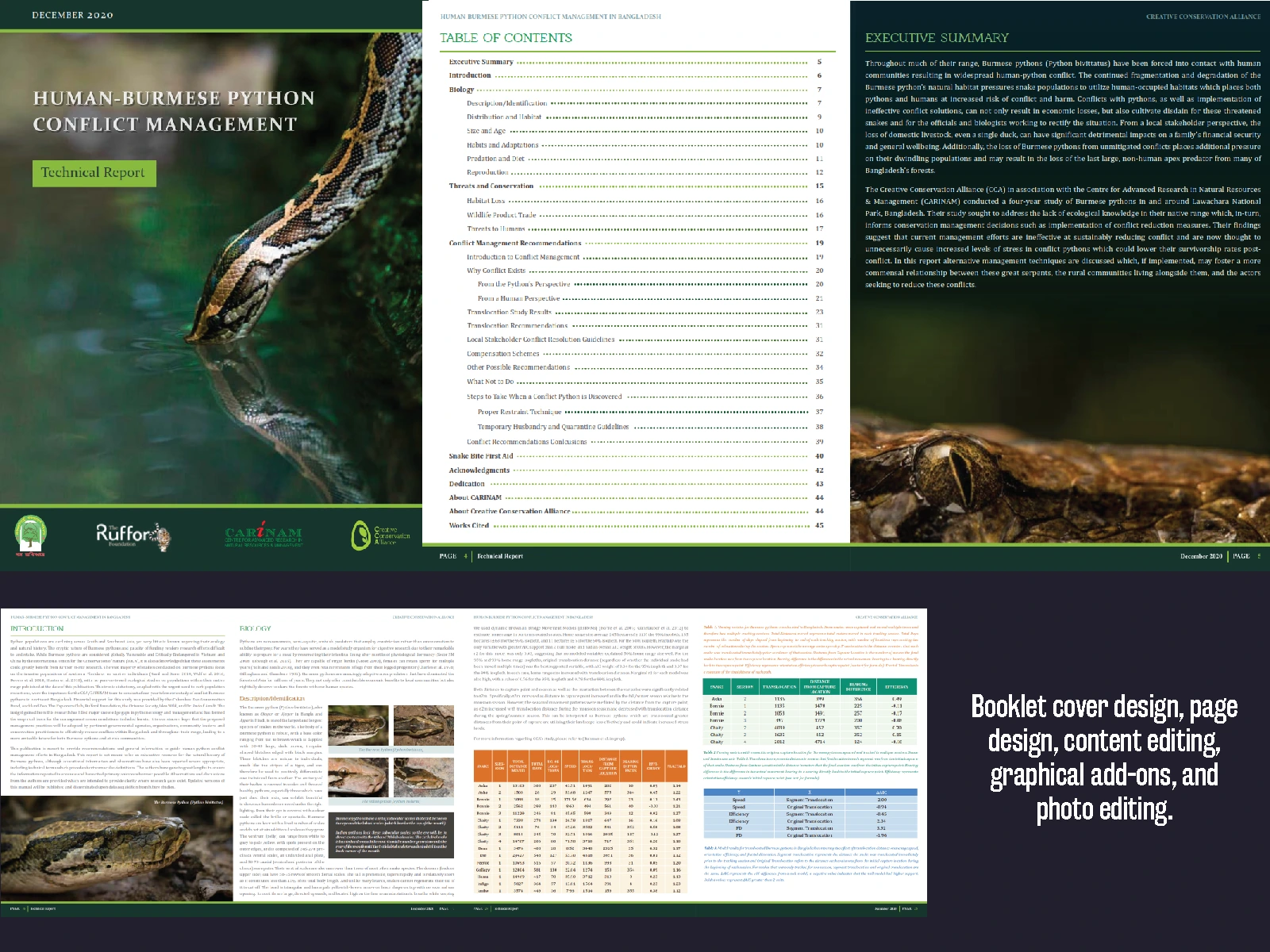 I have worked with NGOs determined to leave a positive impact in the sphere they specialize in. After viewing some of my previous booklets, brochures, and poster designs for NGOs concerned with natural resources, the client reached out to me to breathe life into his Technical Report booklet. This report encompasses his research and efforts in managing human-python conflicts in Bangladesh. The booklet is to be used by select members involved in potentially life-threatening situations. The cause alone made the project a welcome challenge.