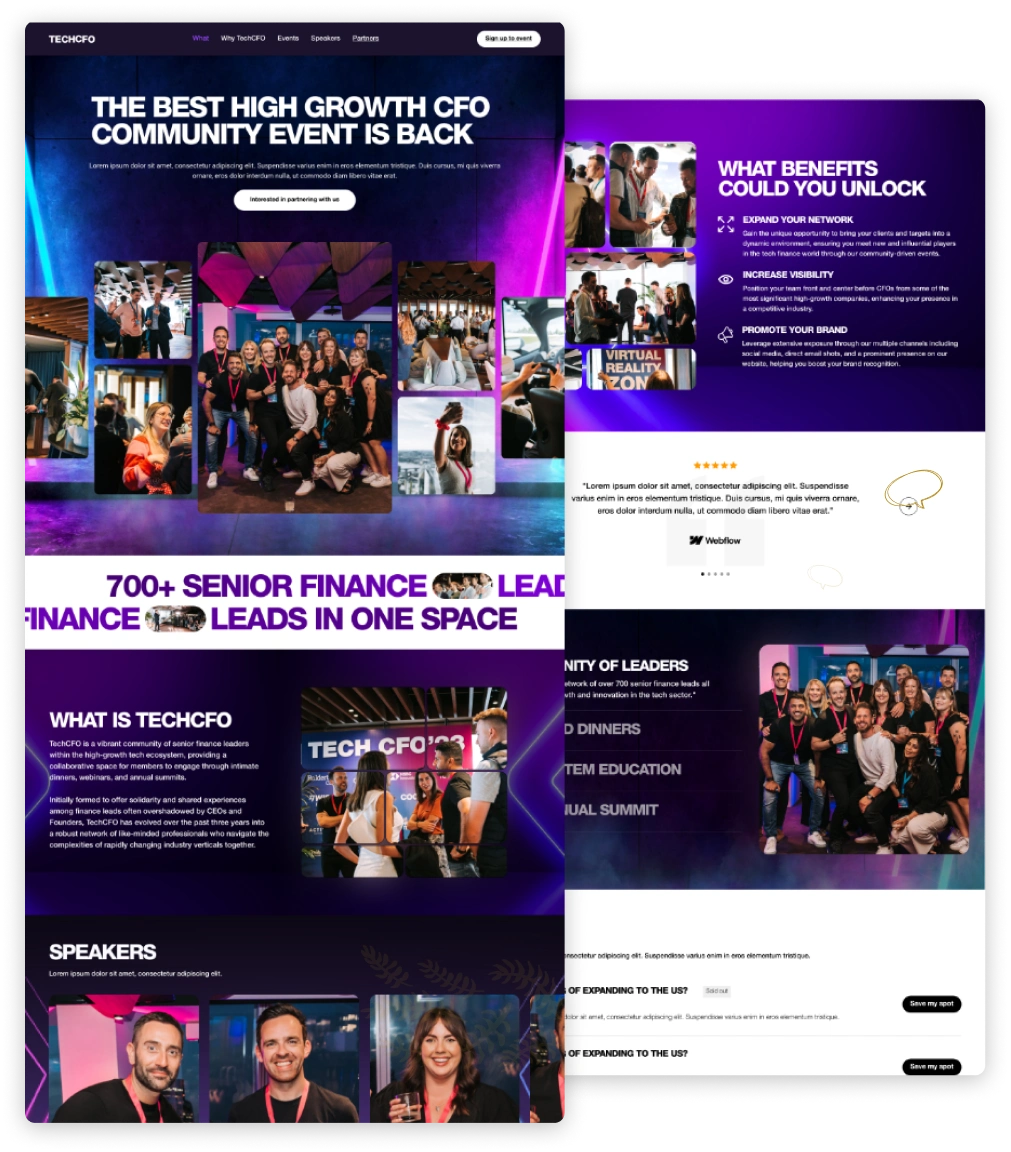 In collaboration with Cooper Parry, we developed a comprehensive website for Tech CFO, a vibrant community for senior finance leaders in the high-growth tech ecosystem.This project involved meticulous design and development using Webflow, alongside thorough content curation to ensure the platform effectively showcases Tech CFO's events, resources, and community engagement.