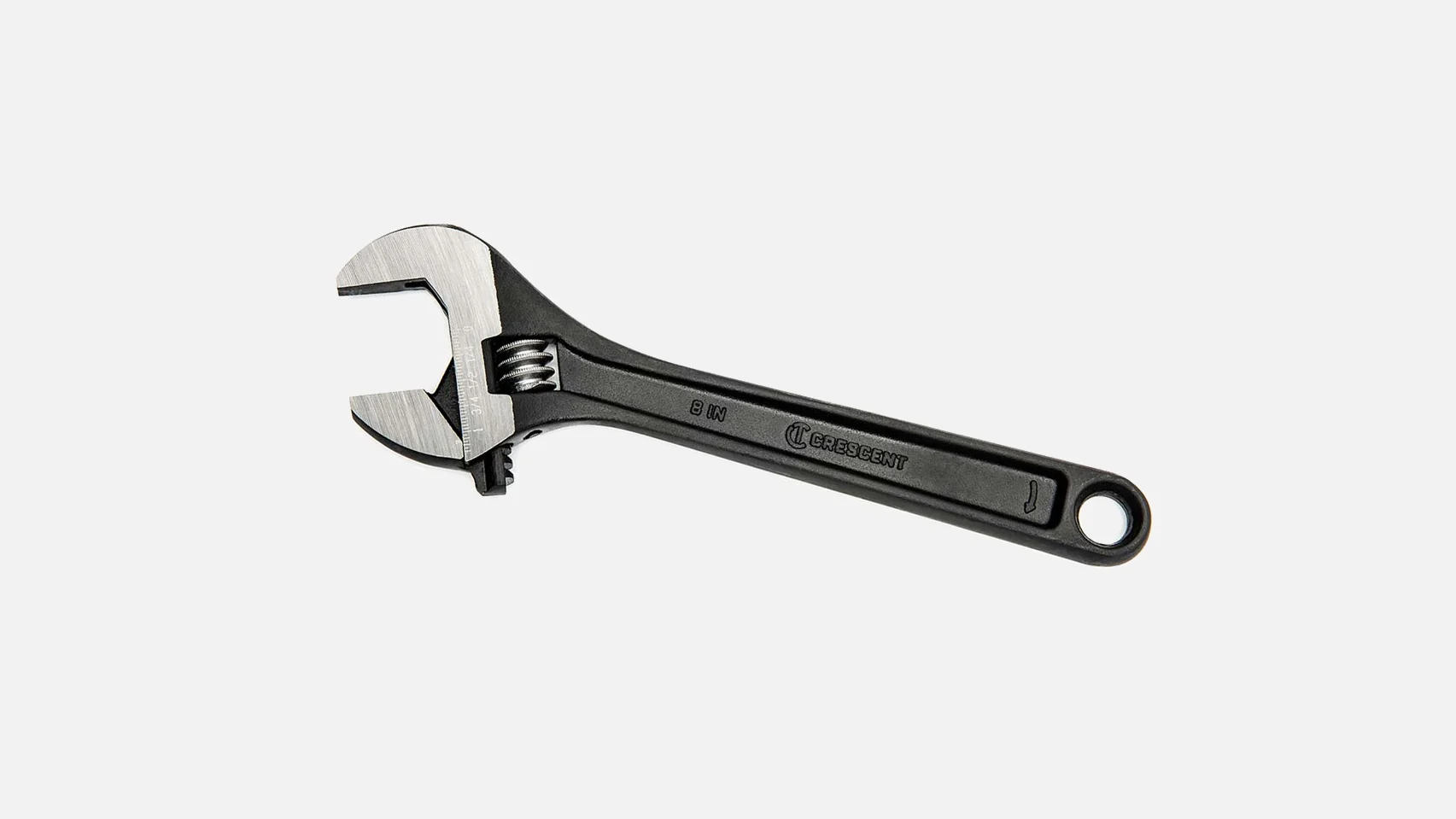 Versatile open-ended wrench with an adjusting screw to fit a wide range of nuts and bolts. The movable jaw is controlled by a toothed bar system, allowing quick size changes. For safe use, always pull—never push—so force remaines on the fixed jaw. Commonly known as a Crescent® wrench.