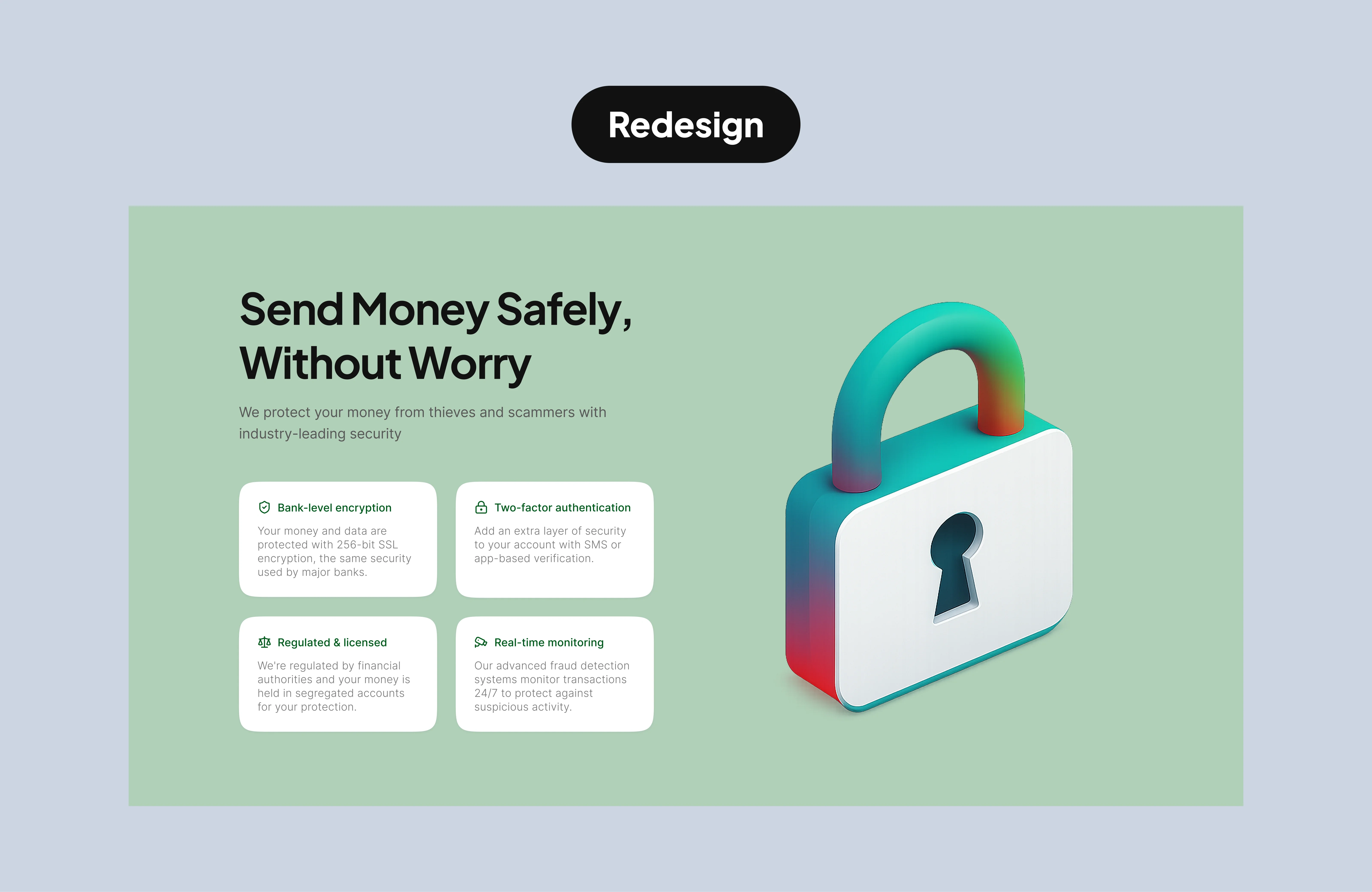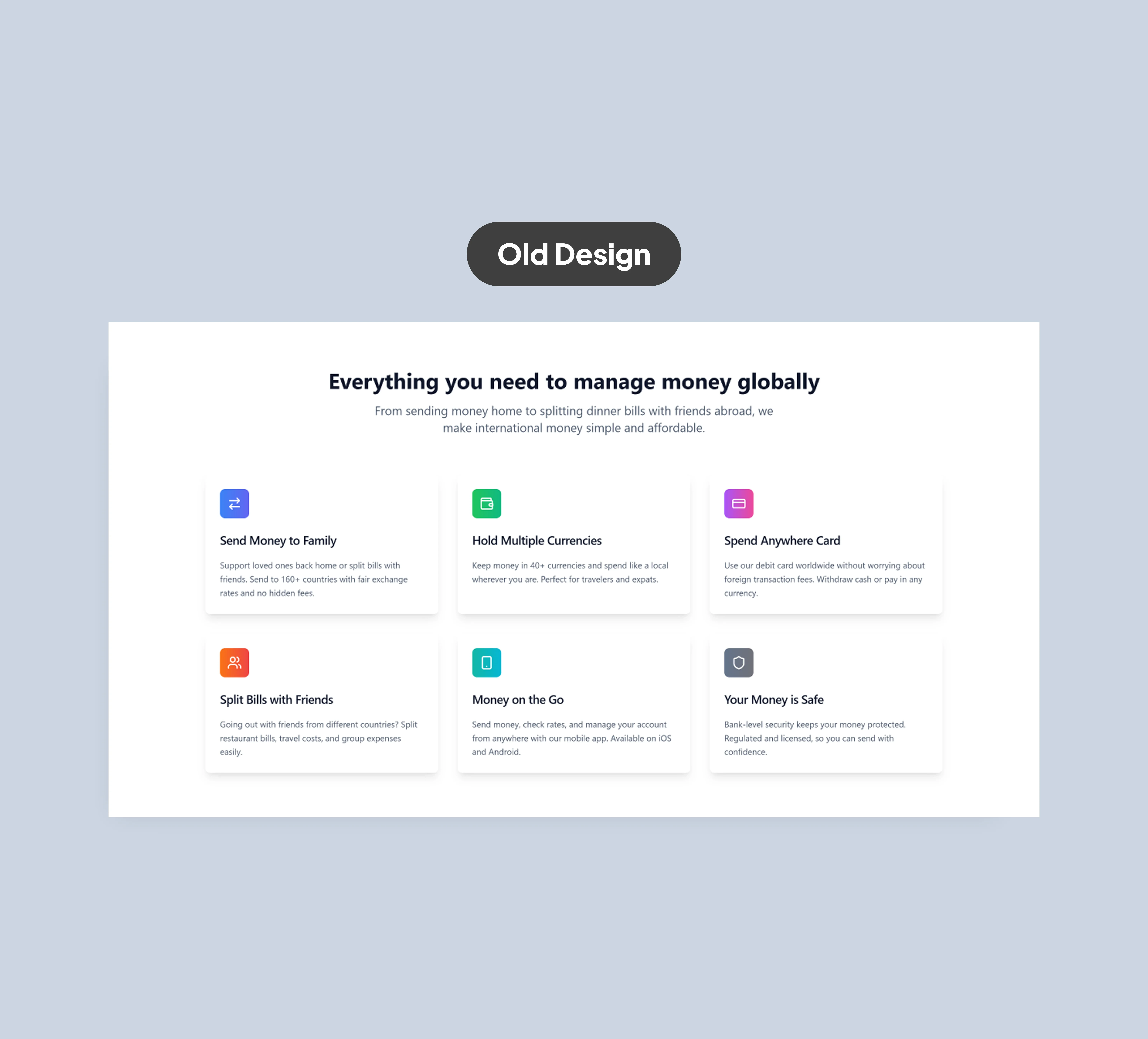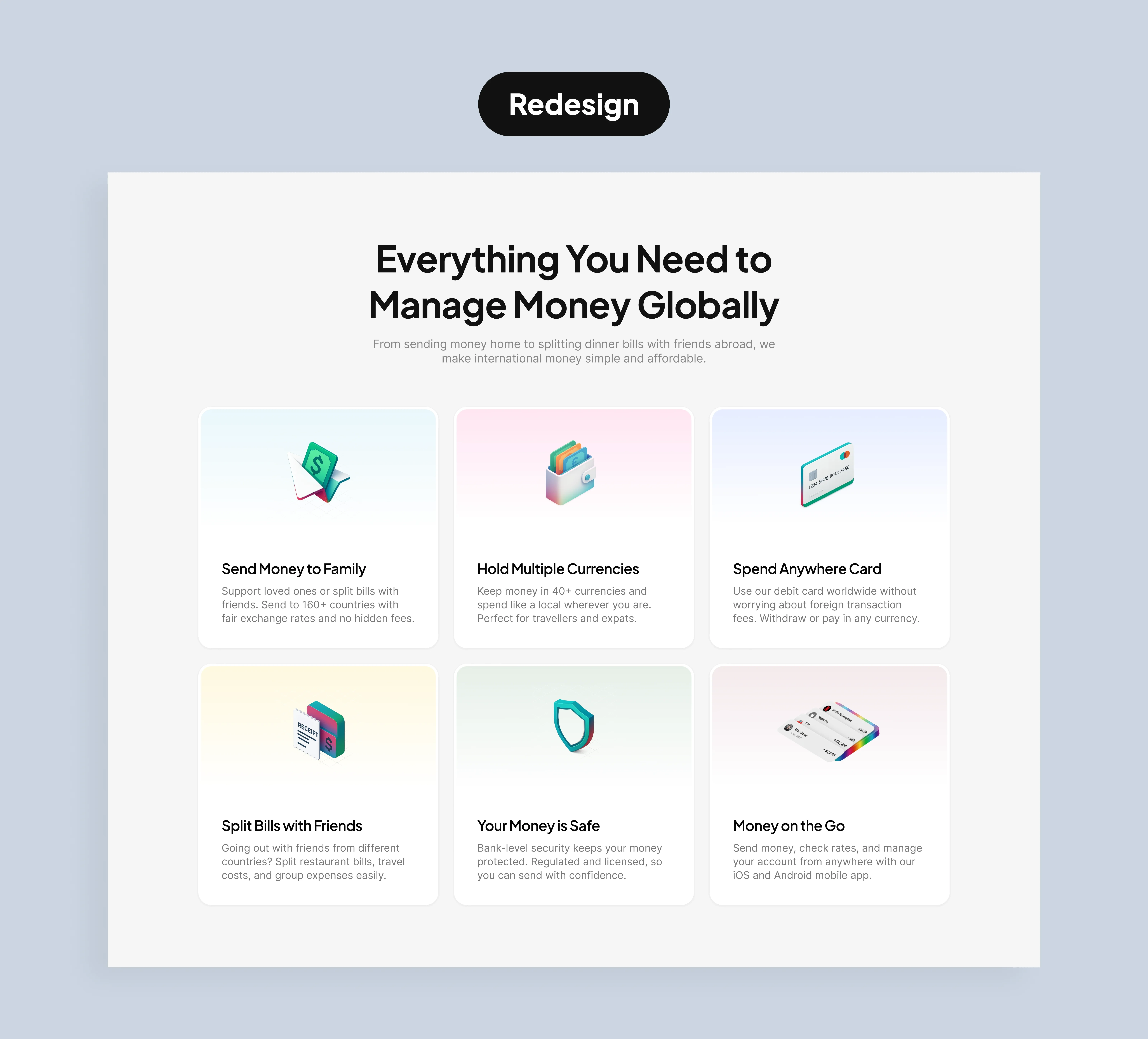 By moving from gradients and clutter to focused hierarchy and lifestyle imagery, the homepage aligns better with industry leaders like Wise, Revolut, and Remitly, who leverage clean design to communicate both trust and modernity.