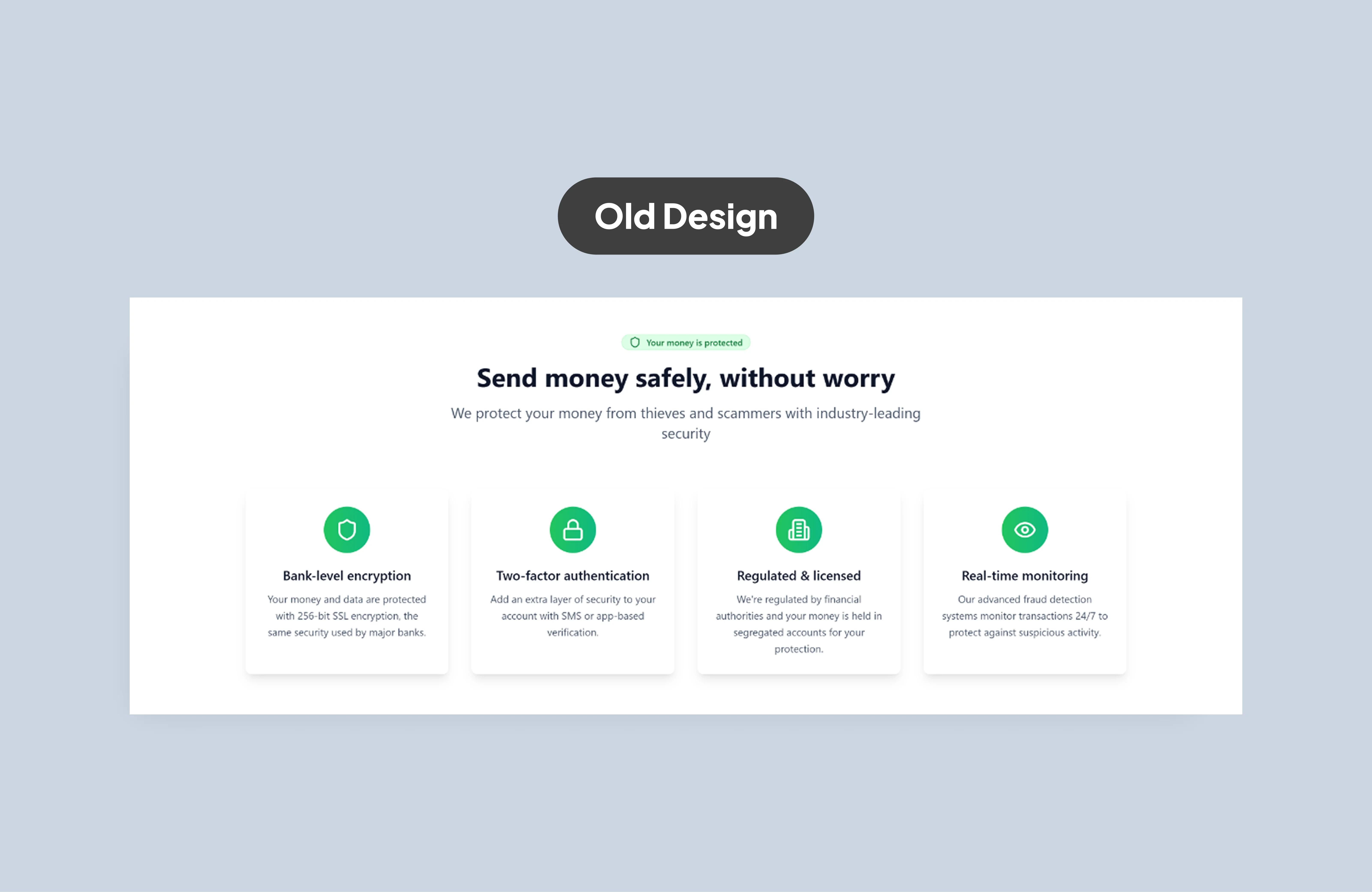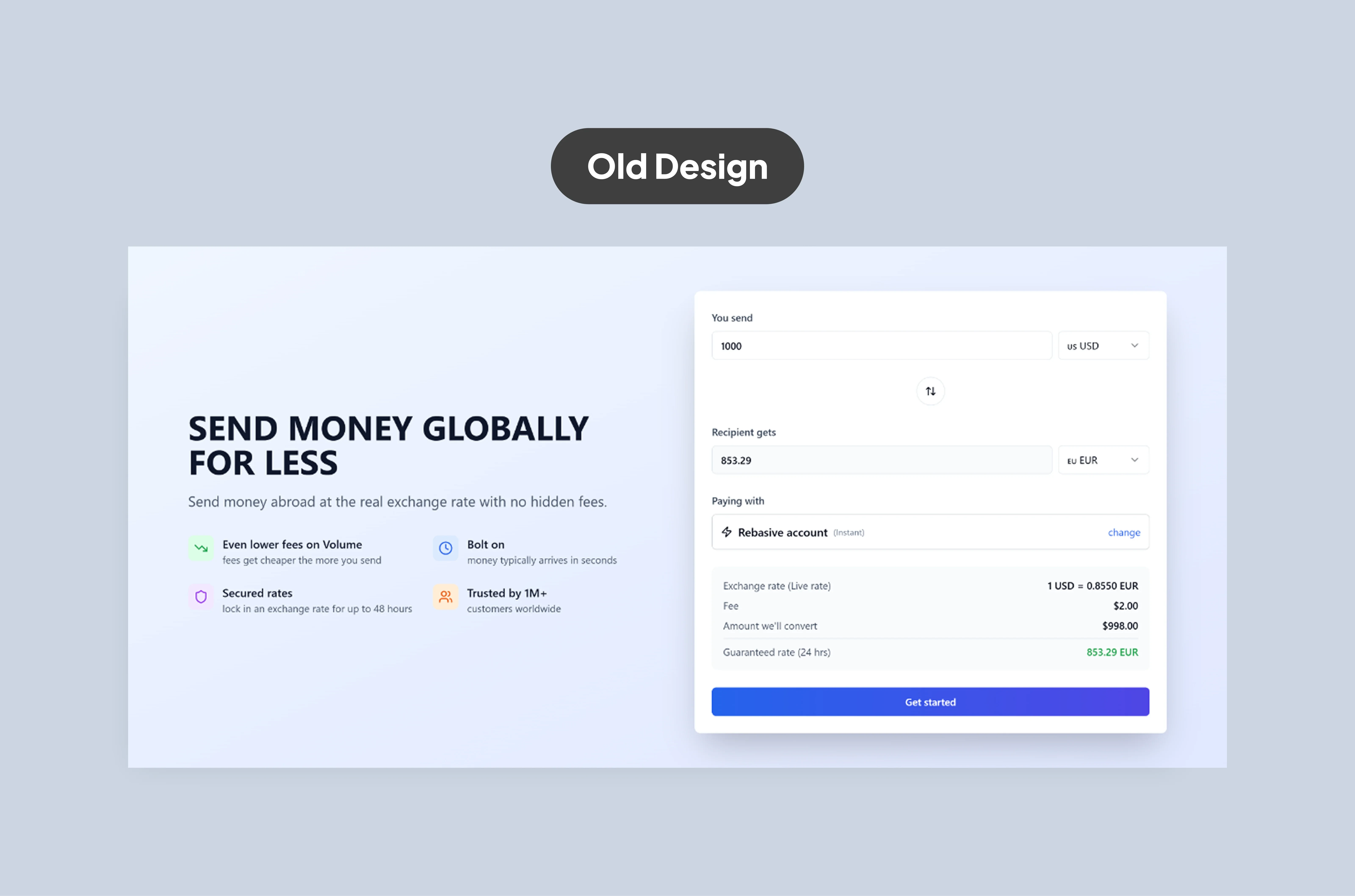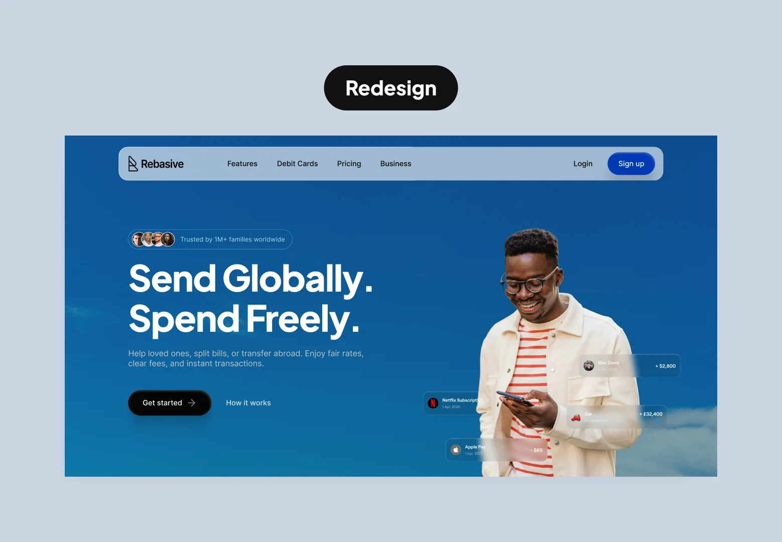 By moving from gradients and clutter to focused hierarchy and lifestyle imagery, the homepage aligns better with industry leaders like Wise, Revolut, and Remitly, who leverage clean design to communicate both trust and modernity.