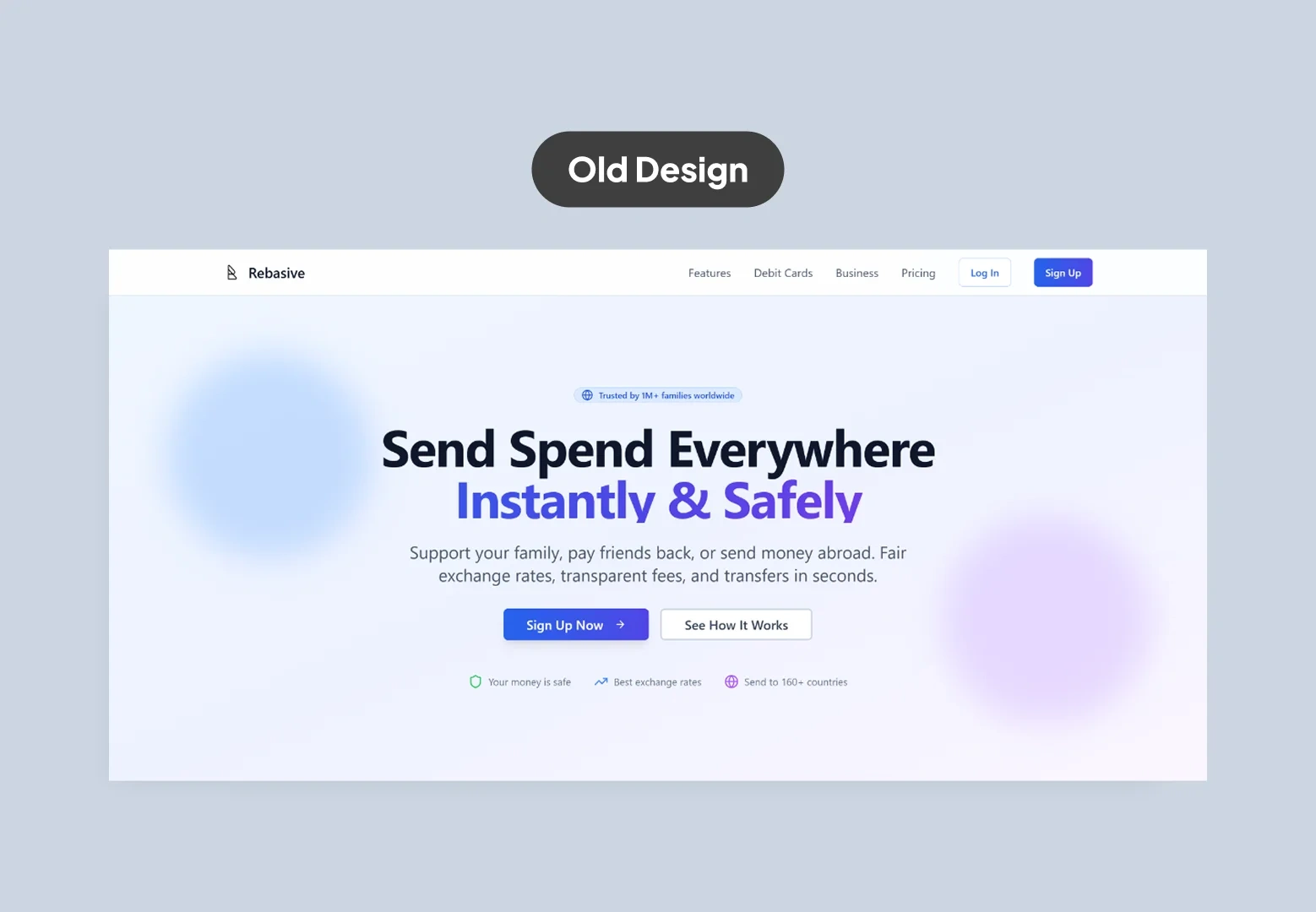A gradient background with bold but cluttered headline text. The promise "Send Spend Everywhere Instantly and Safely" felt rushed and somewhat generic.