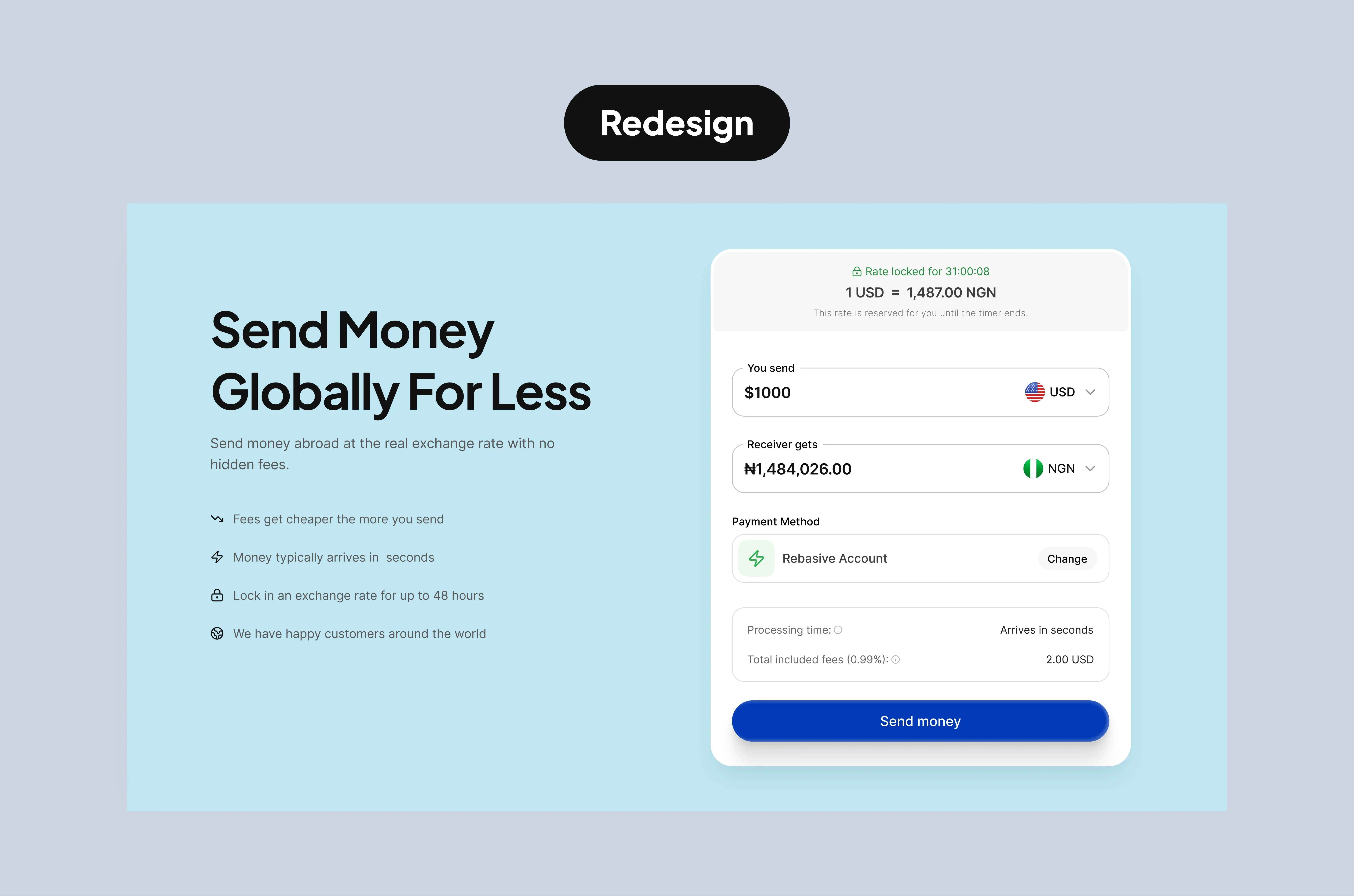 The calculator is visually lifted with more whitespace and prominence. Currency values are clear, fees are transparent, and the CTA "Send money" is emphasized.