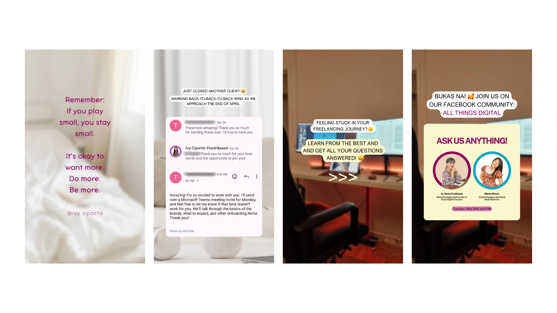 Digitally Ivy is a personal brand of Ivy, the founder of Reach Digital Solutions. Through her platforms, she shares insights on social media marketing, freelancing, and digital business while promoting her agency’s services. Her content aims to educate aspiring freelancers and entrepreneurs while building a strong personal brand that connects with potential clients and collaborators.