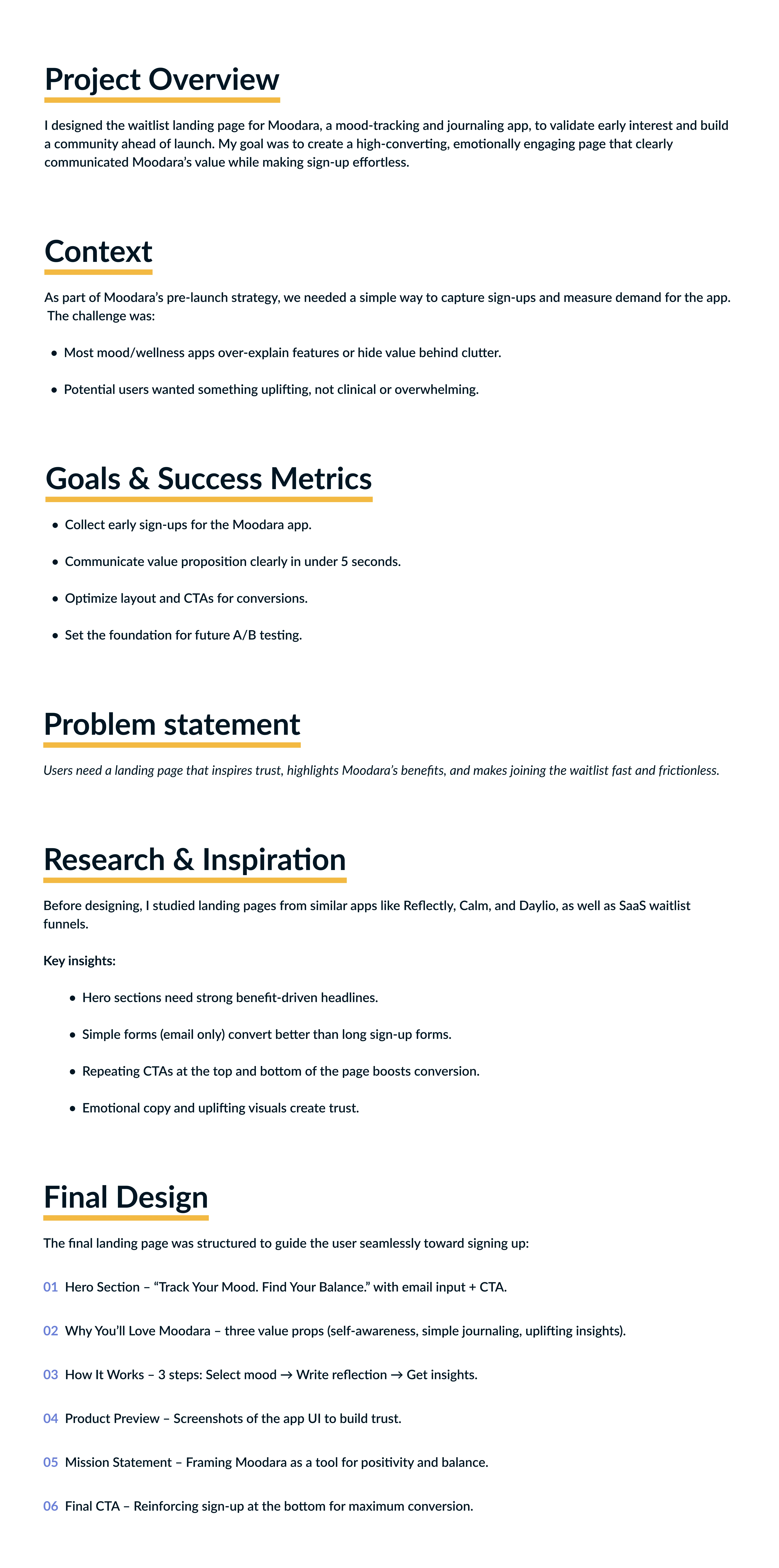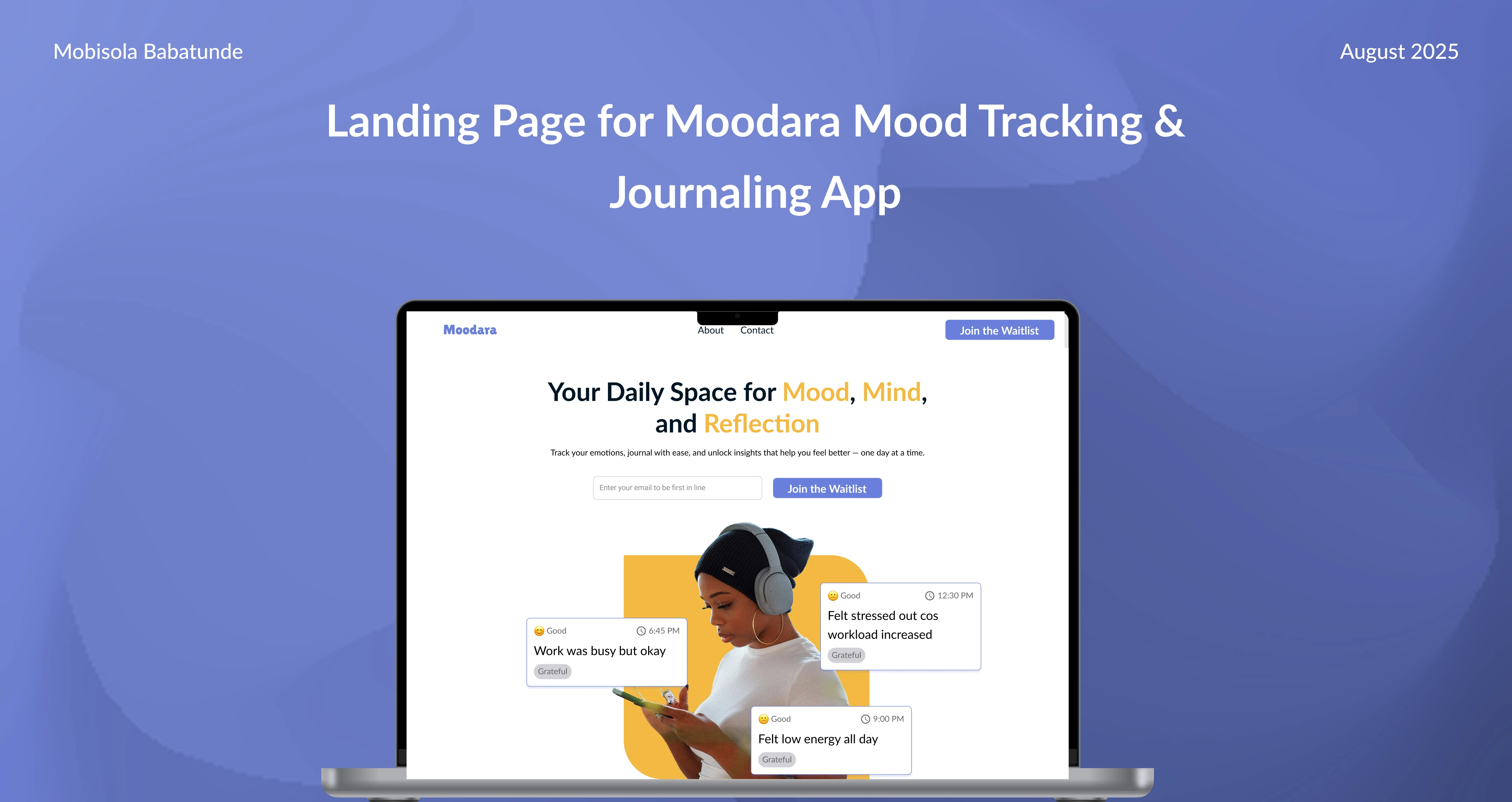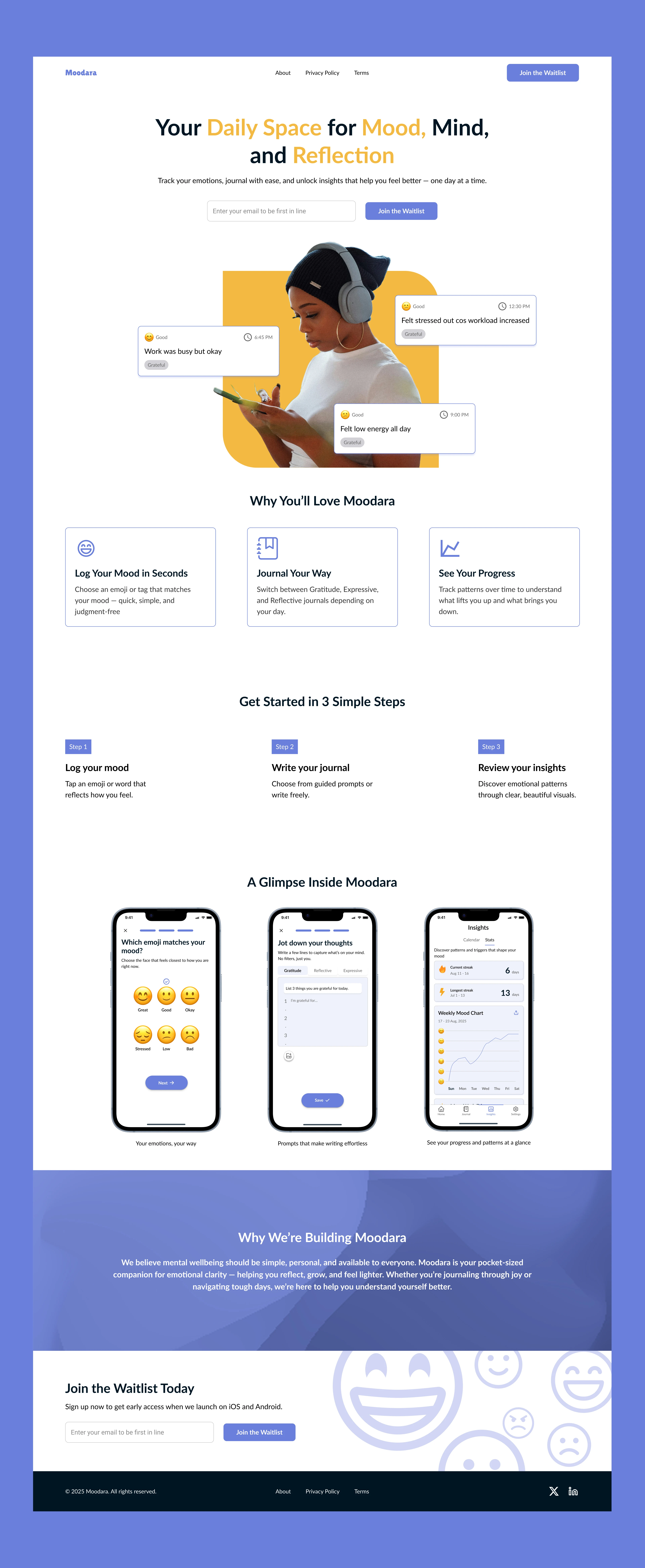 The waitlist page was designed to validate early interest and build a community ahead of the Moodara app's launch.
