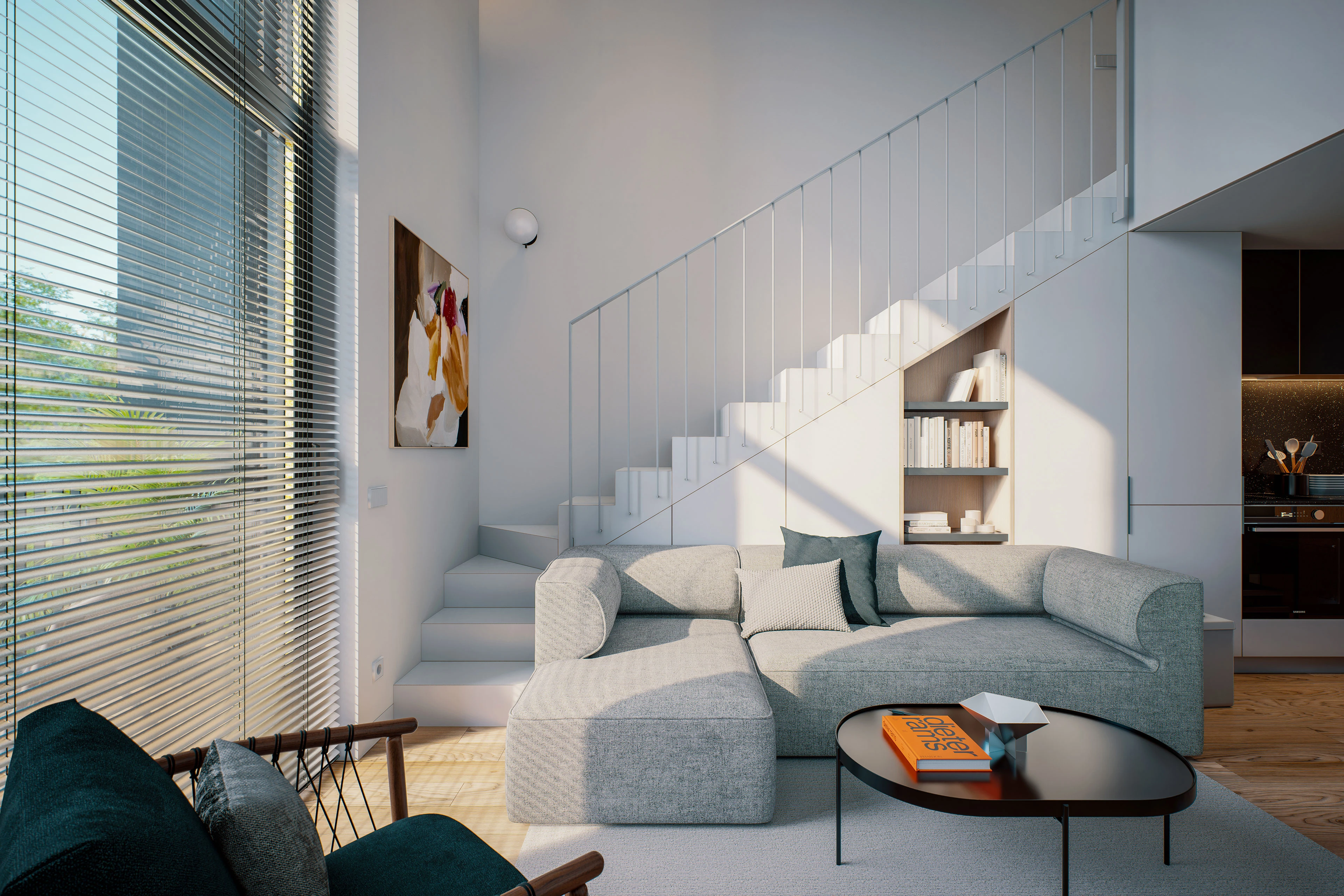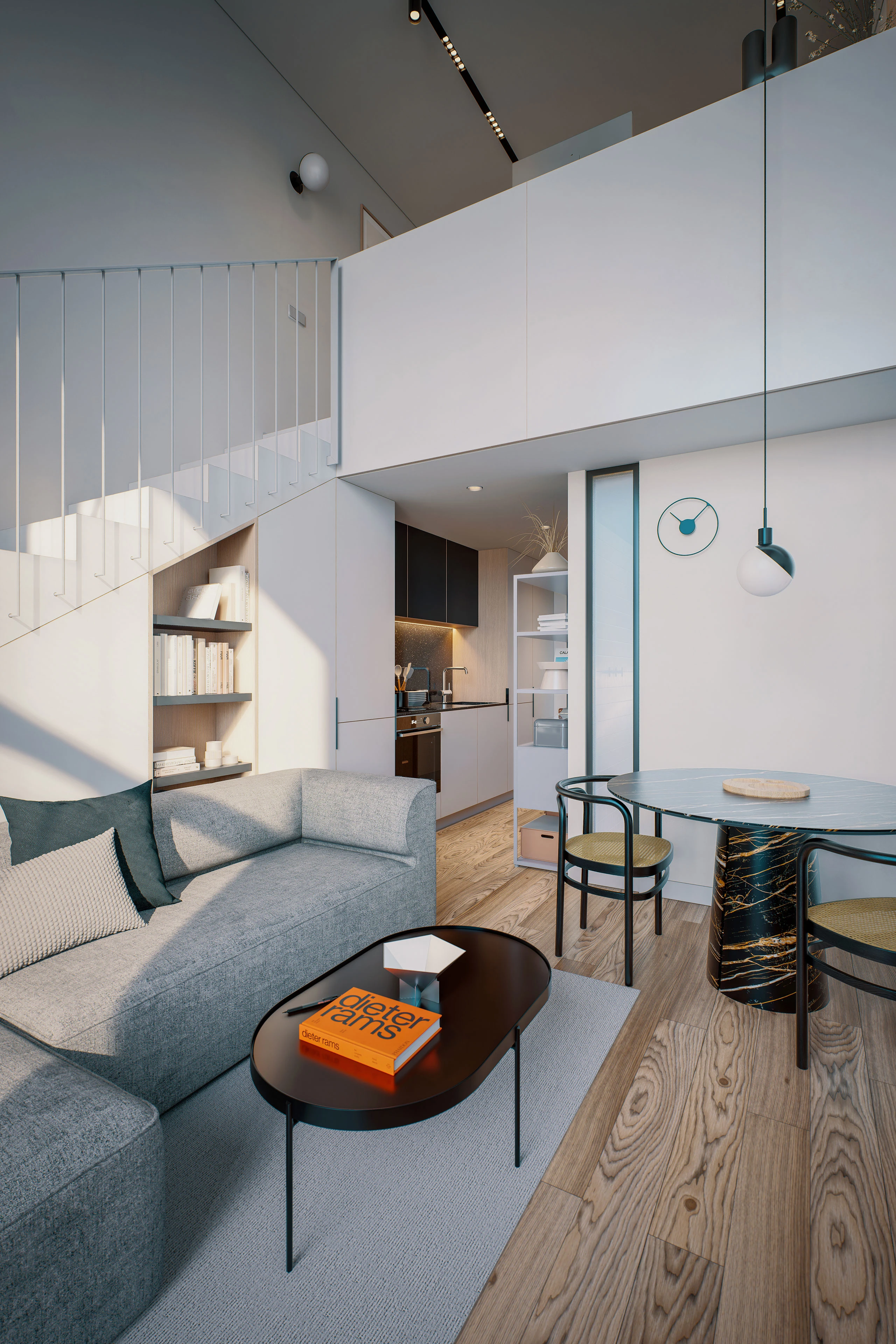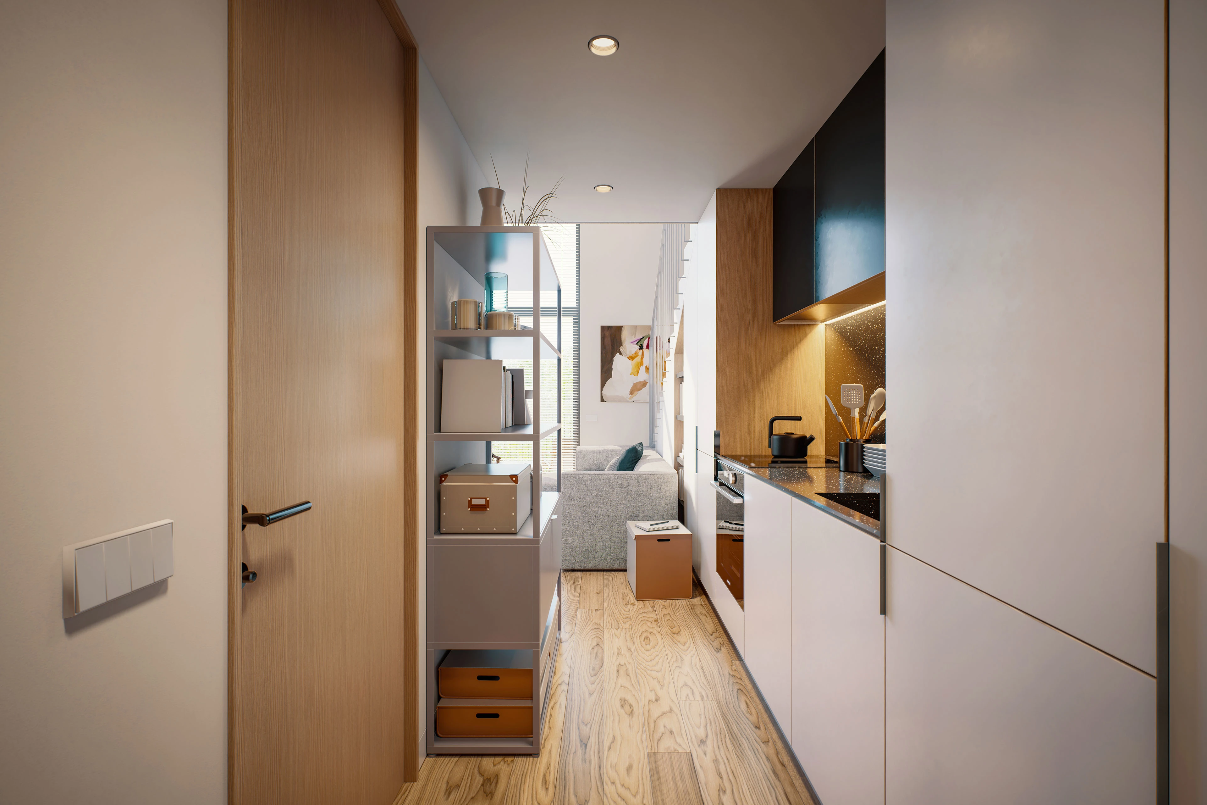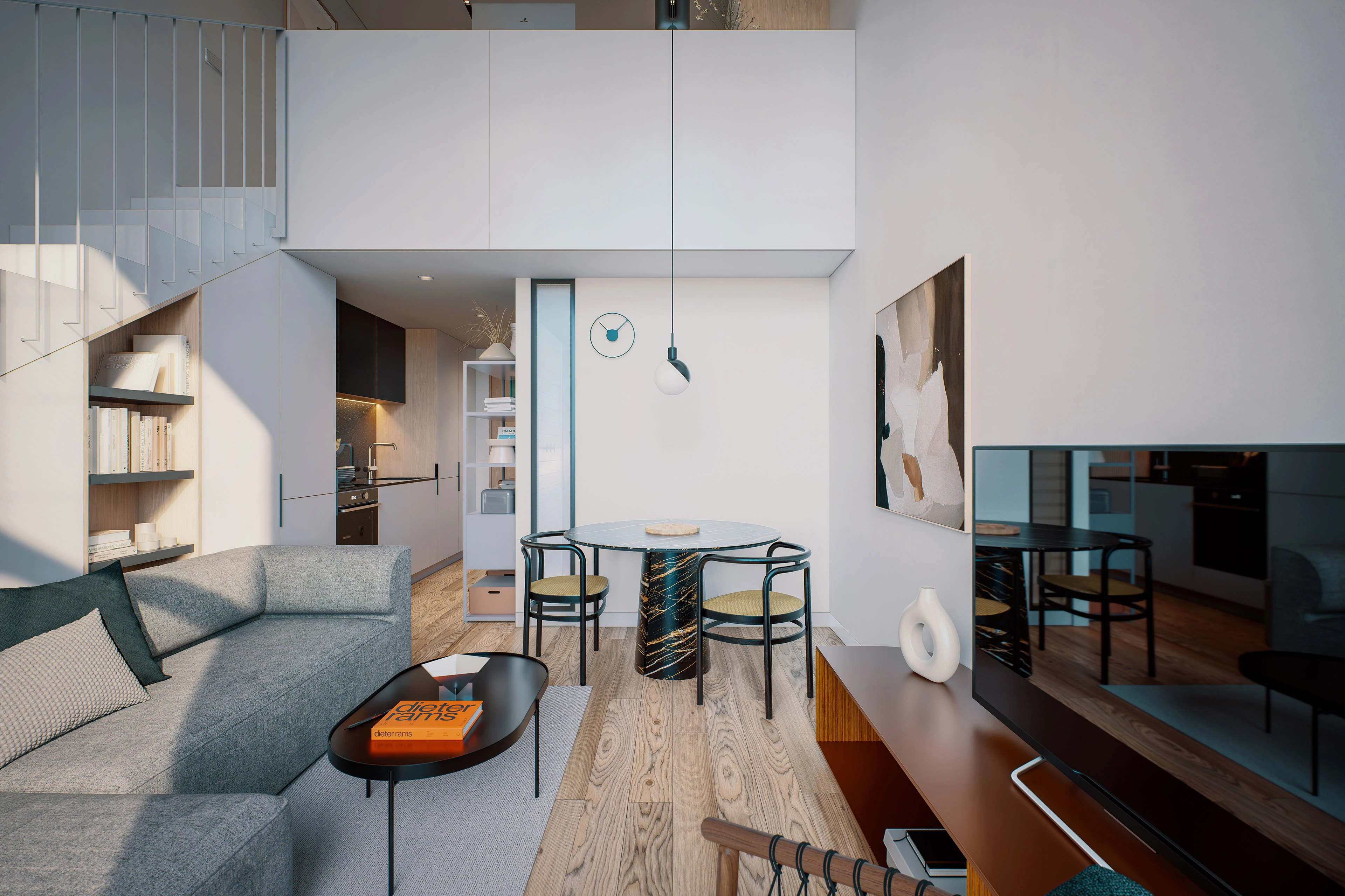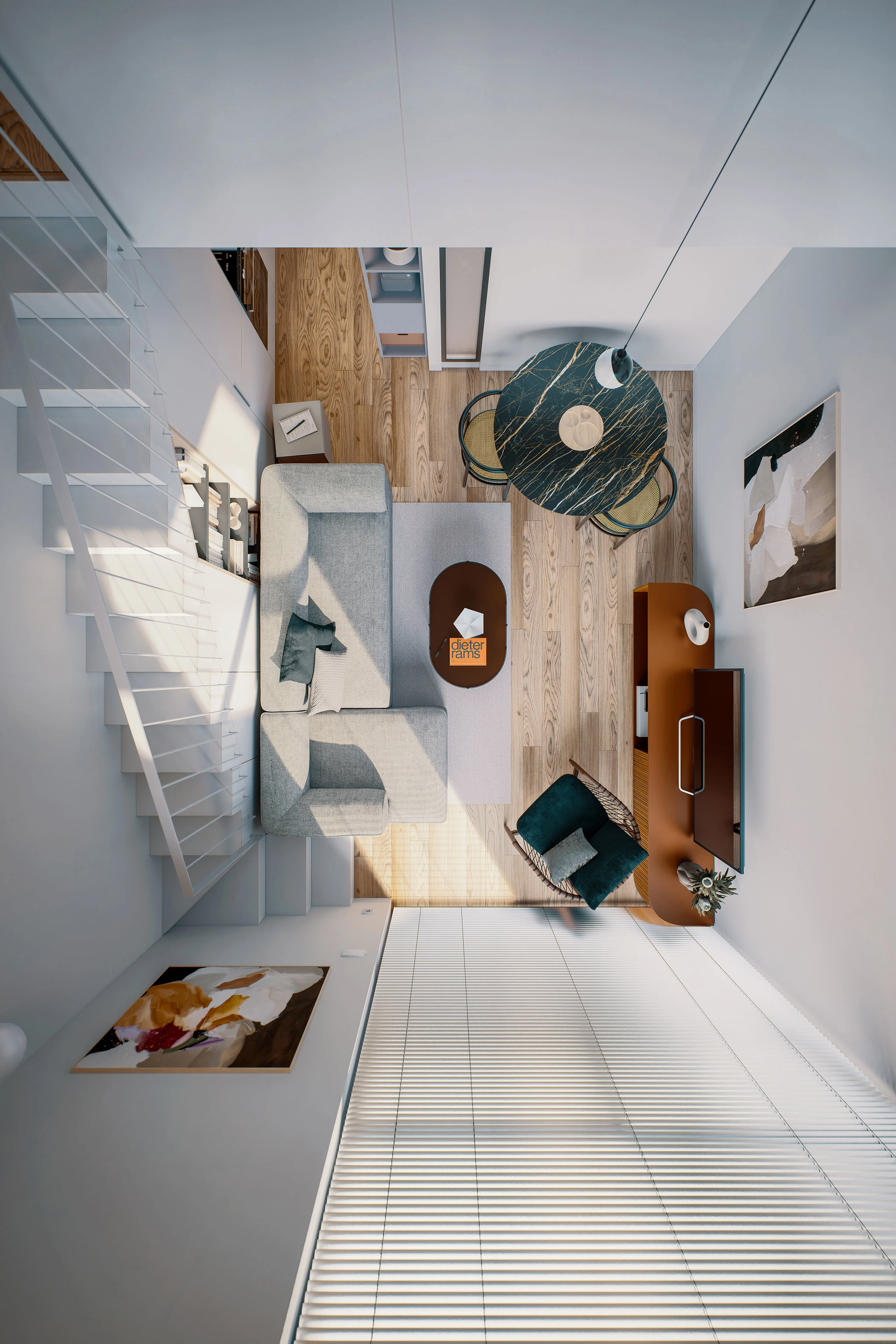 Compact living redefined: circulation, storage, and kitchen merge in one fluid gesture, creating an open, efficient, and warm minimal living space.