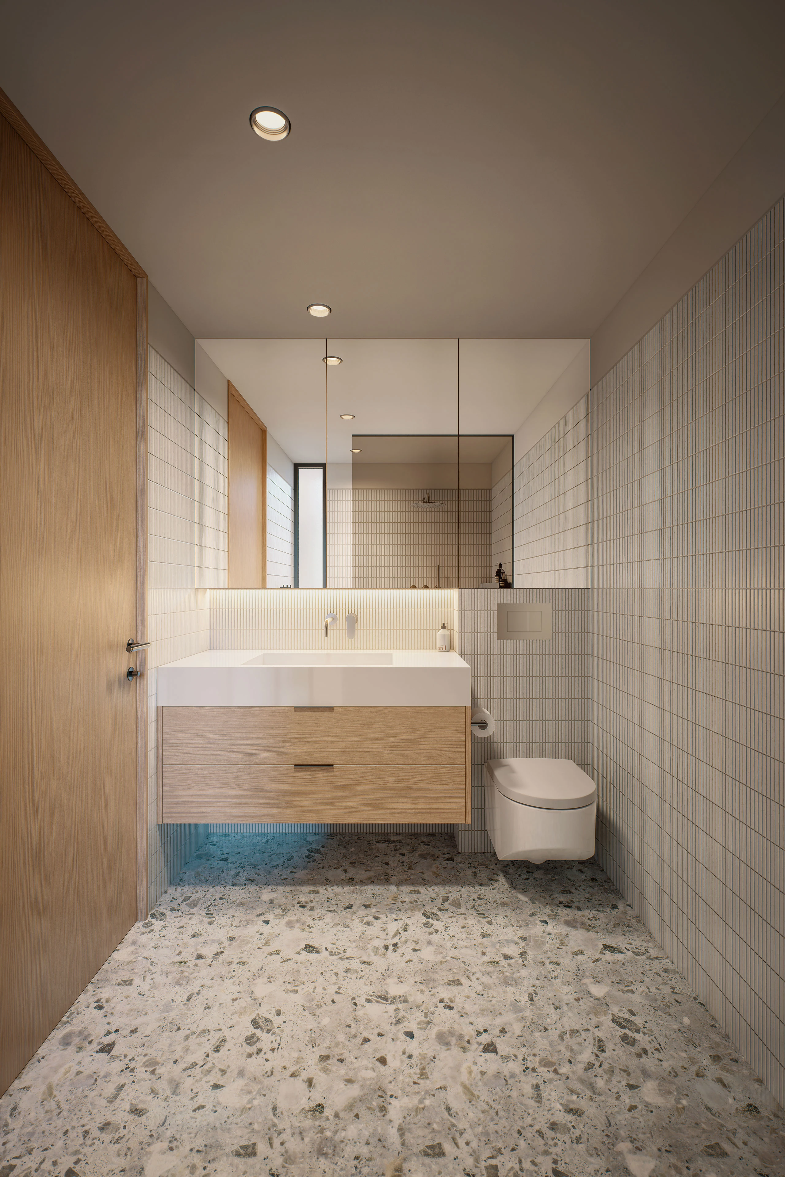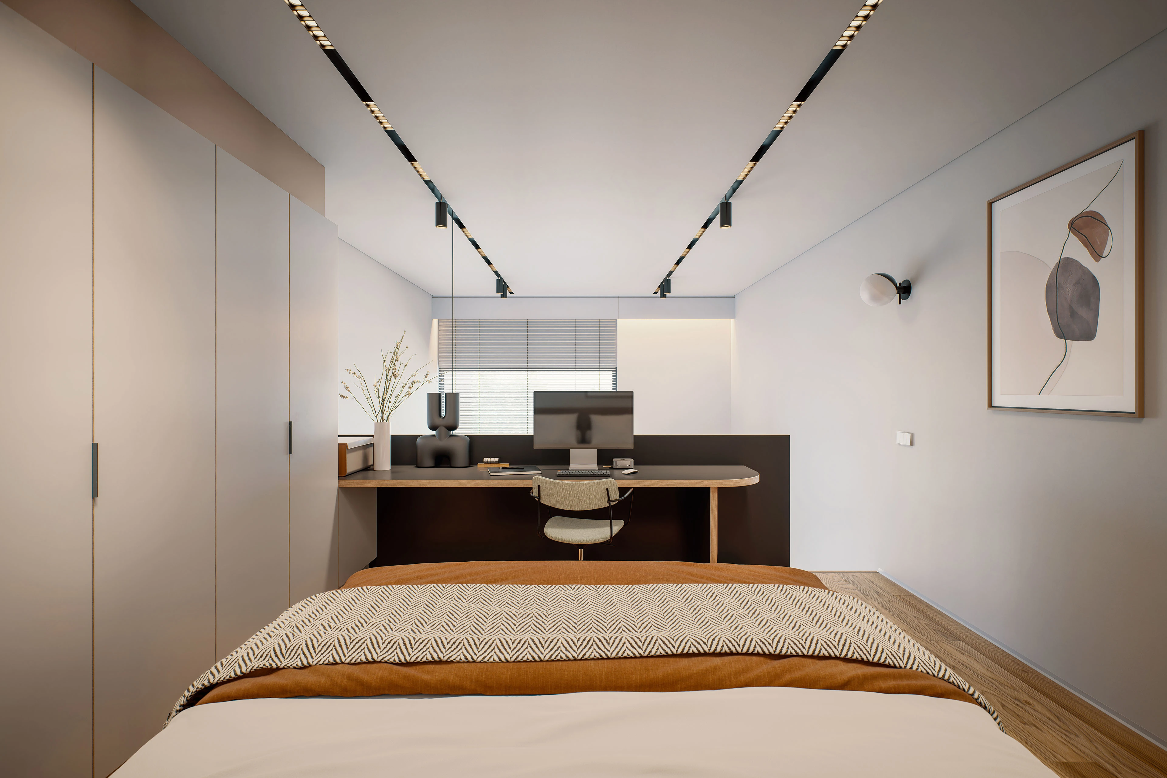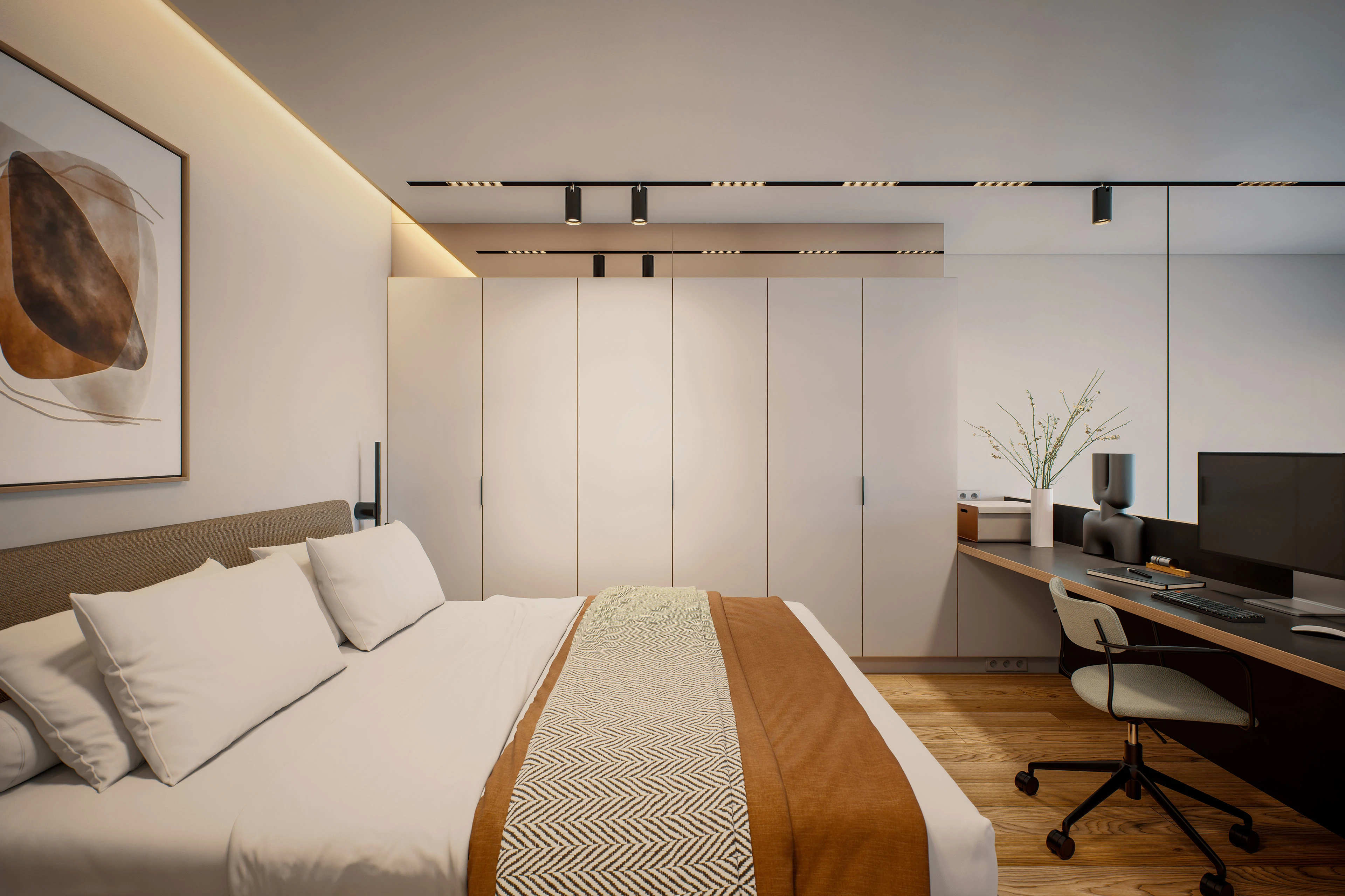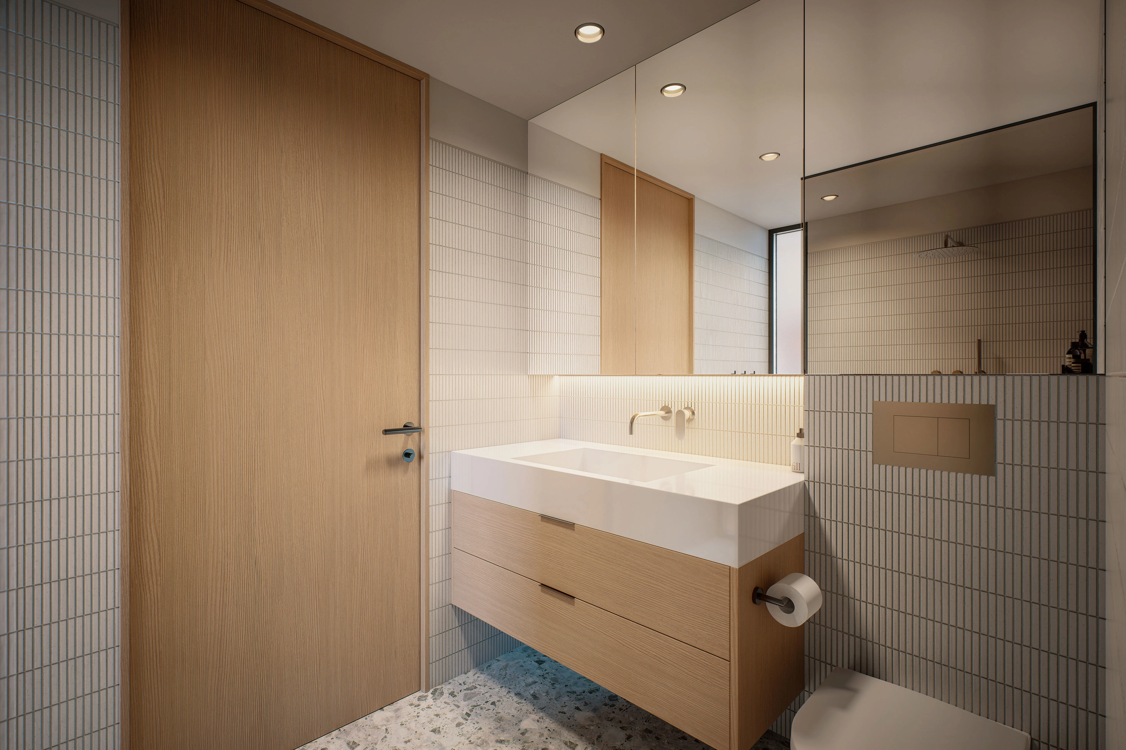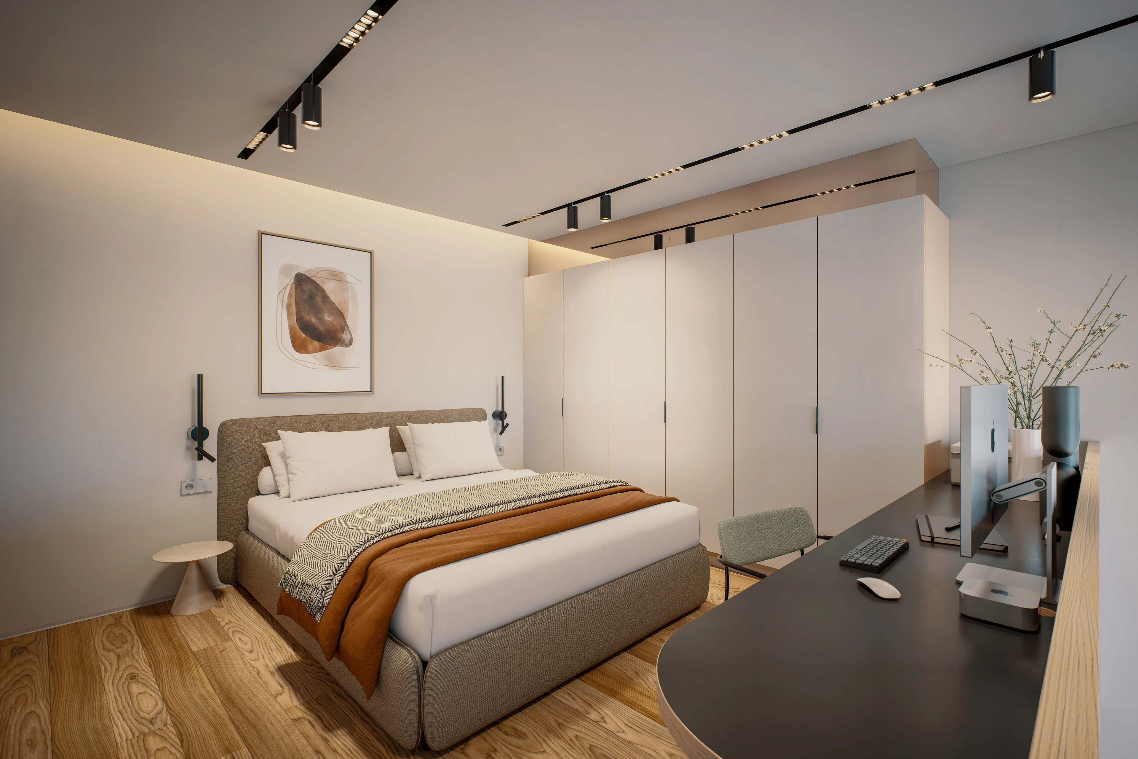 Compact living redefined: circulation, storage, and kitchen merge in one fluid gesture, creating an open, efficient, and warm minimal living space.