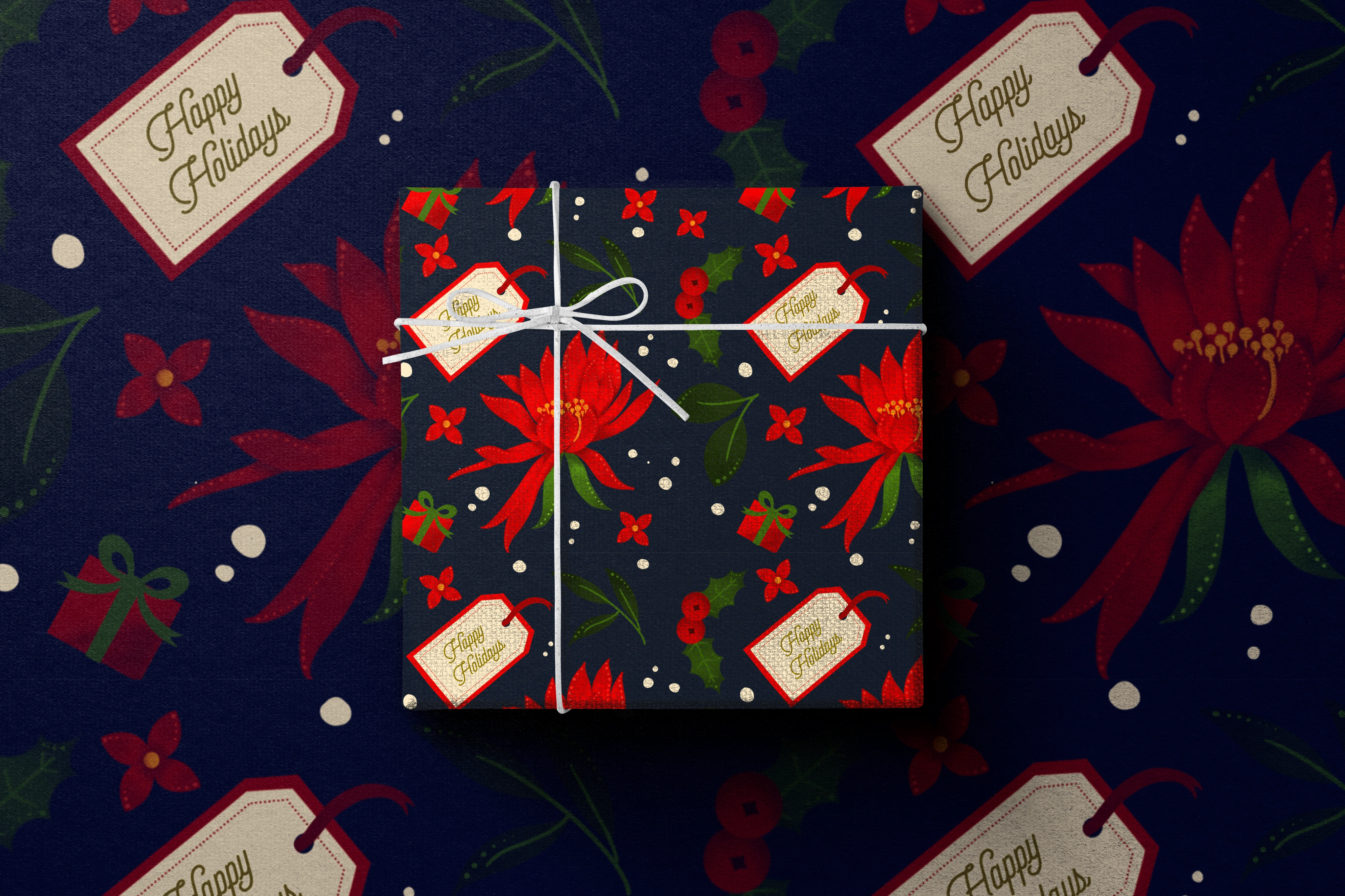 A custom wrapping paper designed and illustrated for the 2023 holiday season