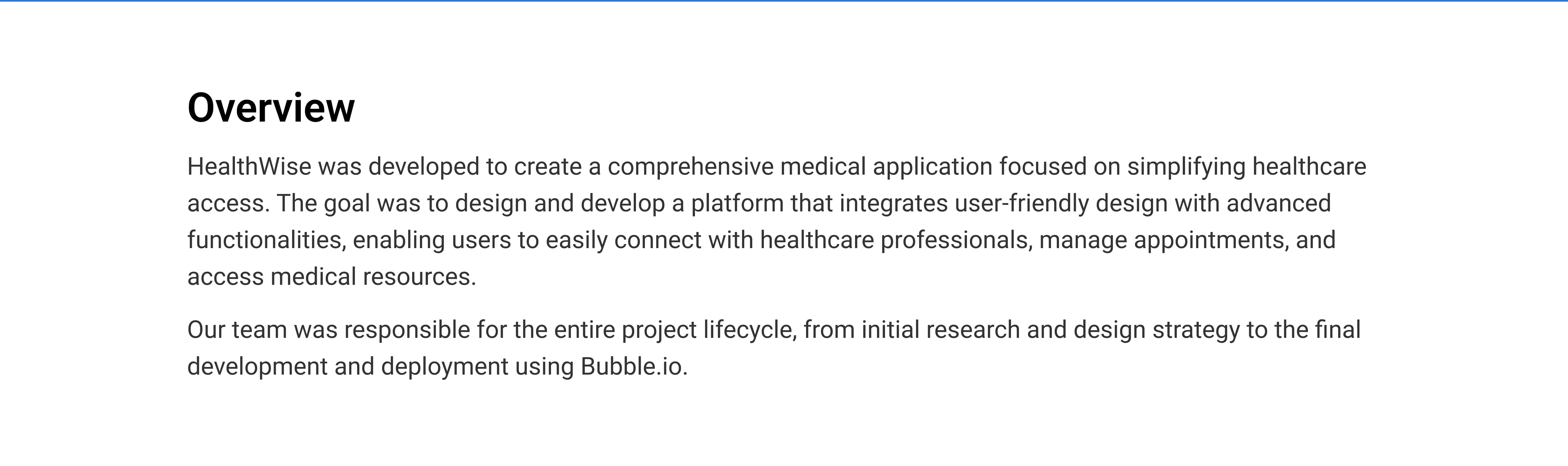 HealthWise was developed to create a comprehensive medical application focused on simplifying healthcare access. The goal was to design and develop a platform that integrates user-friendly design with advanced functionalities, enabling users to easily connect with healthcare professionals, manage appointments, and access medical resources. Our team was responsible for the entire project lifecycle, from initial research and design strategy to the final development and deployment using