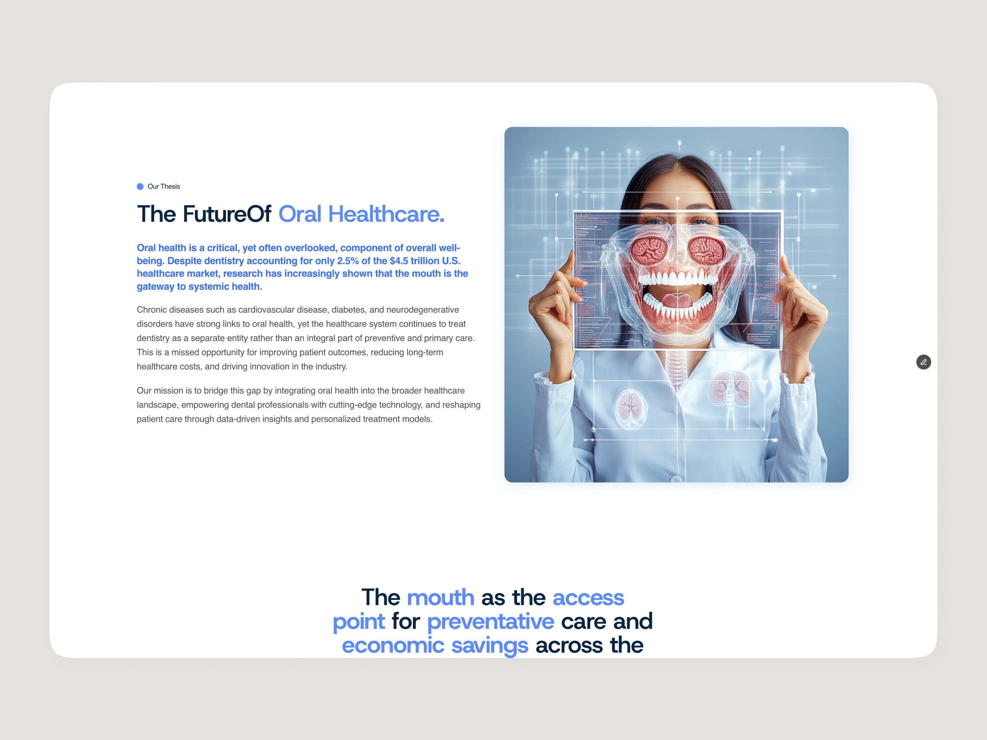 I designed and developed a fully custom website for futureofdentistry.ai, a forward-thinking company redefining the future of dental care through artificial intelligence. The goal was to craft an immersive, high-performing digital experience that reflects their innovative mission and communicates the sophistication of their technology.
