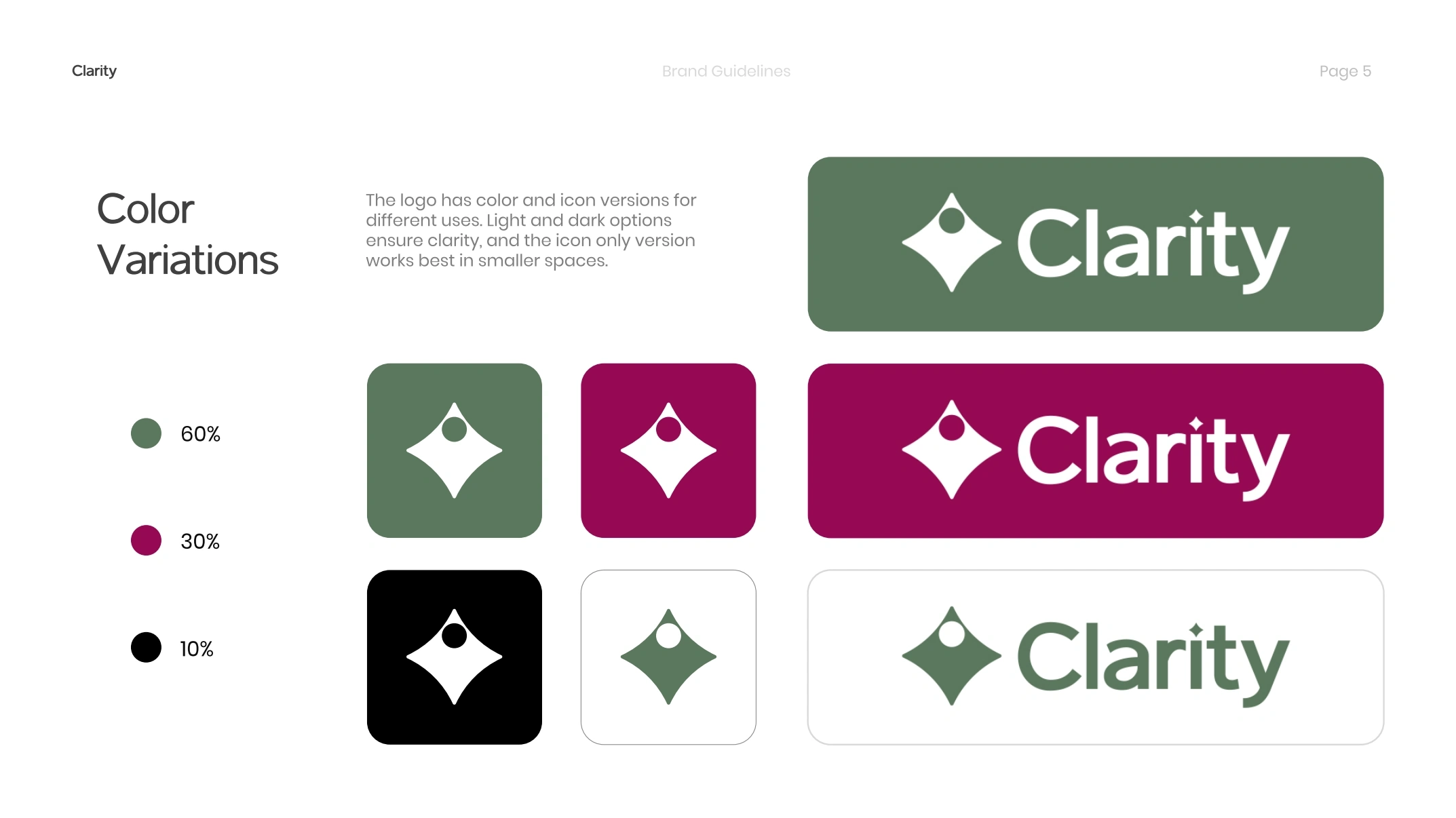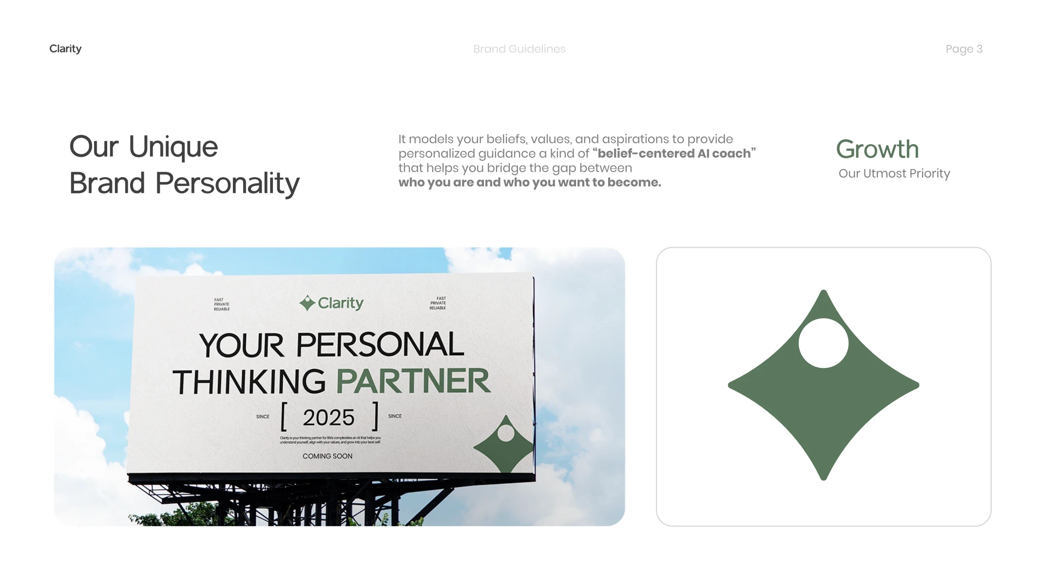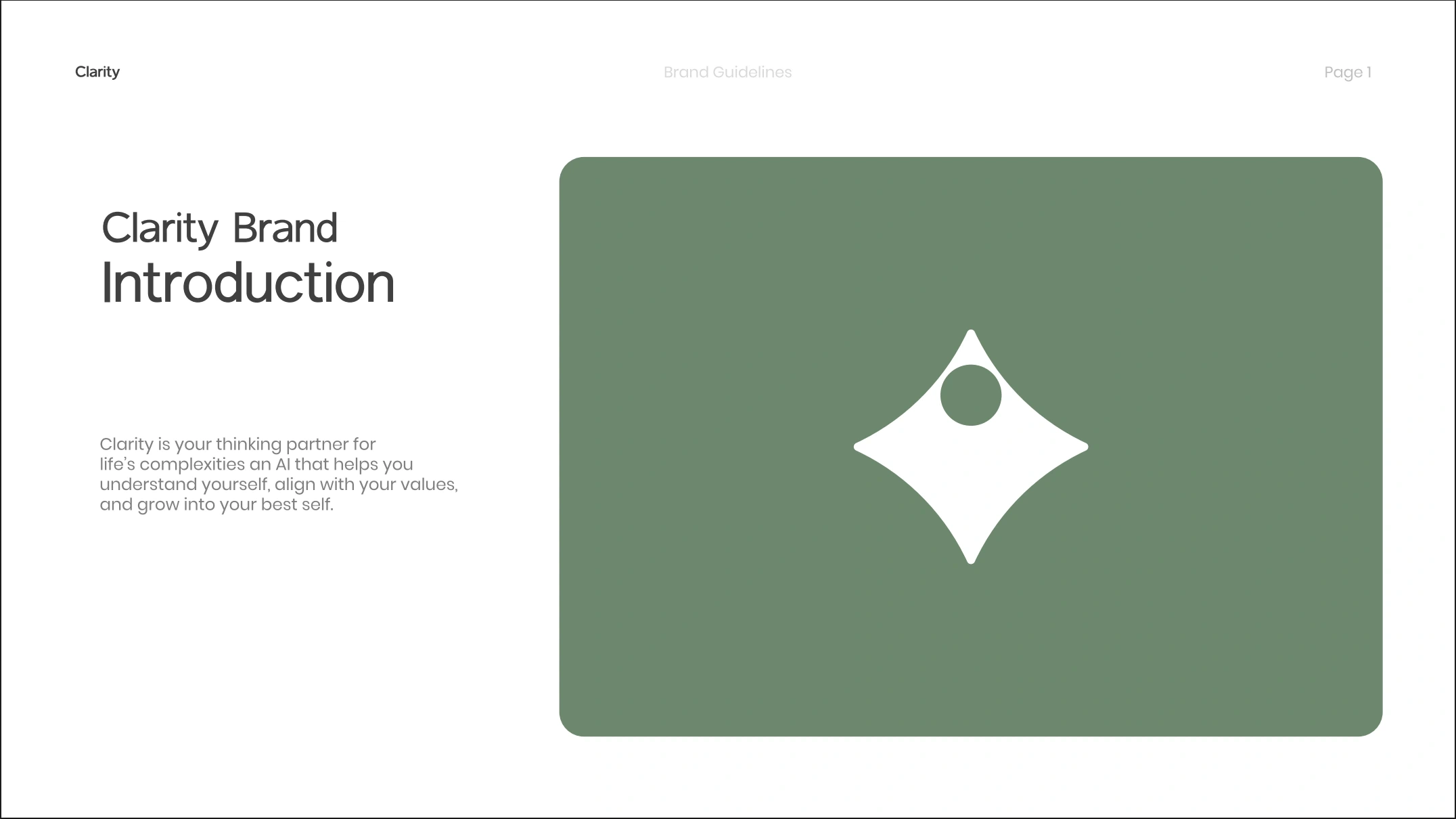 Challenge: Launch an AI product in a market saturated with distrust. Clarity is not a productivity tool. It's a belief-centered AI coach that models your values, aspirations, and personal philosophy to help you become your best self. The visual identity needed to communicate safety, depth, and personalization in an industry where most AI brands look cold, corporate, or overly futuristic.