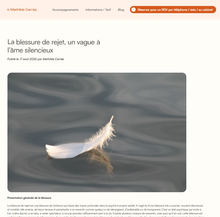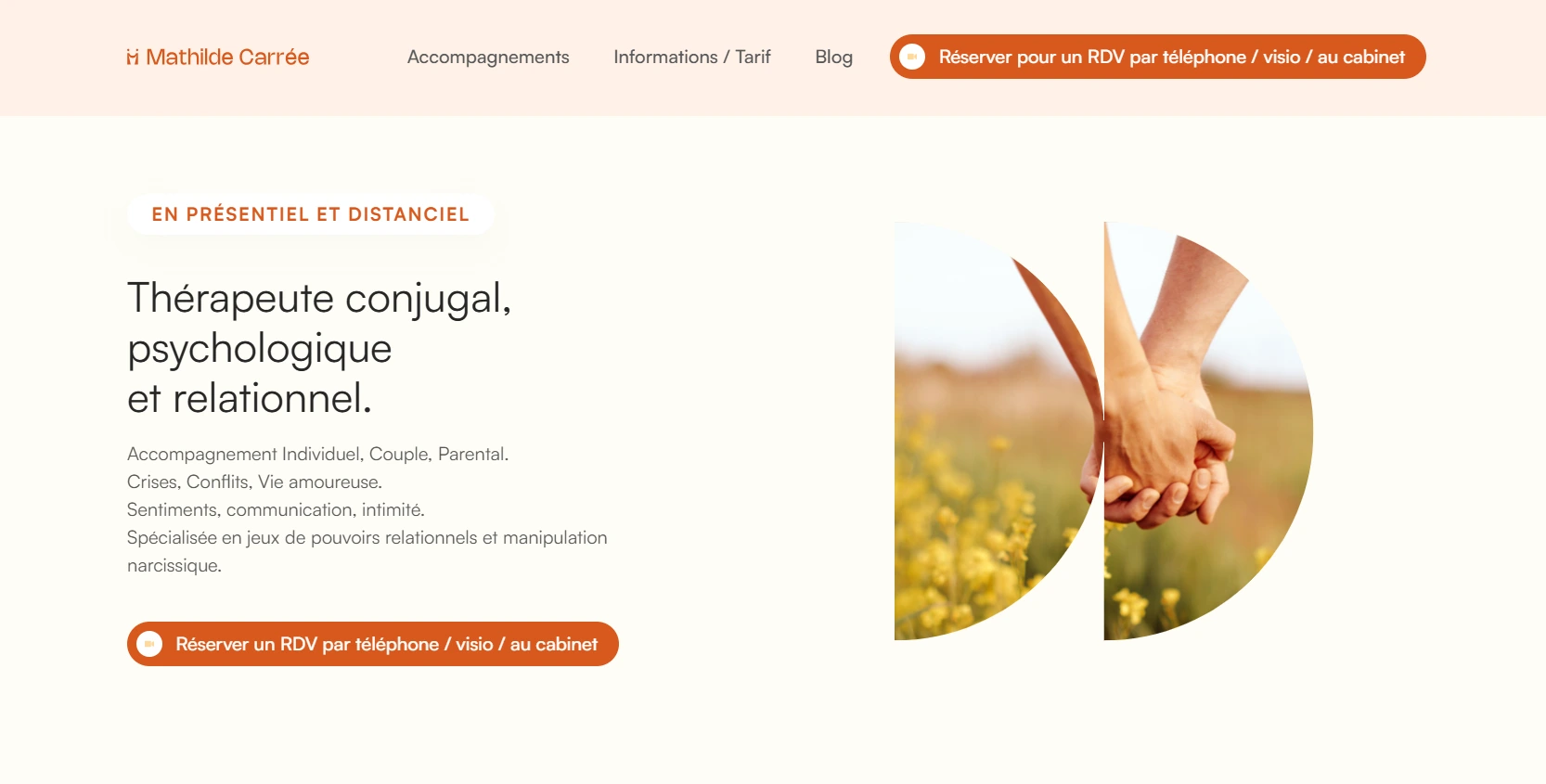I designed the website and brand identity for Mathilde Carrée, a therapist specialized in relational support. The site reflects her human and calming approach through a clean, fluid interface that inspires trust and serenity from the first visit. The visual identity: colors, typography, and symbols, was developed to embody her values of listening, care, and balance. Together, they create a consistent and professional experience that strengthens her image and supports her therapeutic practice.