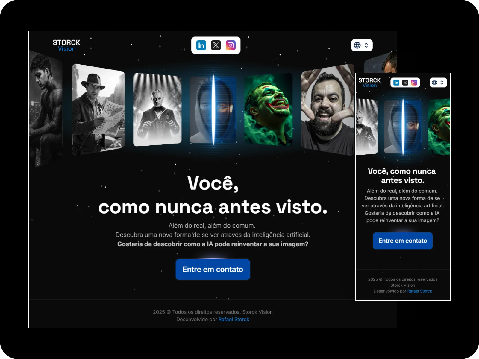 Storck Vision is a one-section promotional website I designed and developed to present and sell my AI-generated portrait services. The goal was to create an immersive, elegant experience that immediately communicates the value of this innovative offering.