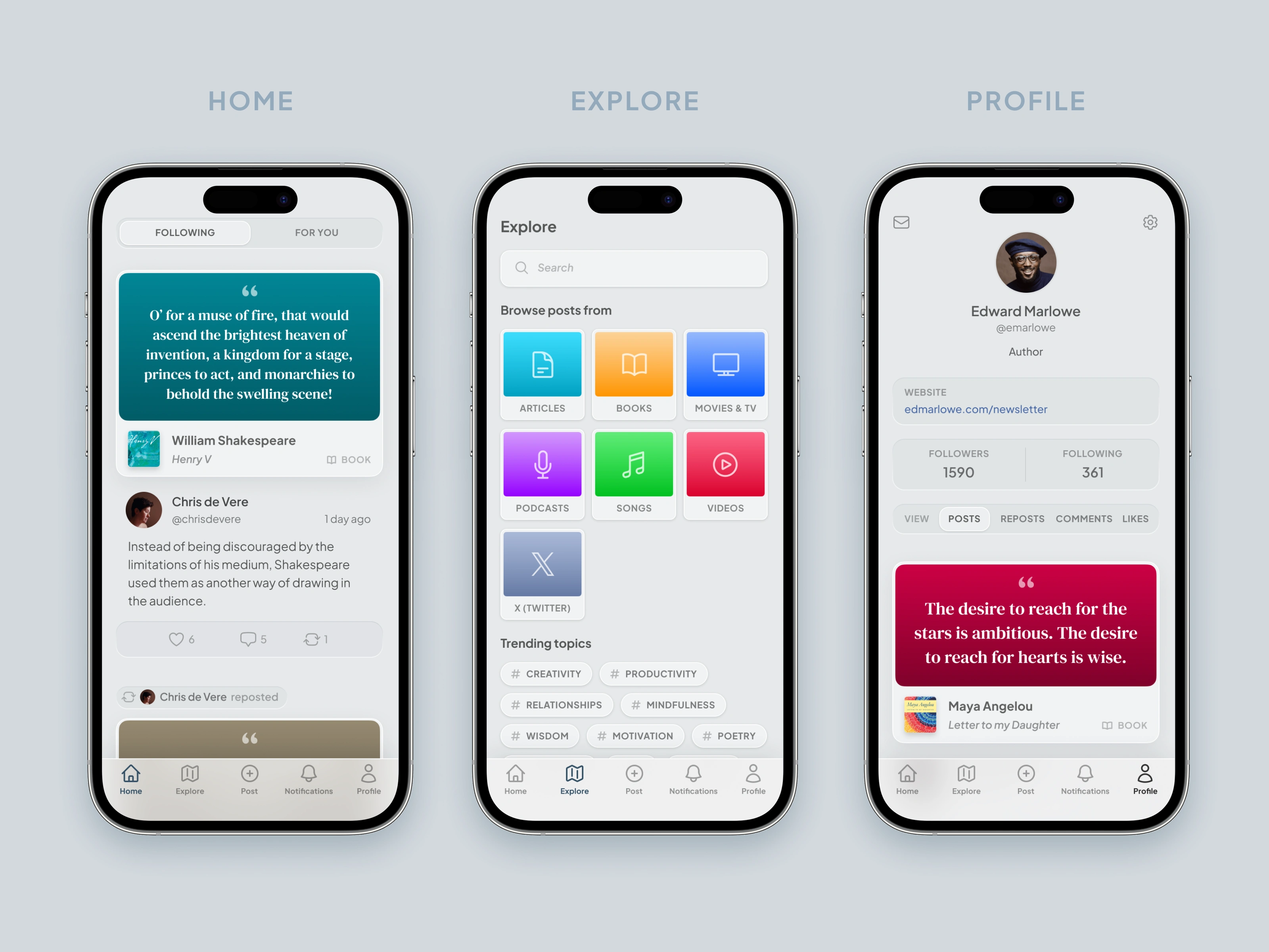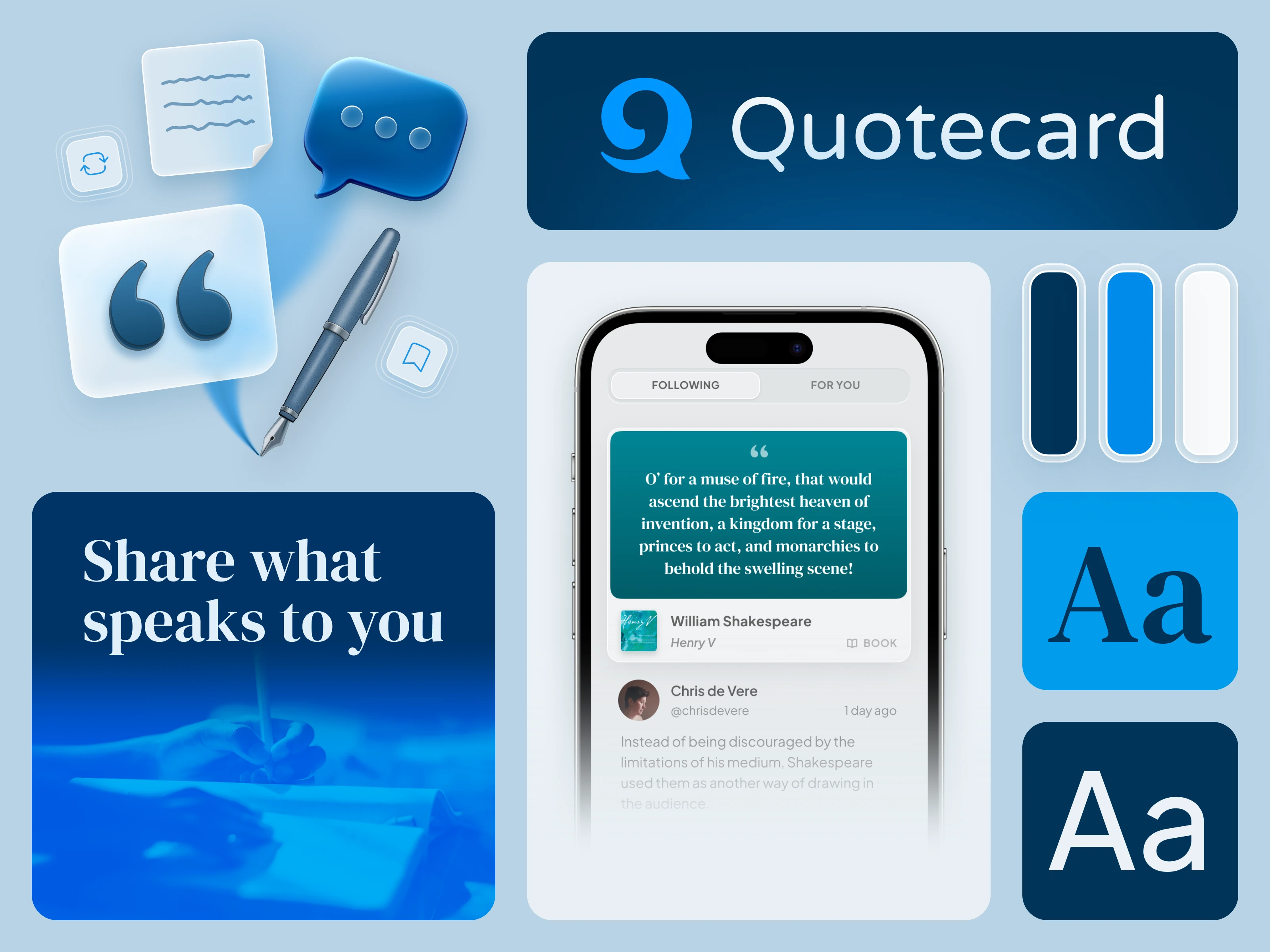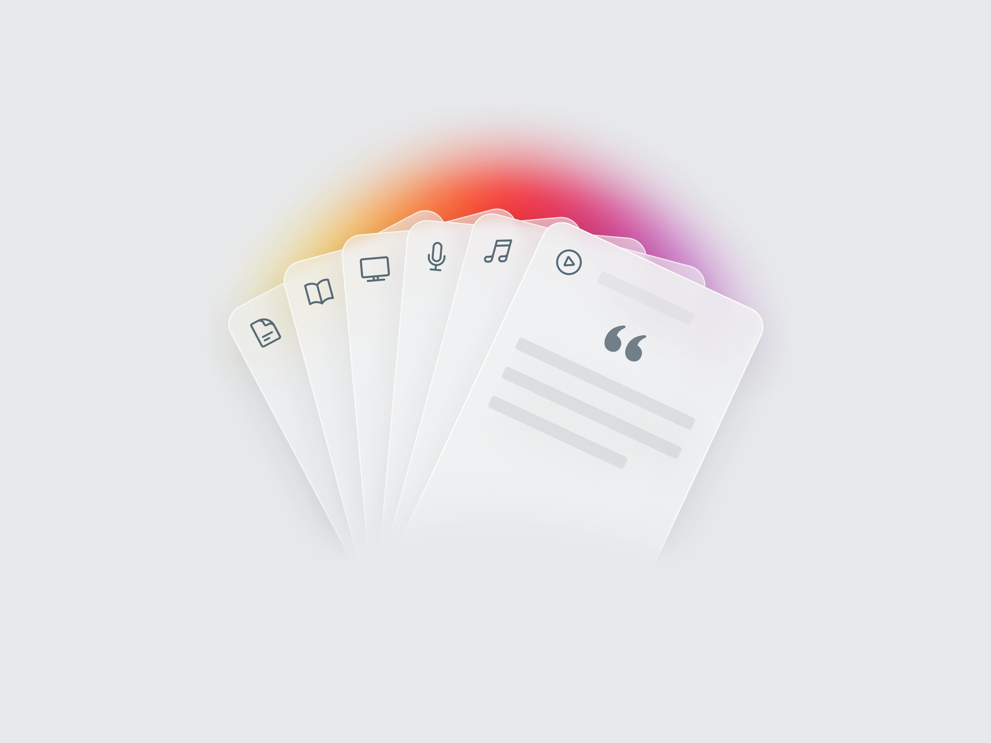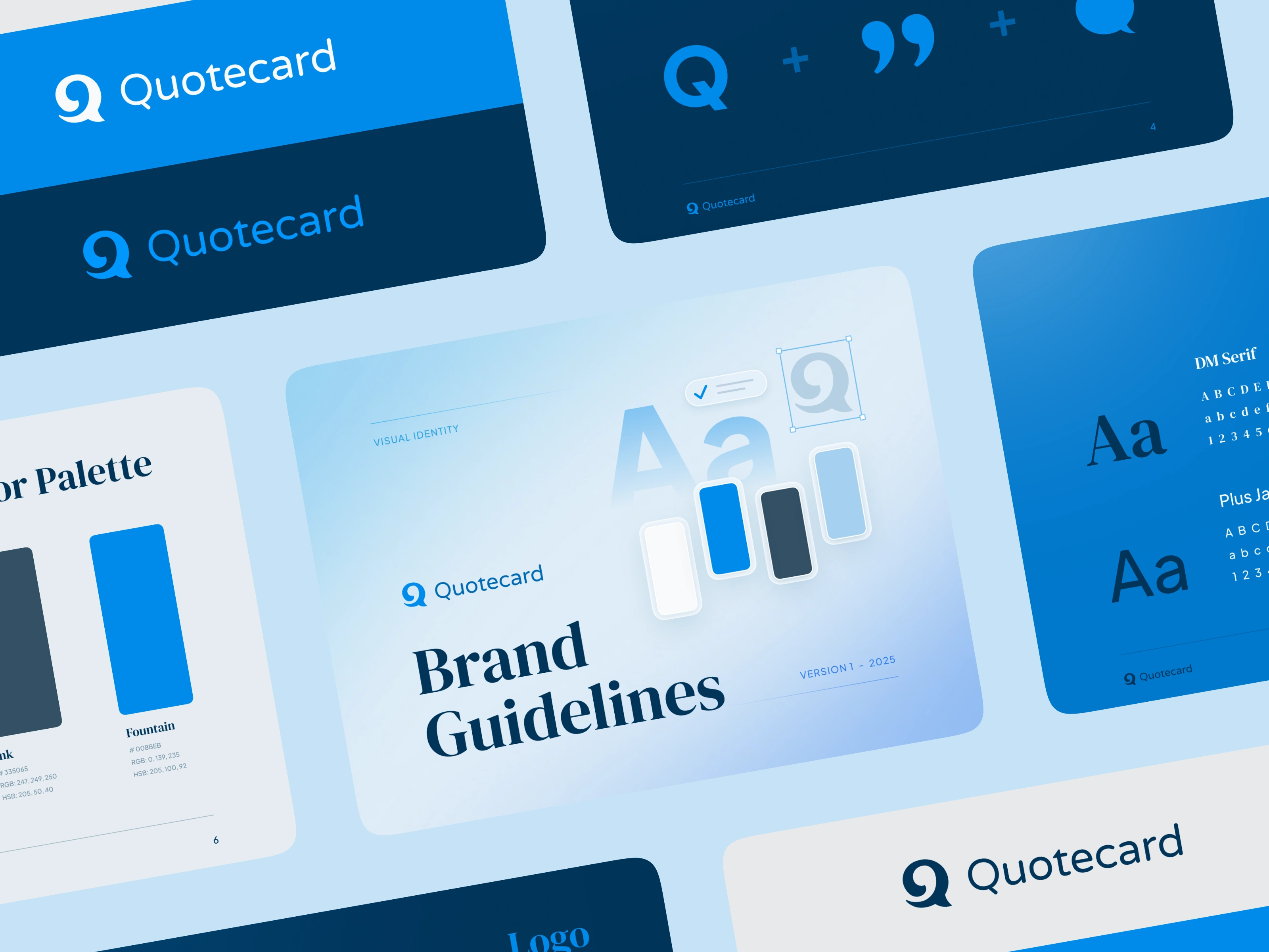 Quotecard is a brand and product direction for sharing quotes from books, podcasts, songs, videos, and other media, designed to tie expressive content to an approachable interface. I created a cohesive visual language that runs through branding, illustration, app UI, and a web landing page so the experience feels unified across touchpoints. The identity combines a conversational logo, a cool and versatile color system, and tactile, media‑inspired illustrations to support a text‑heavy product that still feels clear, scannable, and engaging at a glance.