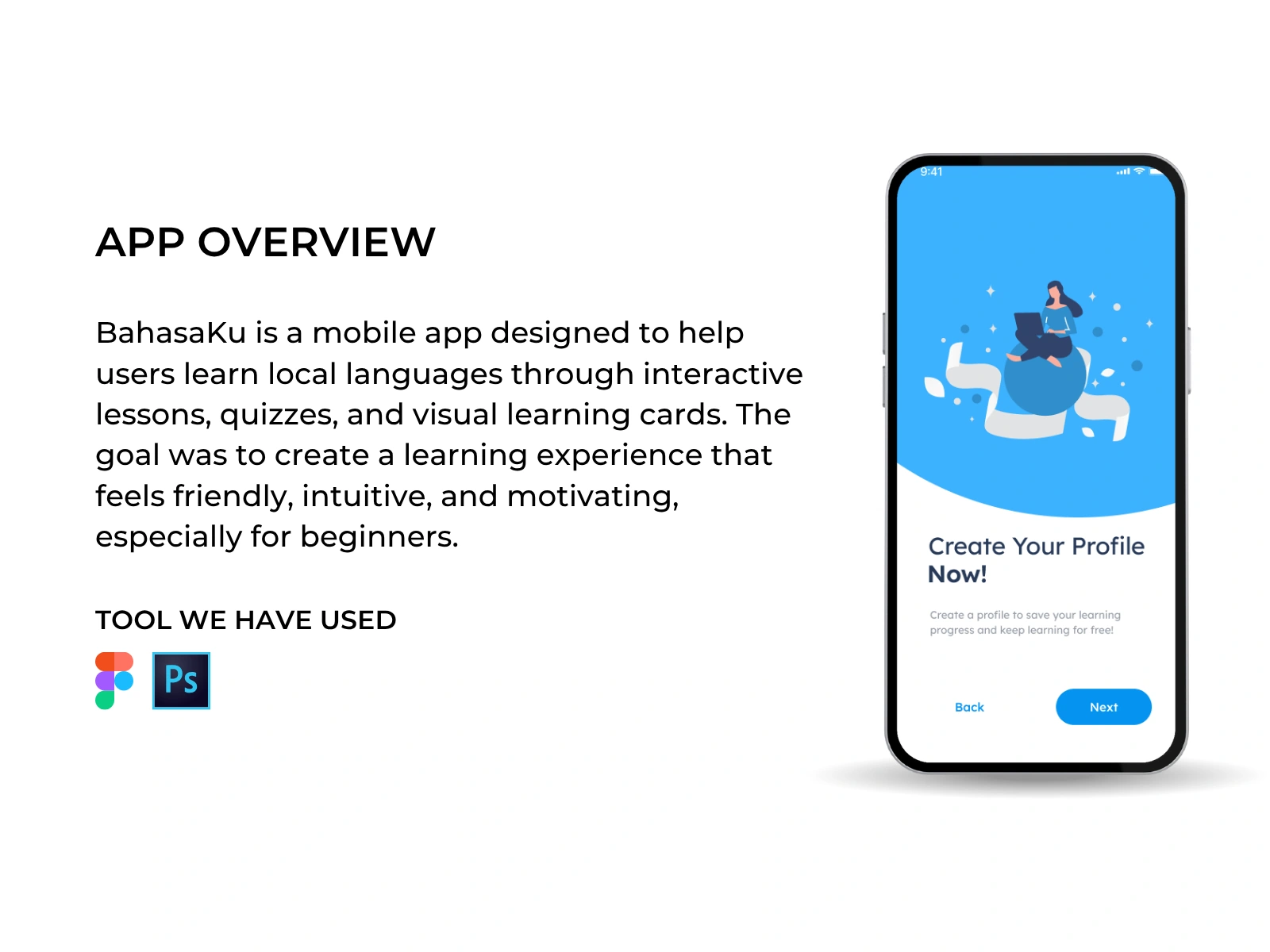 BahasaKu is a language learning app designed to help users learn local languages through friendly, easy-to-understand lessons and interactive quizzes. The goal was to create a learning experience that feels welcoming and motivating, especially for beginners who may feel overwhelmed by traditional language-learning apps.