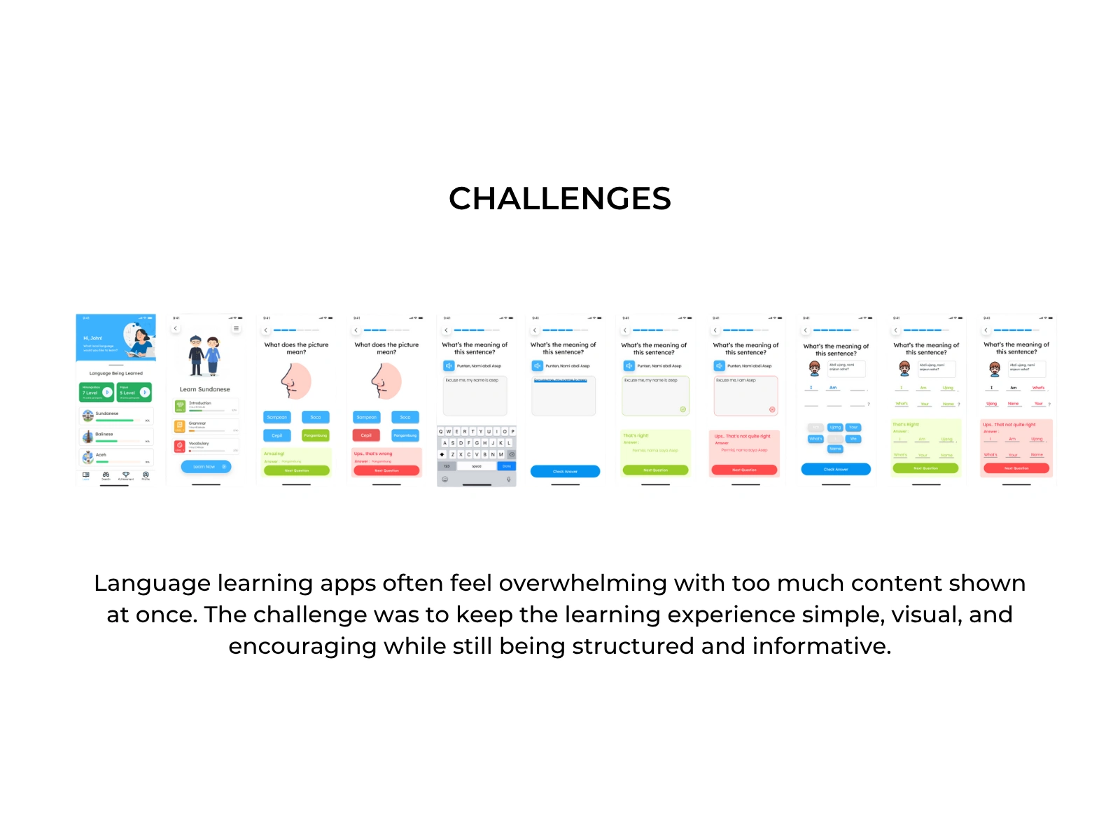 Language learning apps often become overwhelming when they present too much information or too many functions at once. Our challenge was to: