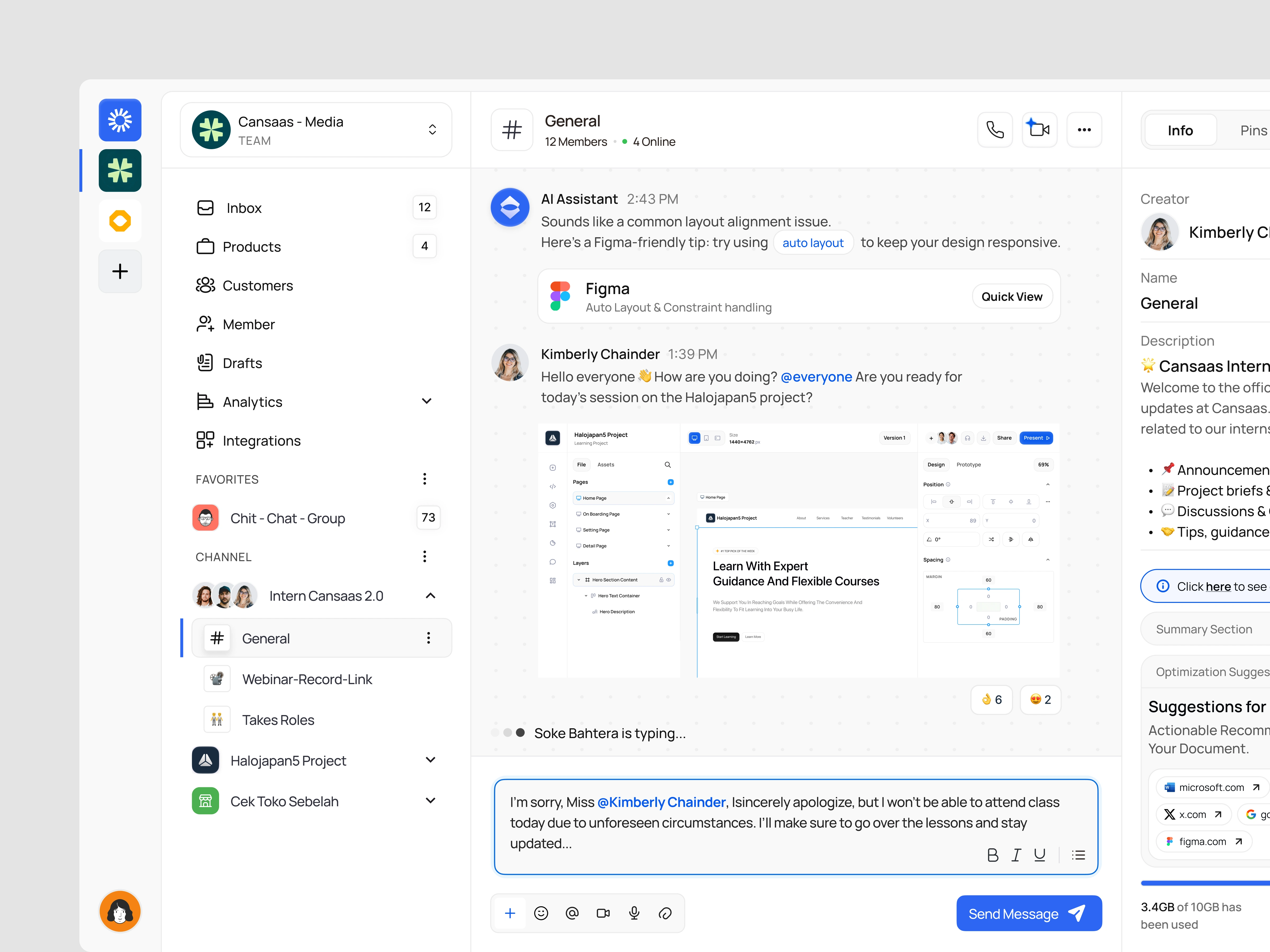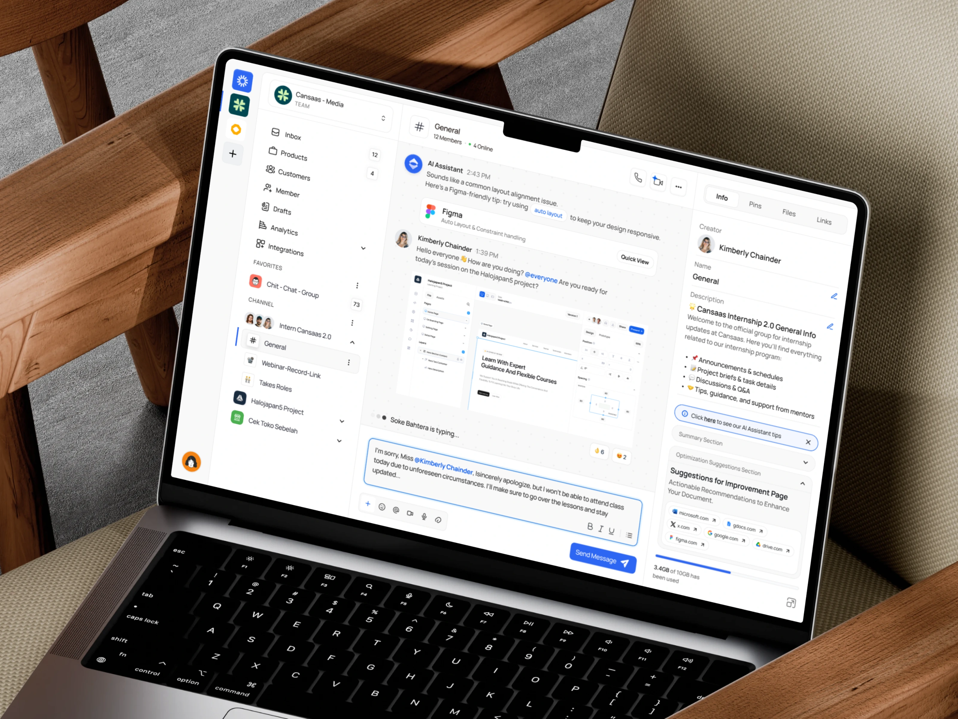 This Team Communication Dashboard is designed to streamline collaboration within distributed teams by combining messaging, file sharing, AI assistance, and project organization in one unified interface. The layout prioritizes clarity and context, allowing users to navigate between channels, check resources, and receive guidance without switching tools.