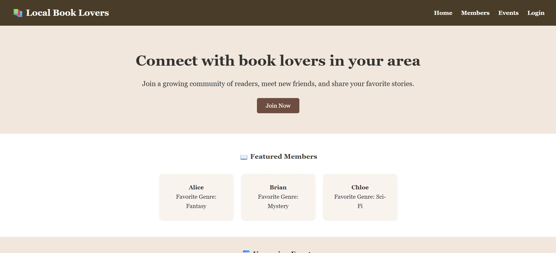 A responsive website to connect local book lovers, featuring member profiles, event listings, and a clean, book-themed HTML/CSS design.