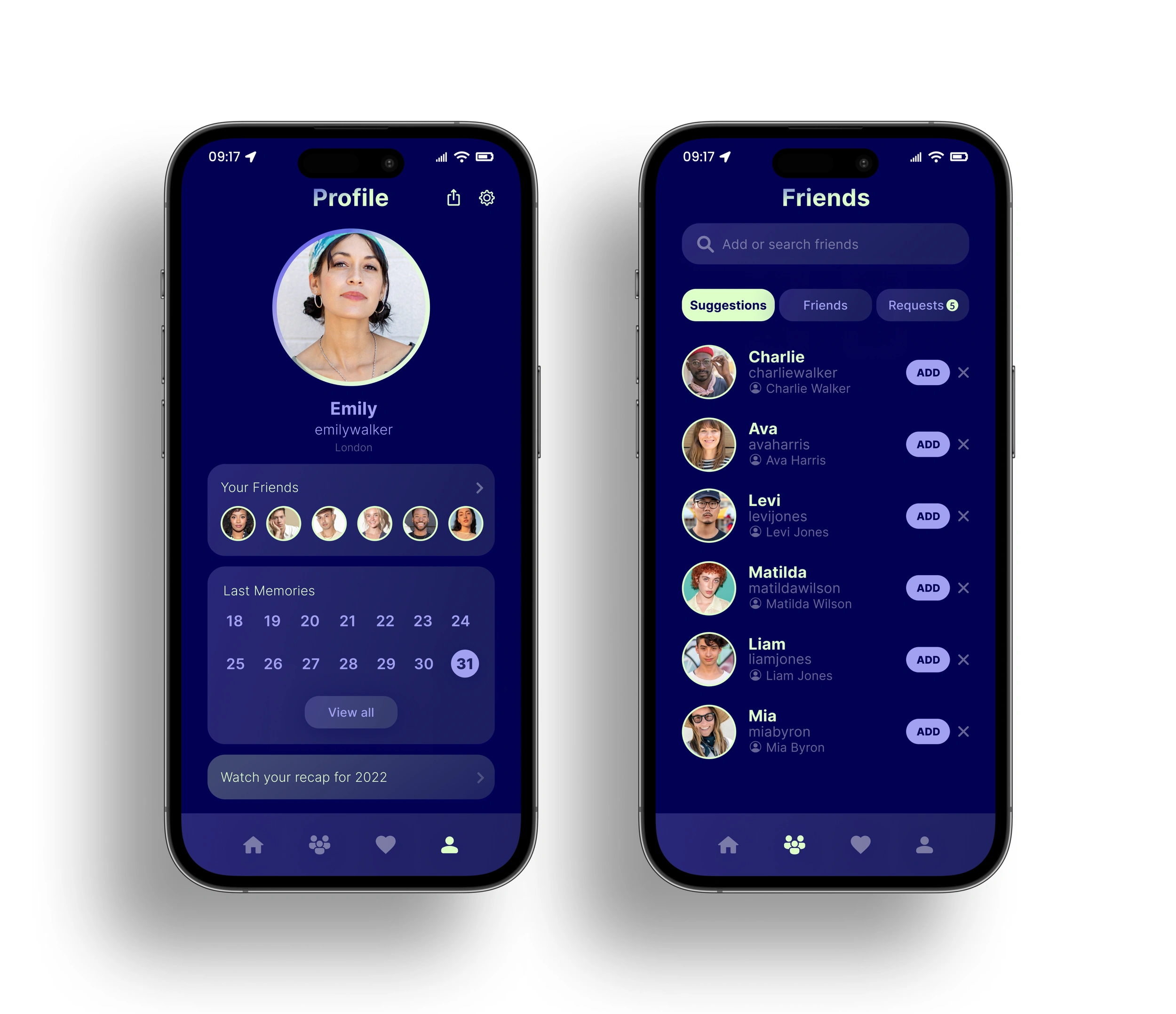Due to time constraints, I’ve chosen to reproduce the following screens: Loading screen, Home screen, Profile screen, Friends screen.