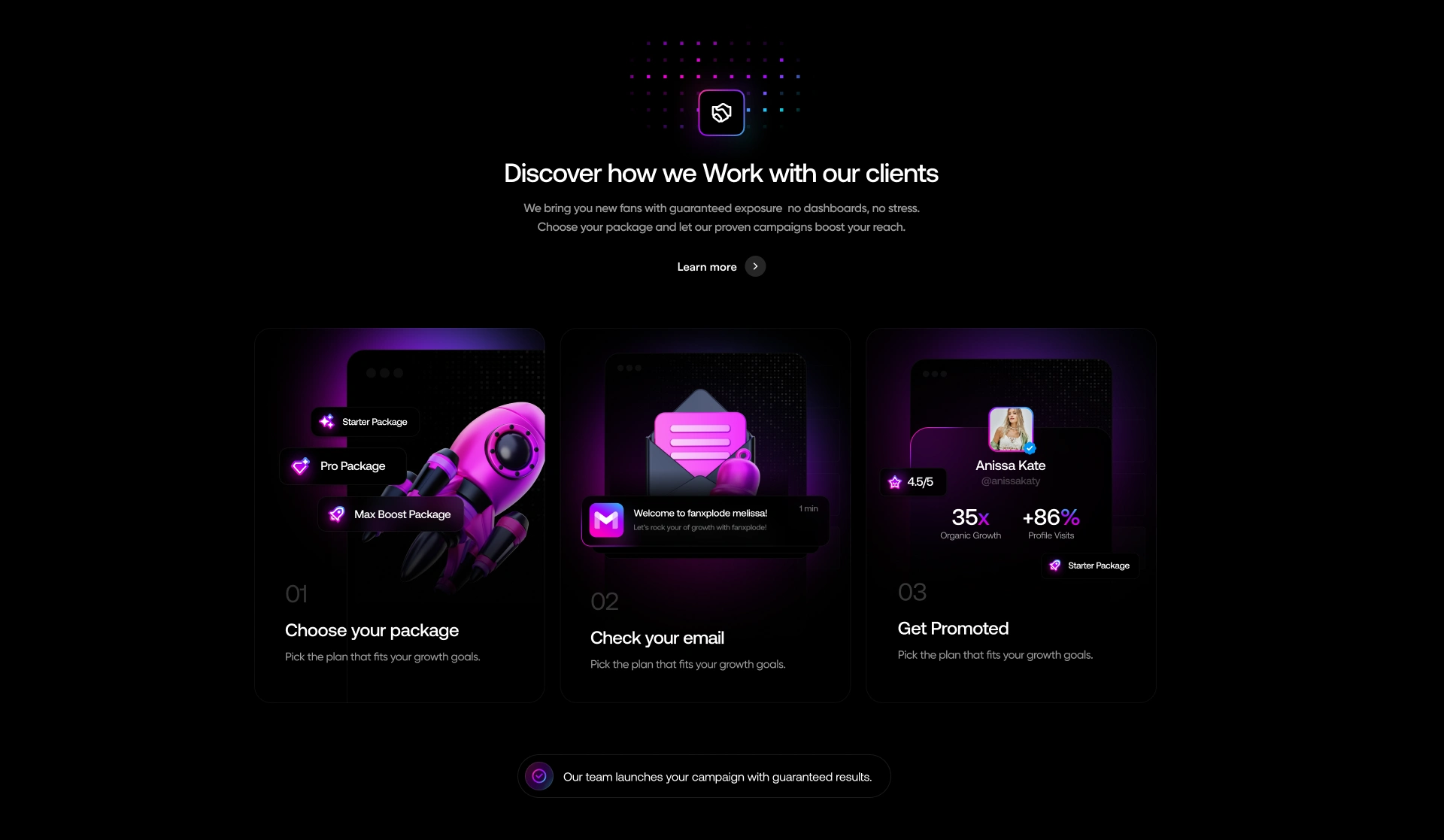 FanXplode is a results-driven OnlyFans marketing agency built for creators who want growth without the grind. We run done-for-you campaigns that drive real, organic fans to your profile no bots, no fake engagement, and no confusing dashboards. Choose a package that fits your goals and our team handles the strategy, targeting, creatives, and optimization from day one. Expect fast activation, measurable outcomes in under 30 days, and privacy-first support from a dedicated manager. With transparent reporting, proven audience funnels, and creator-tested playbooks, FanXplode helps you raise your reach, boost earnings, and turn casual viewers into loyal subscribers so you can spend more time creating and less time marketing.