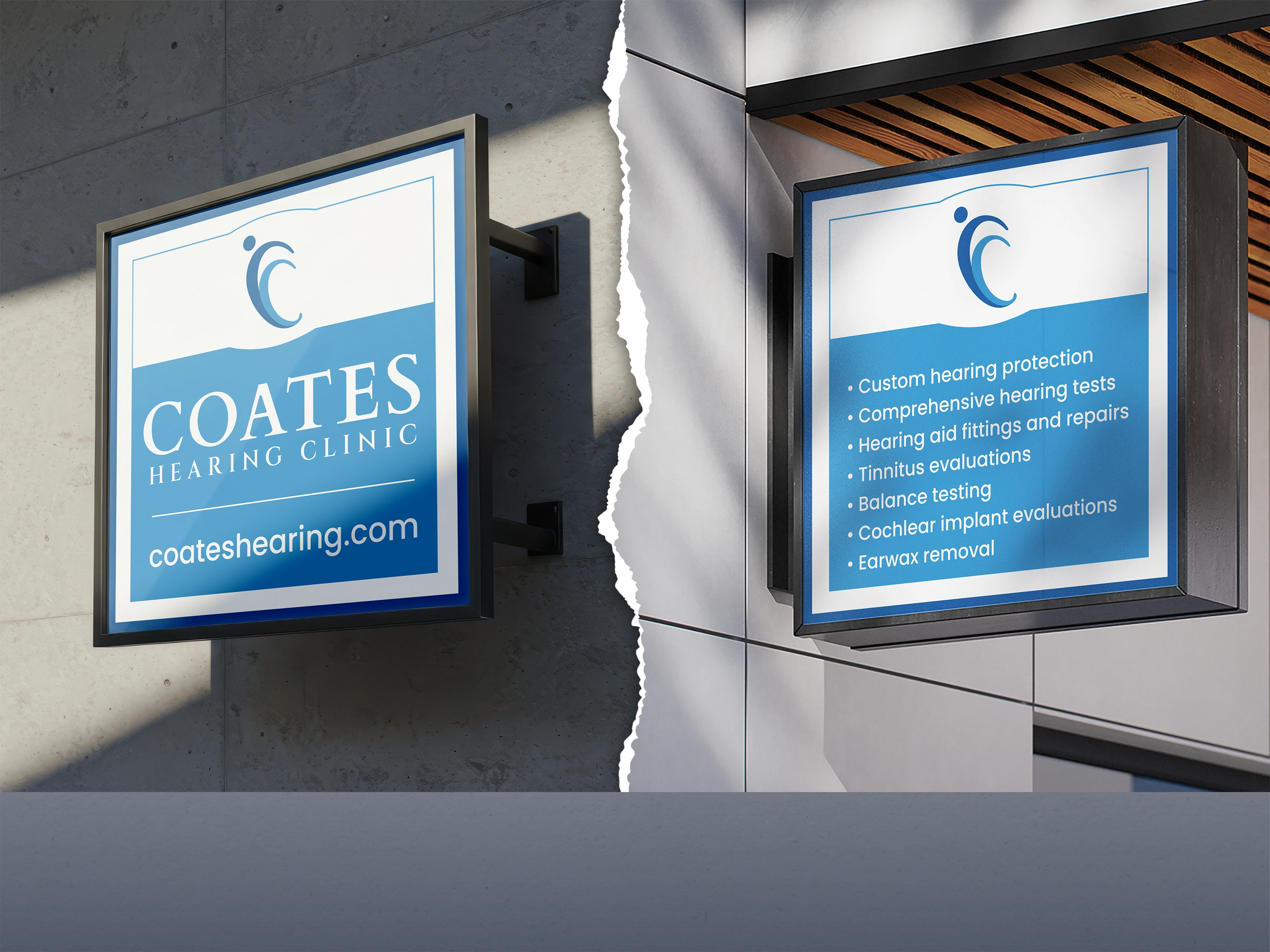 Designed professional exterior signage for a dual-entrance hearing clinic, balancing clear branding and essential services. Collaborated closely with the client to develop two complementary sign faces: one featuring the clinic logo for strong street presence, the other listing key services for easy public reference. Delivered production-ready files.