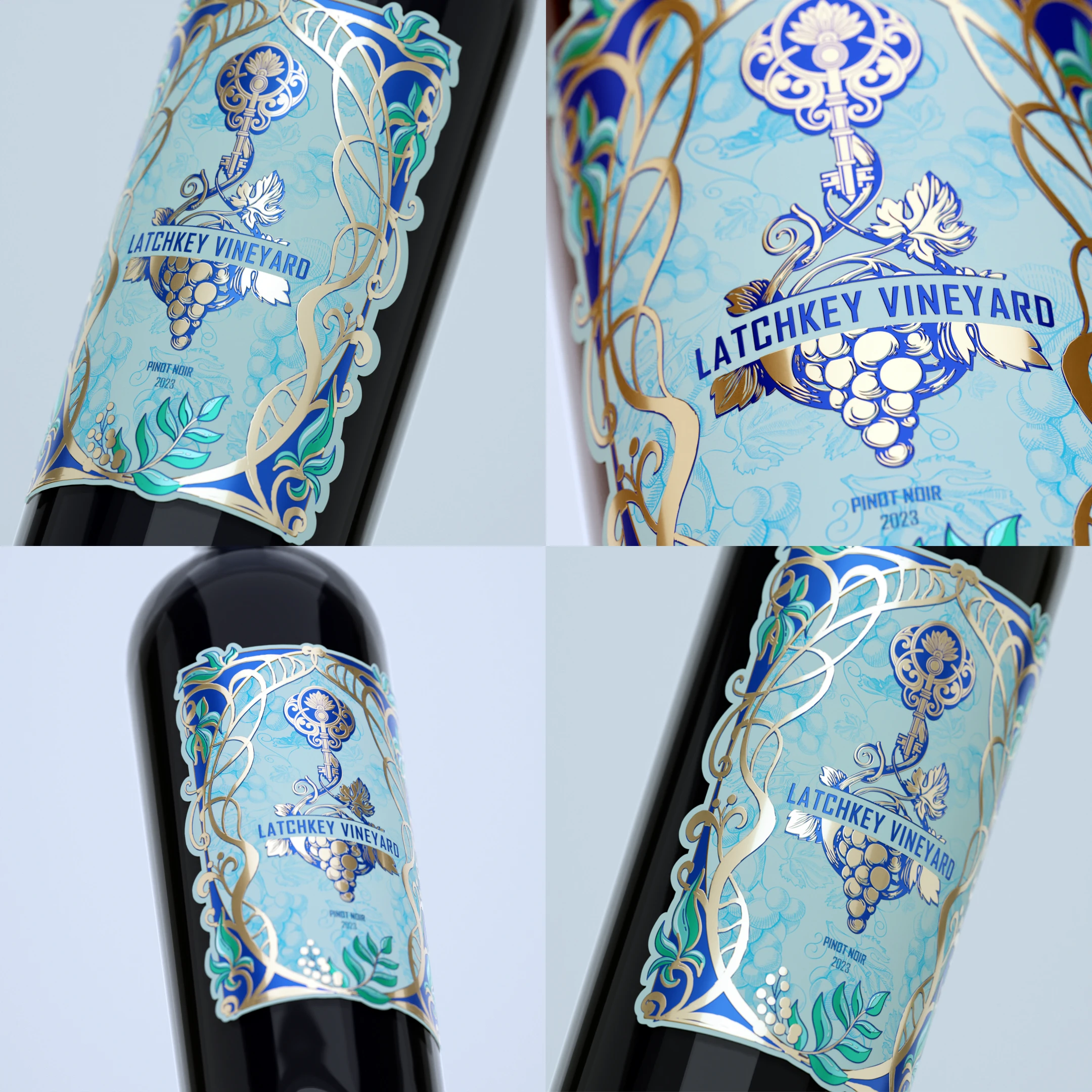 • Tone and Feel: The label should exude sophistication and elegance, appealing to wine enthusiasts and conveying the premium quality of the Pinot Noir. It should evoke the charm and artisanal craftsmanship of the Art Nouveau era while celebrating the heritage of Latchkey Vineyard.