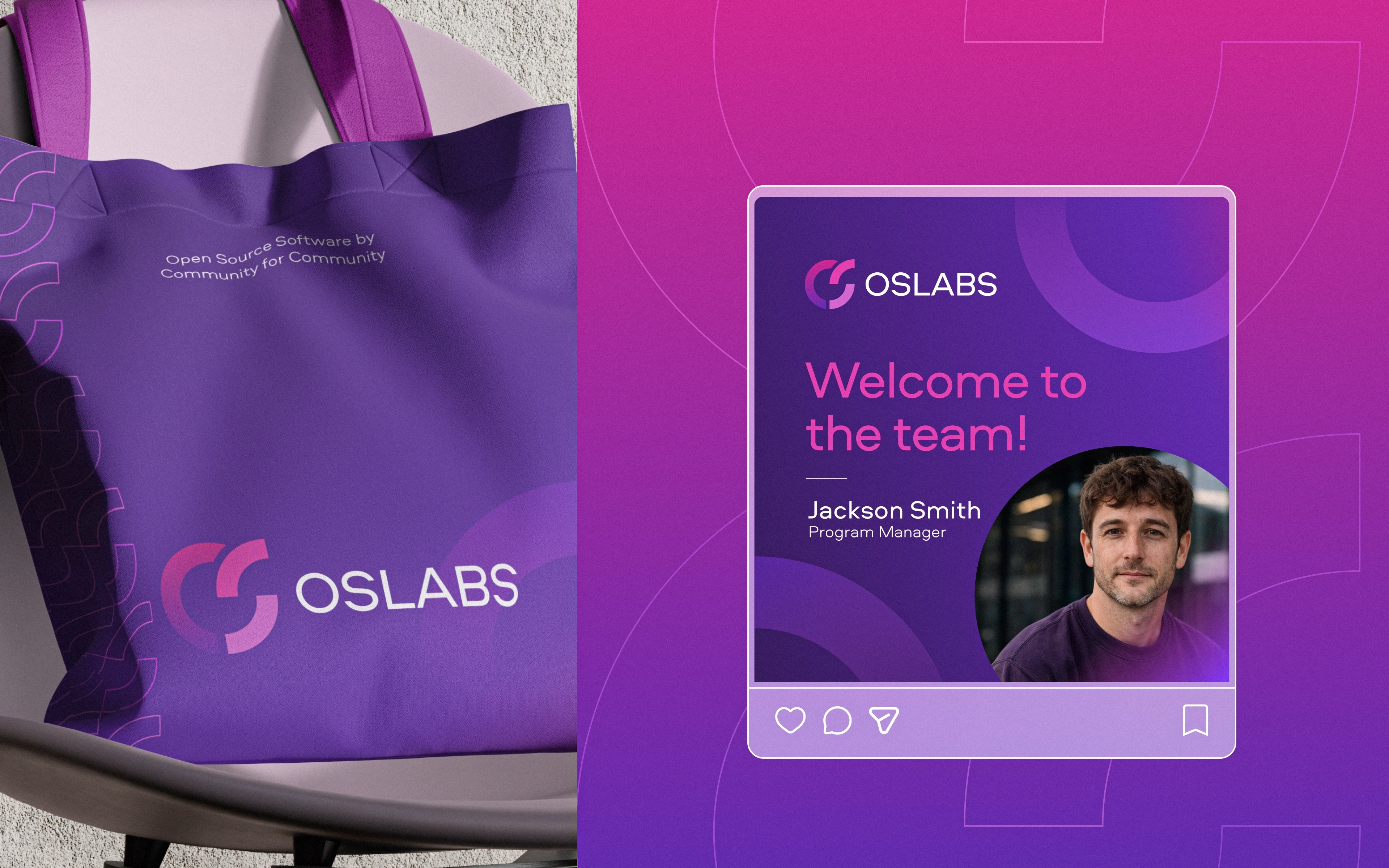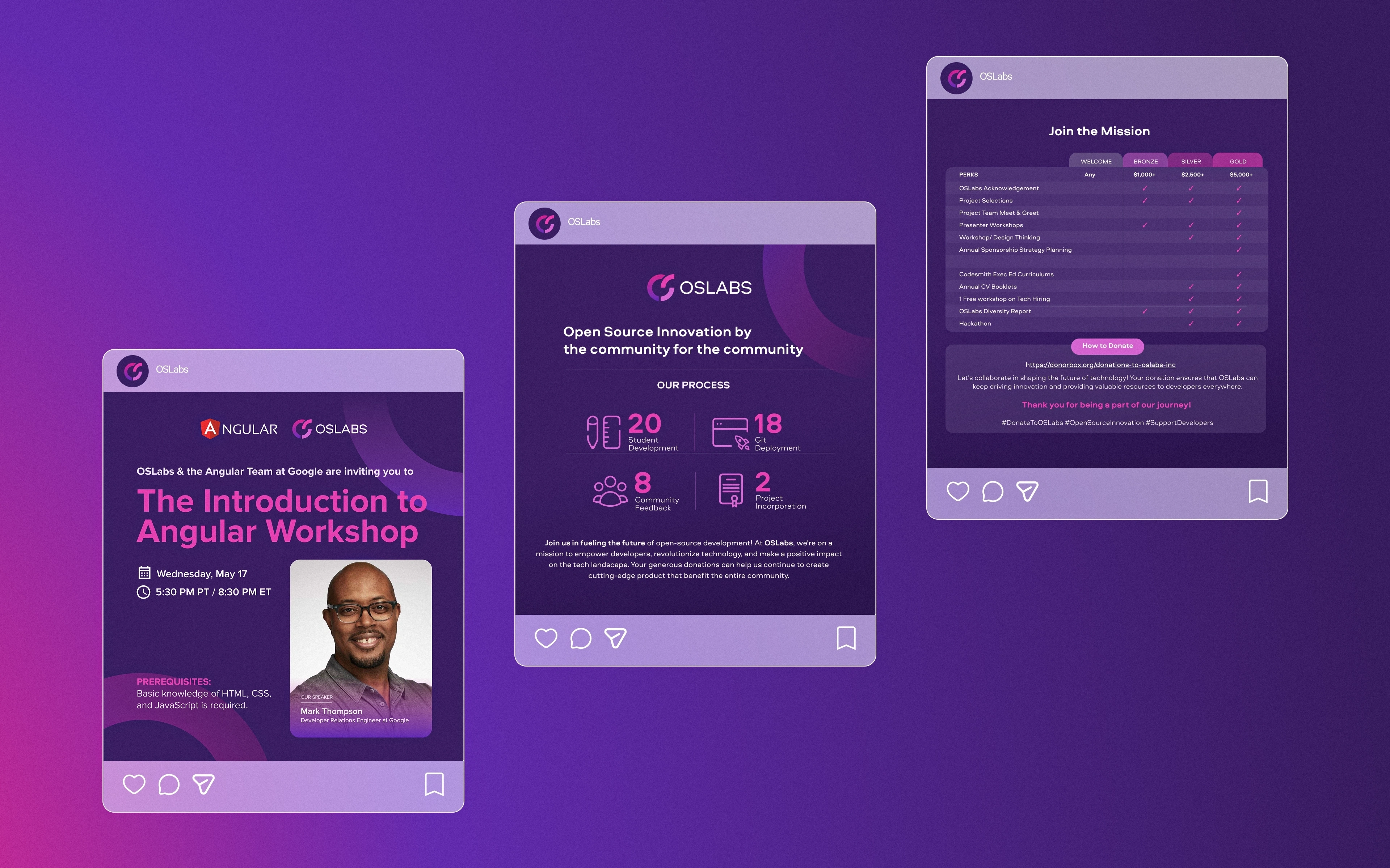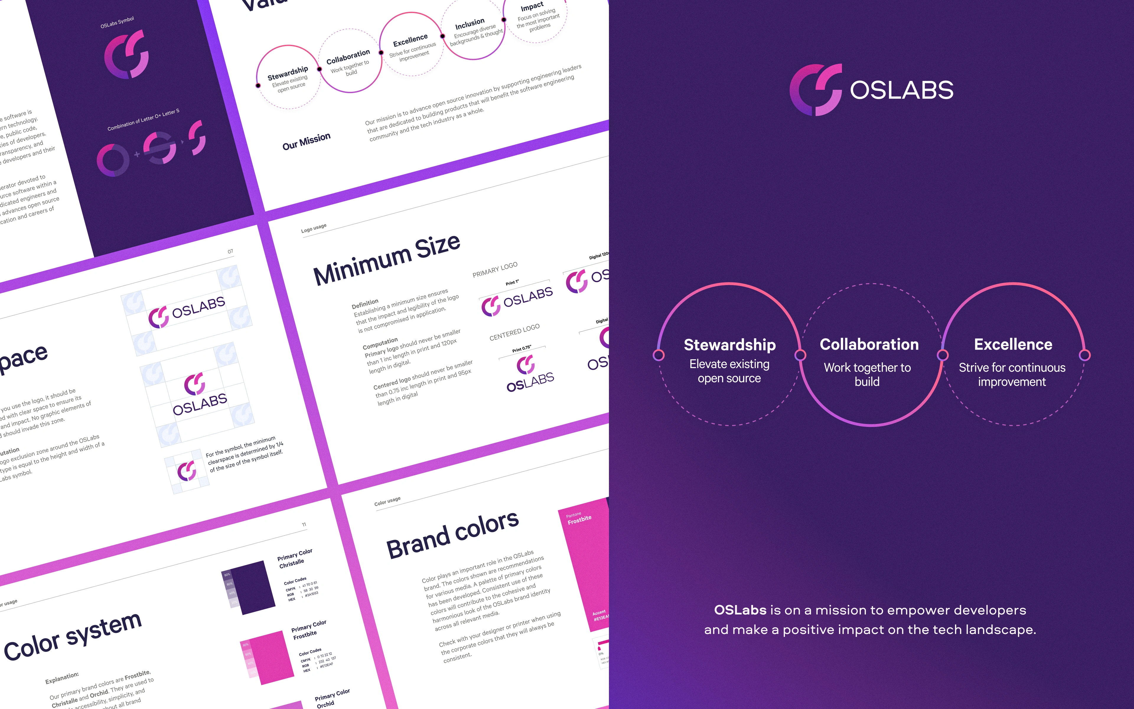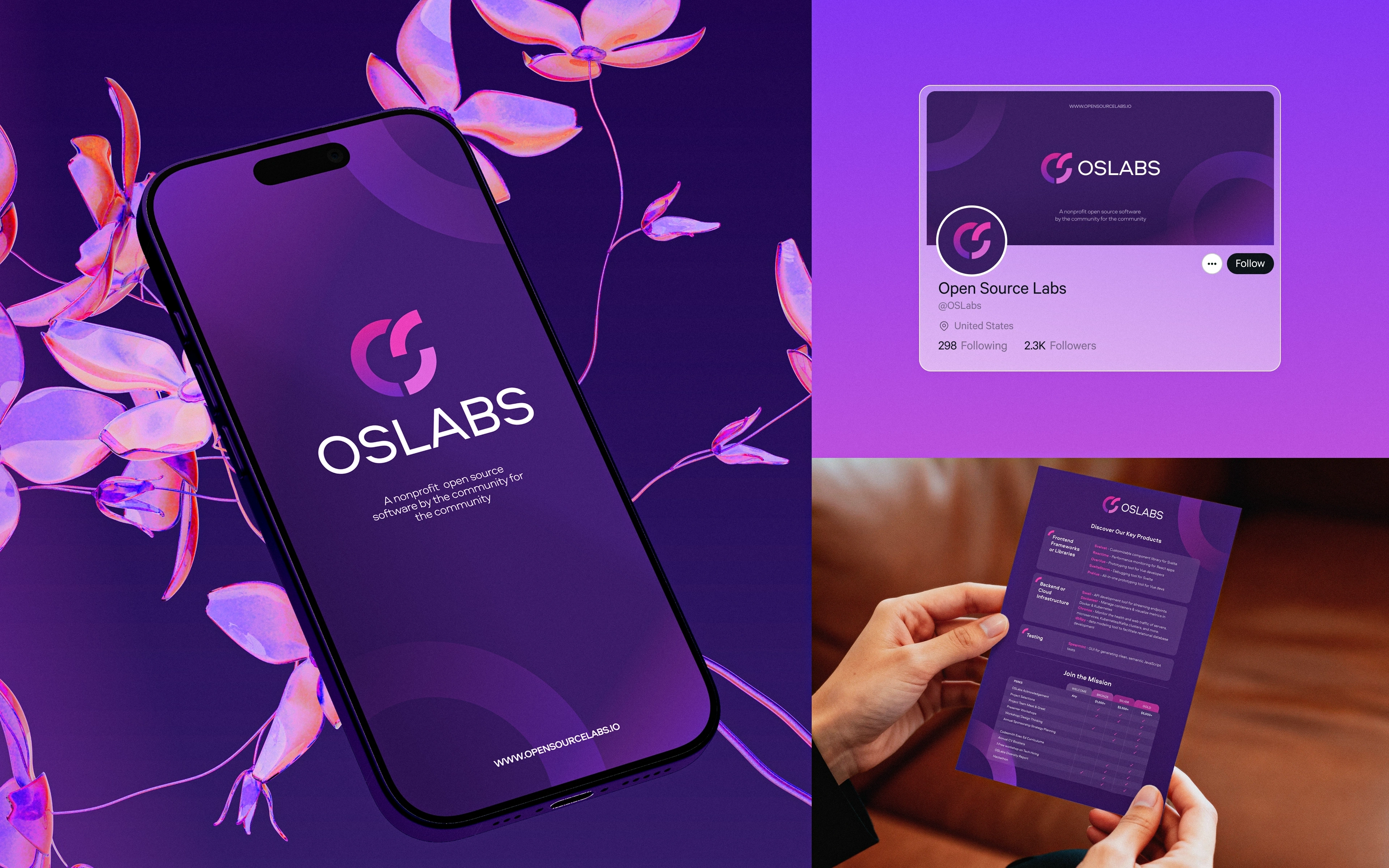 The brand had to live in two worlds at once. On one side, OSLabs is deeply technical and a home for engineers shipping real tools, the kind of place that needs to feel credible in a GitHub README. On the other, it's a nonprofit community trying to bring in sponsors, new contributors, and bootcamp graduates who don't yet think of themselves as "open source people."