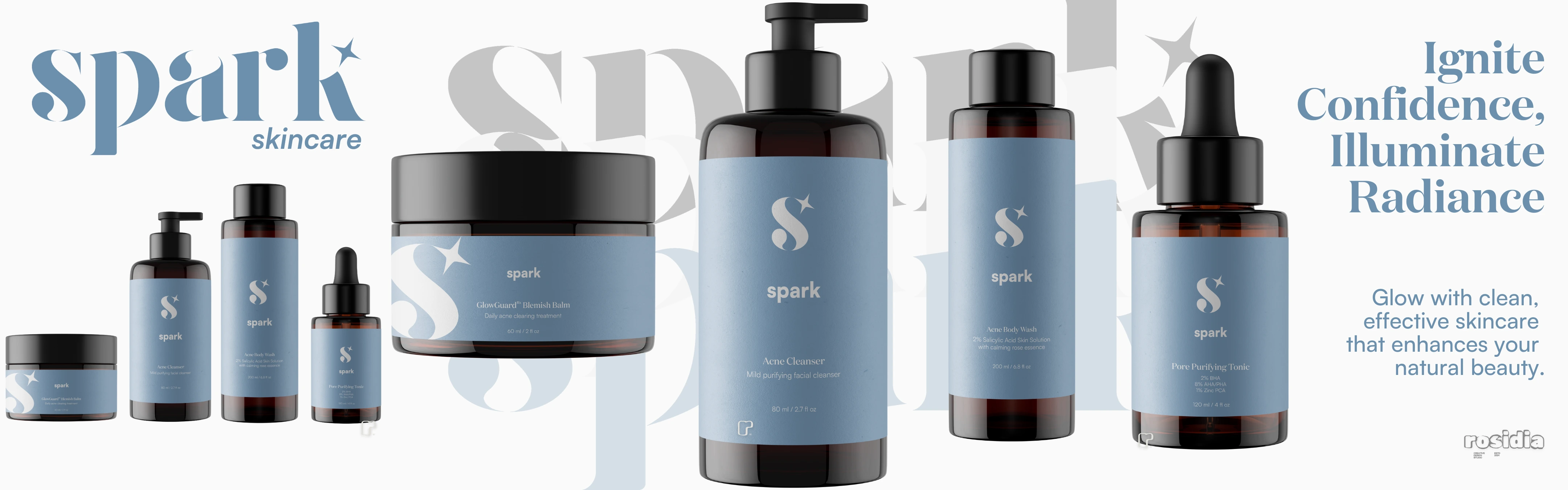 I created a modern, minimalist brand identity that highlights Spark Skincare’s commitment to high-quality ingredients and sustainable practices. The Giza Stencil font was chosen to give the brand a unique, memorable voice, while the color palette and design elements evoke a sense of calm and luxury. The project included logo design, packaging concepts, and promotional visuals that align with Spark Skincare's mission of providing gentle, effective skincare.