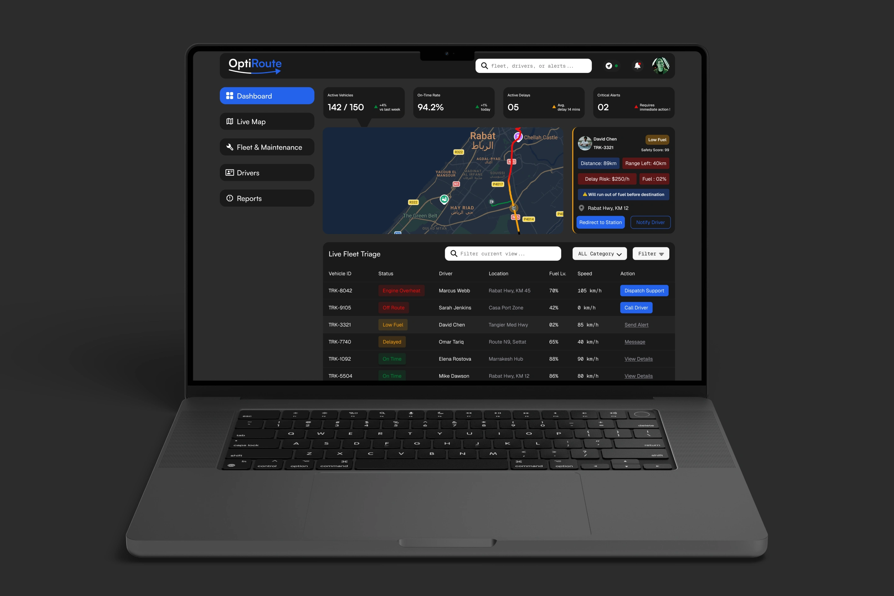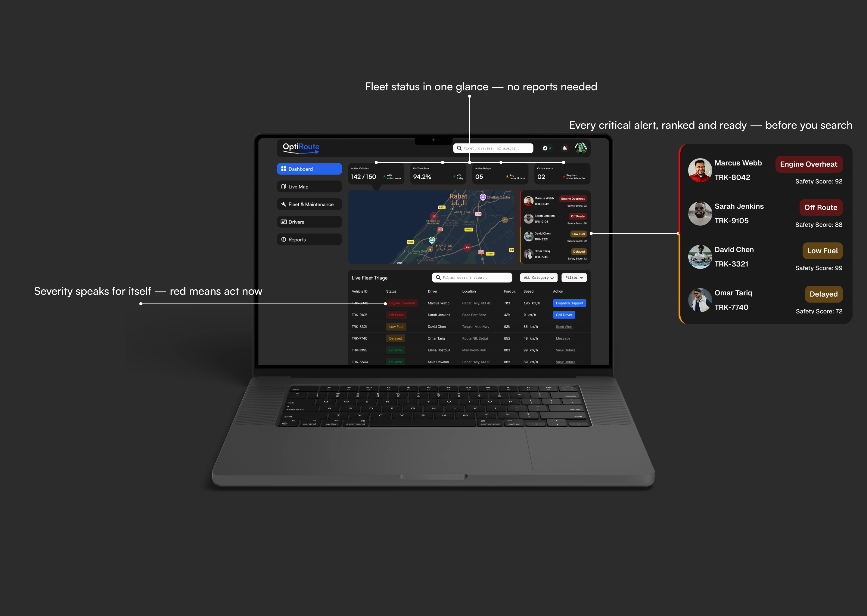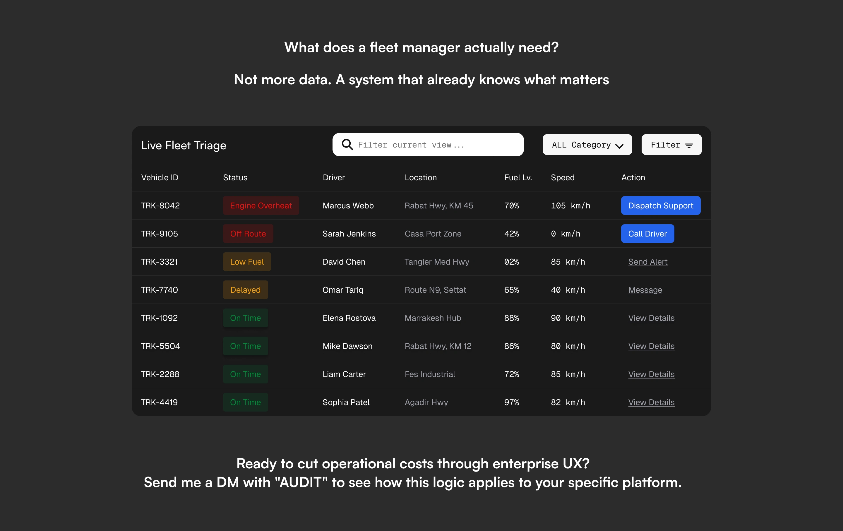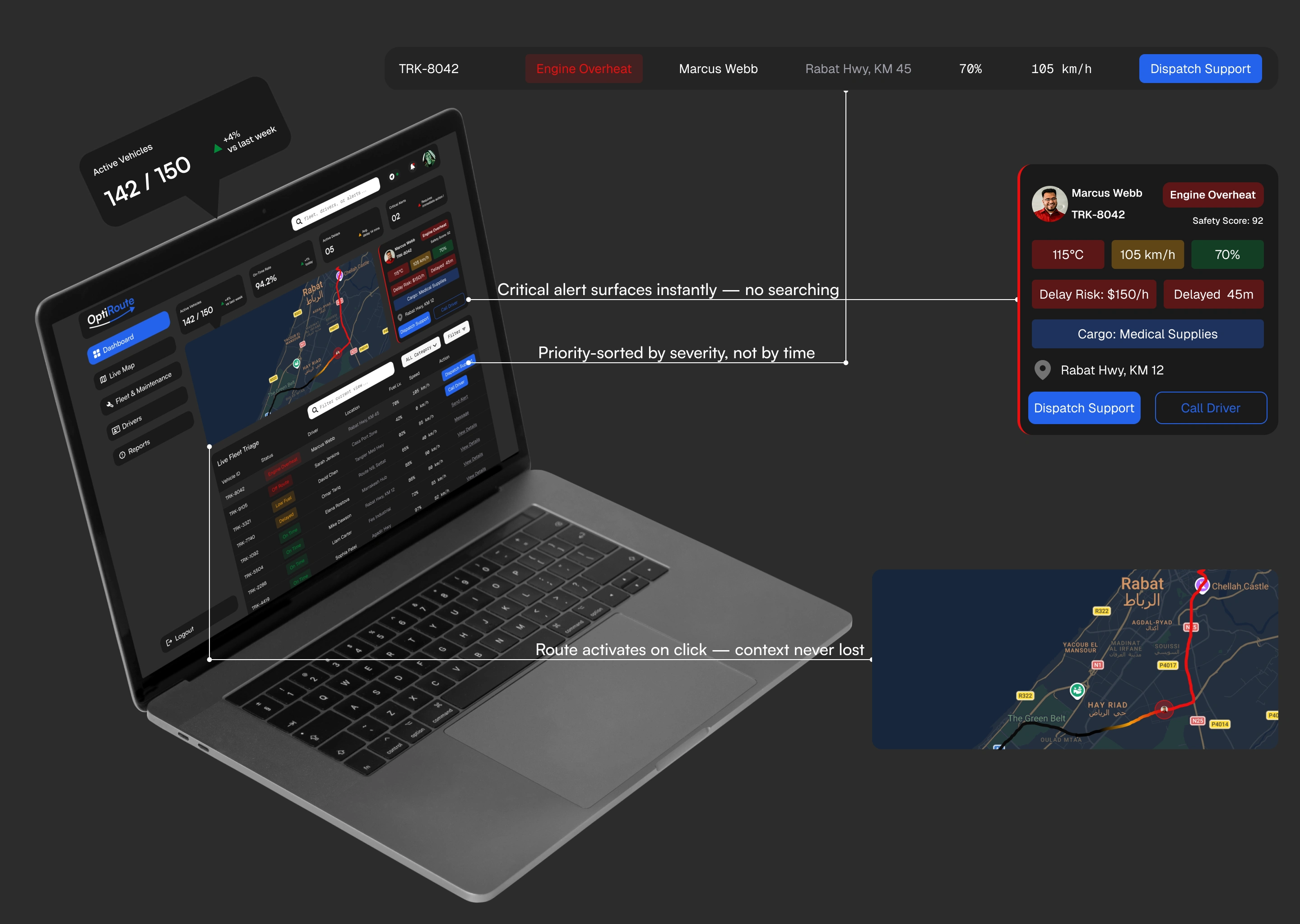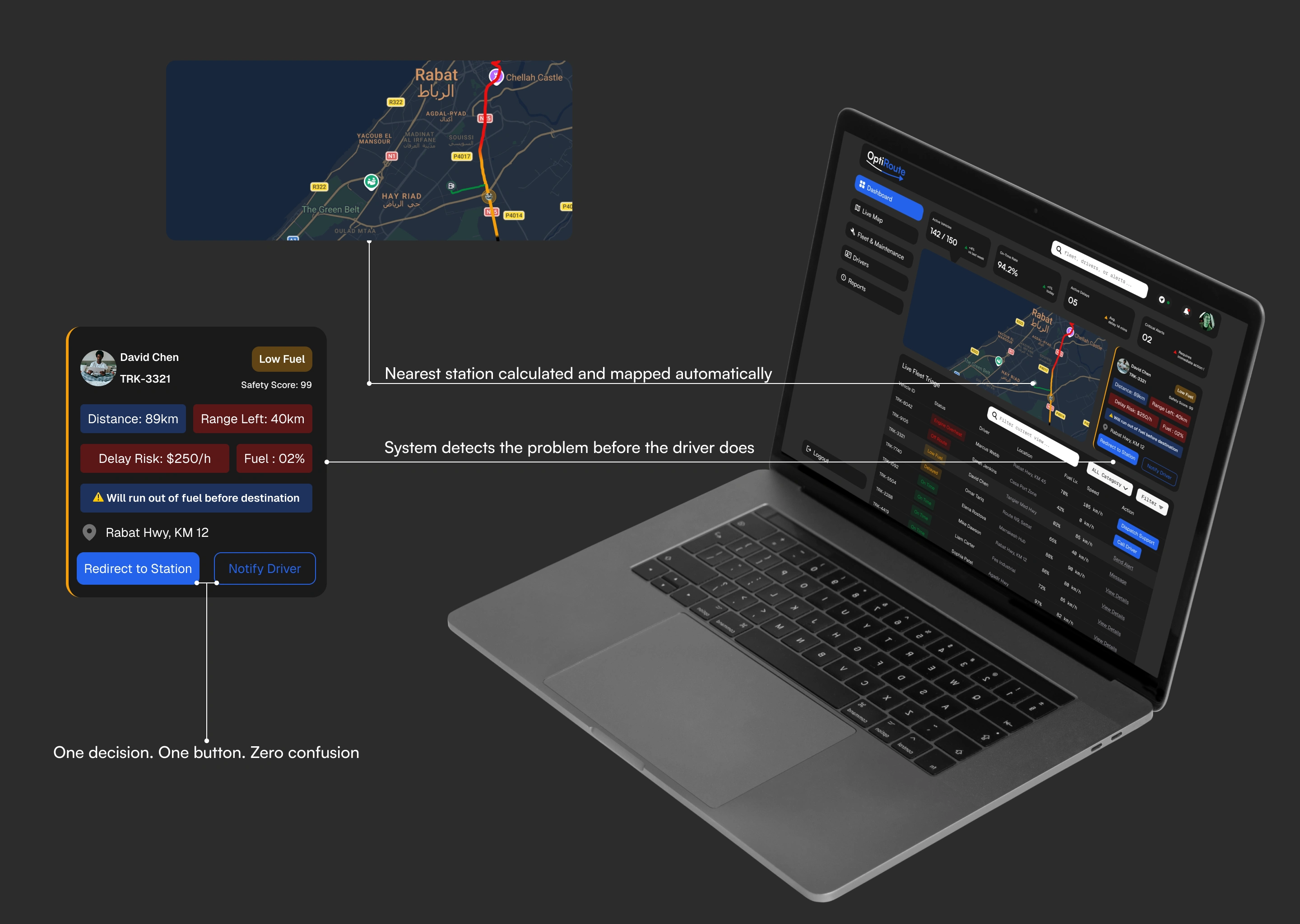 A fleet management dashboard designed around one question:what does a manager actually need in a crisis? Not more data —a system that already knows what matters