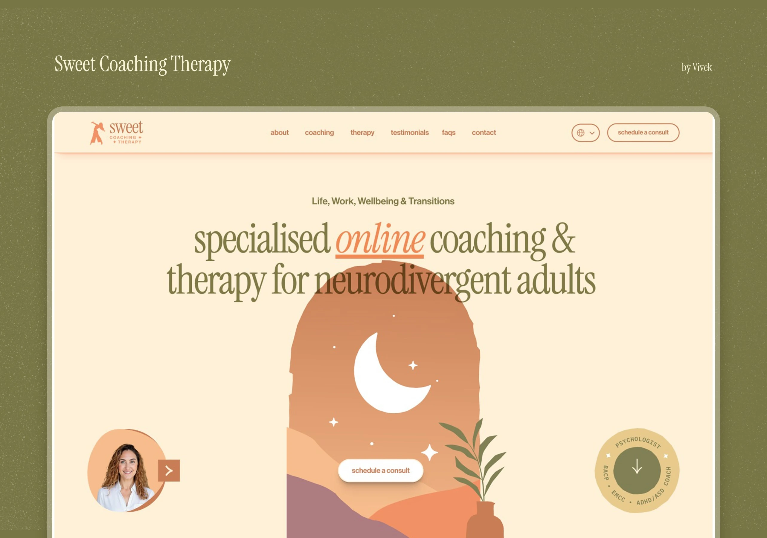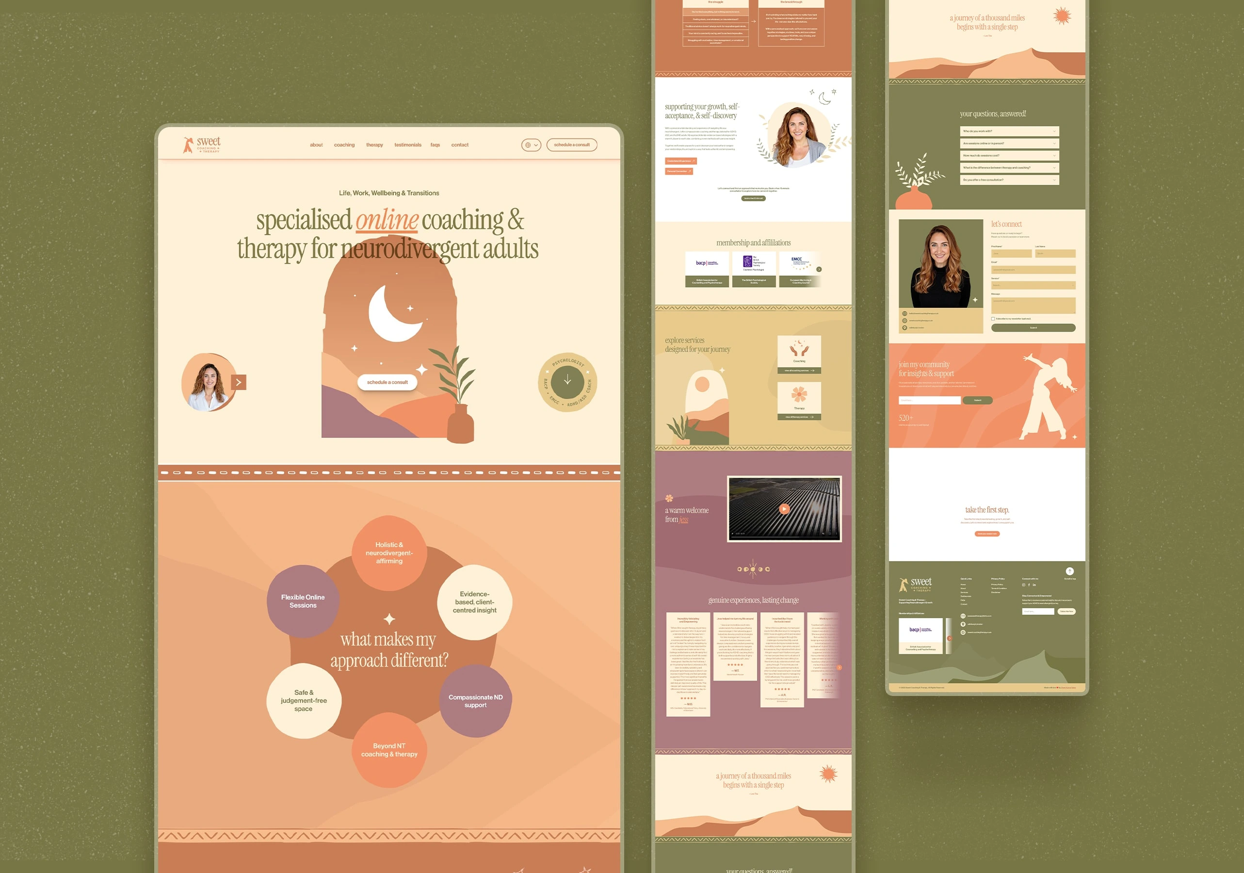 Designed and developed a calm, modern landing page for Sweet Coaching Therapy in Illustrator and Framer, creating a warm and welcoming digital experience.