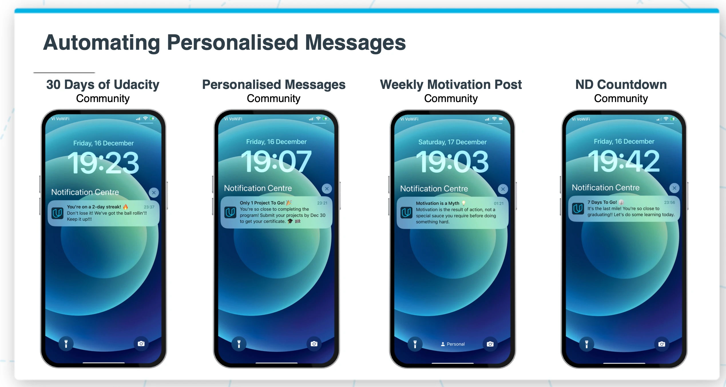 Every message was personalized and contextual. A streak nudge when you're building momentum. A milestone celebration when you're close to finishing. A motivational insight when engagement dips. A countdown when the deadline approaches.