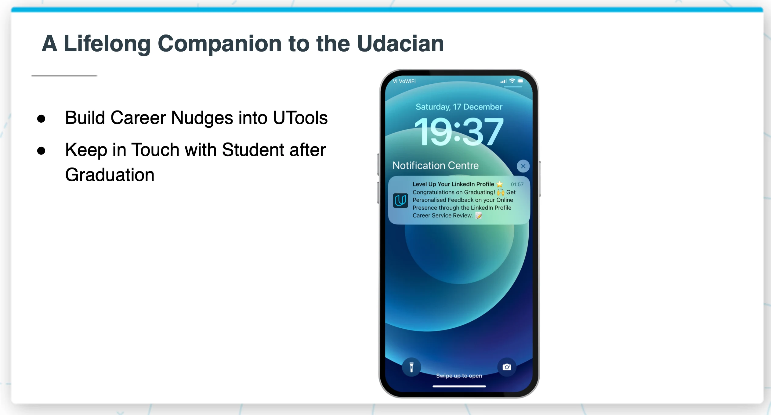 The long-term vision was bigger than course completion. UTools would stay with the student after graduation — nudging them to update their LinkedIn, take career services, enroll in the next program. A lifelong companion, not a temporary tool.