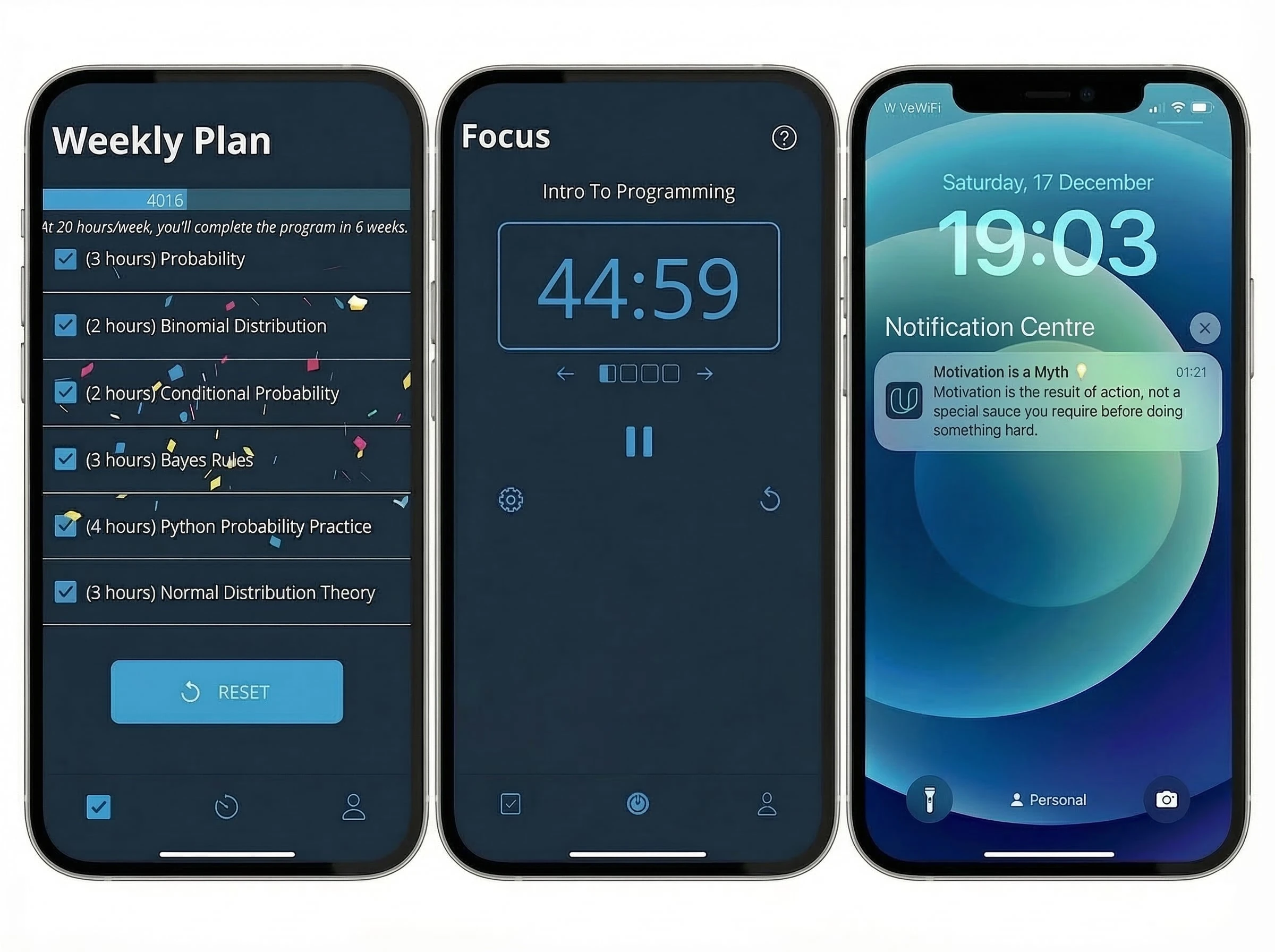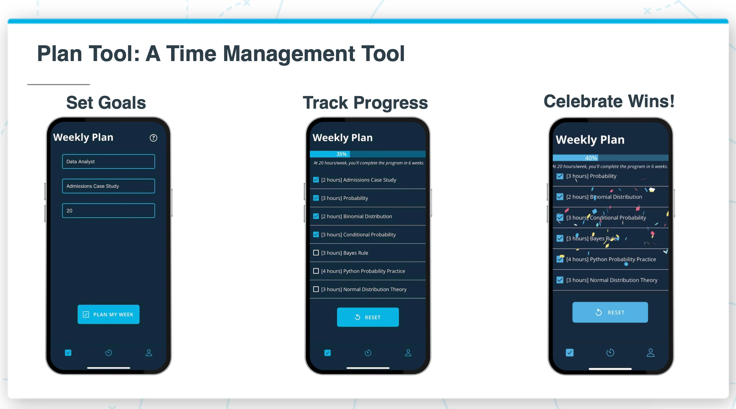 The Plan tool takes three inputs — your program, your current lesson, and how many hours you can dedicate this week — and generates a personalized study plan. As you check off lessons, you see your progress across the entire program. When you complete your weekly target, the app celebrates with confetti. Small, but it matters.