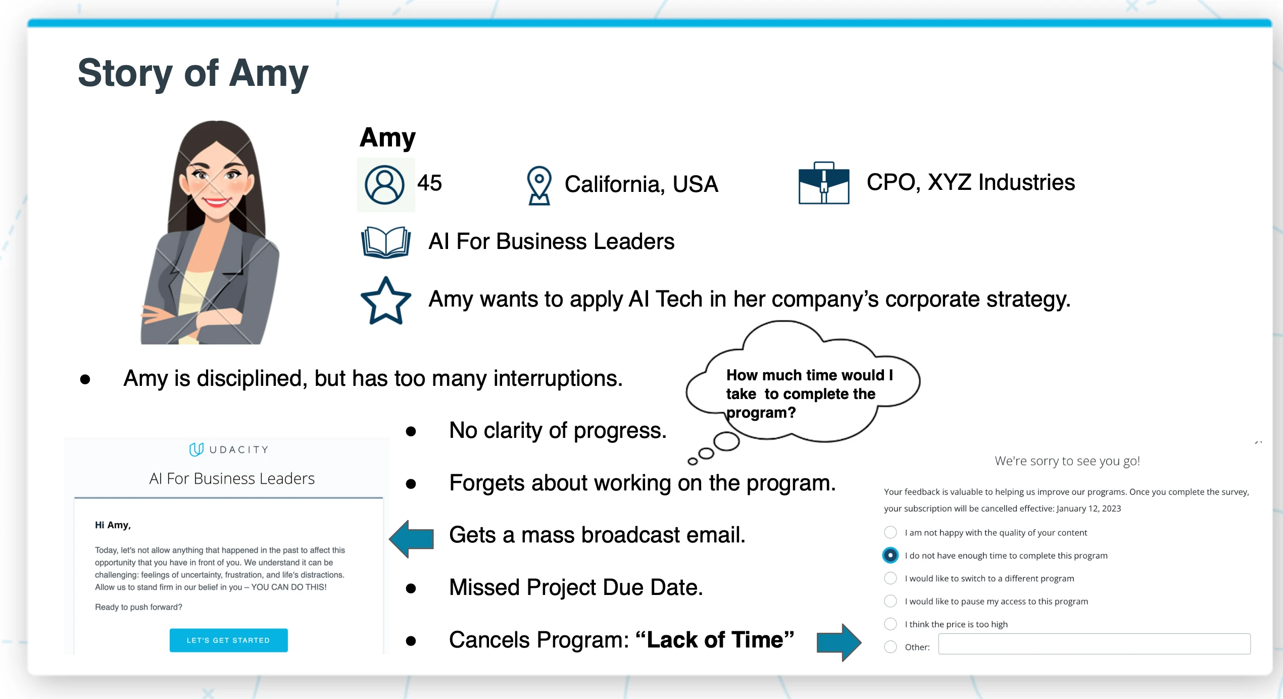 Amy is 45, a CPO trying to learn AI strategy. She's disciplined but has too many competing priorities. She has no clarity on her progress, forgets about the program for weeks, gets a generic broadcast email that doesn't land, misses her project deadline, and cancels — citing "Lack of Time."