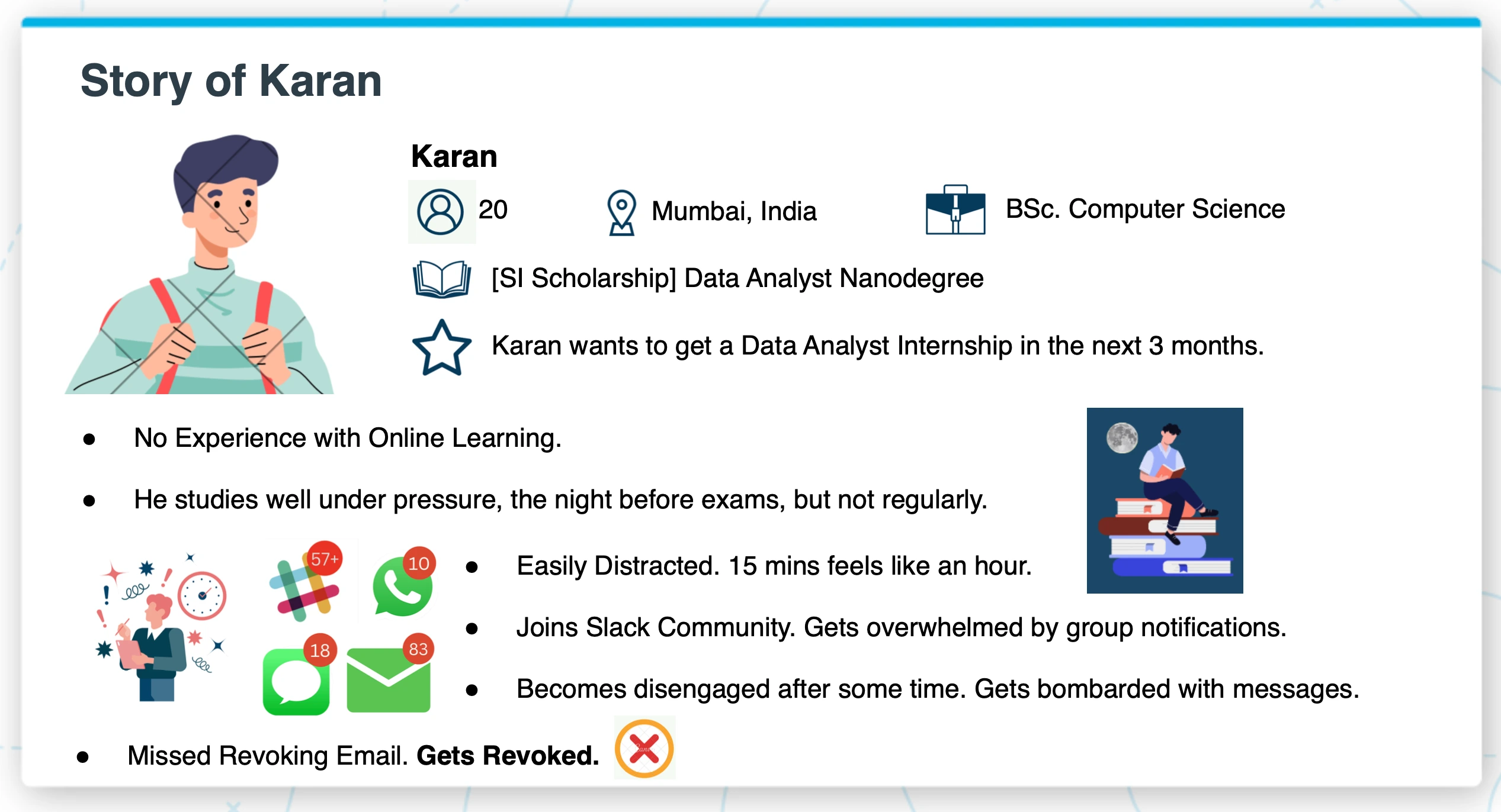 Karan is 20, studying for a Data Analyst internship. He's smart but has zero experience with online learning. He studies well the night before exams but can't maintain consistency. He joins the Slack community, gets overwhelmed by group notifications, disengages, misses a critical deadline email, and gets his access revoked.