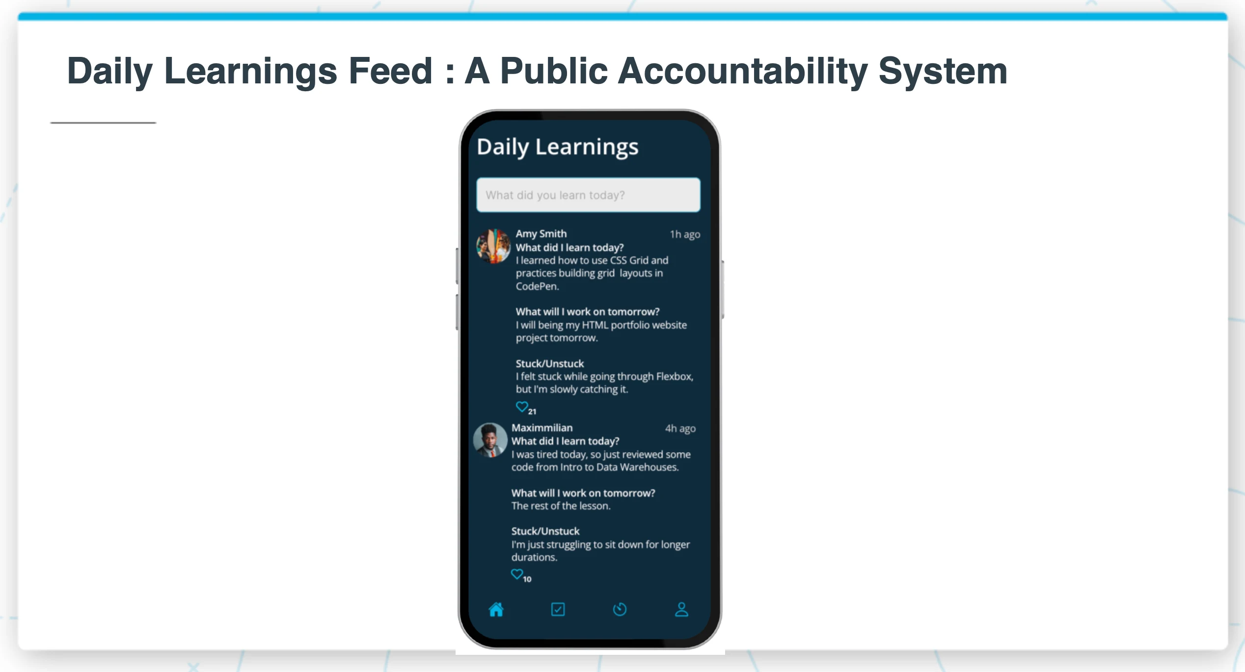 The Daily Learnings Feed created a public accountability system. Students shared what they learned today, what they'd work on tomorrow, and where they were stuck. Peer visibility turns learning from a solo grind into a shared journey.