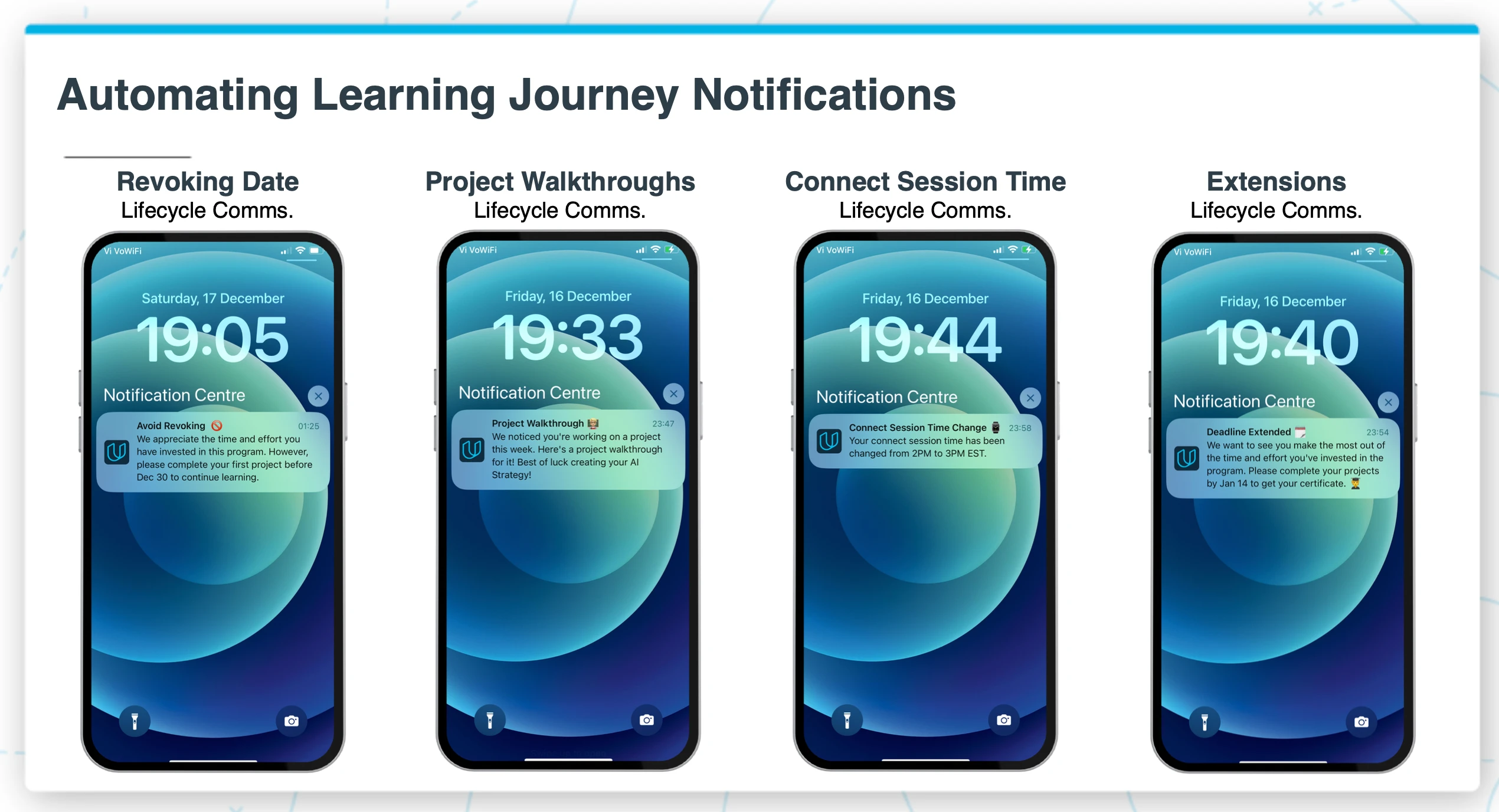 This is where the real leverage is. Instead of scattering messages across email, SMS, WhatsApp, and Slack — all of which students ignore — I consolidated everything into push notifications. One channel. Persistent. High visibility. Zero cost. And every notification was designed to trigger a specific action, not just inform.