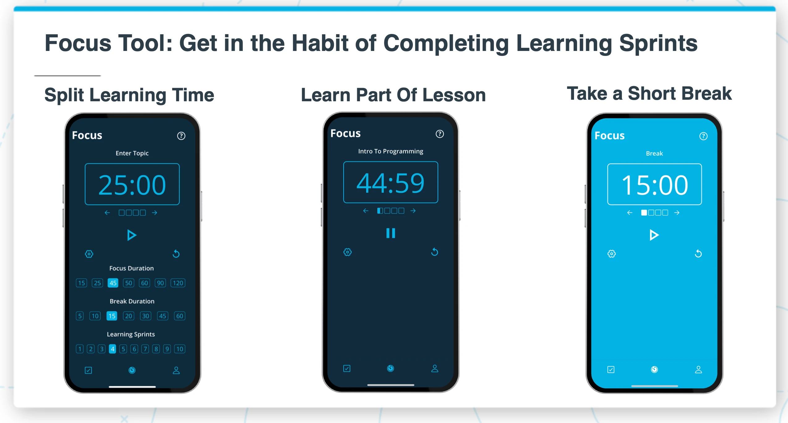Most students can't sit and focus for an hour. They don't need to. The Focus tool uses the Pomodoro technique — customizable sprint duration, break duration, and session count. Start with 25-minute sprints. Build up over time. The goal isn't marathon study sessions. The goal is showing up every day.