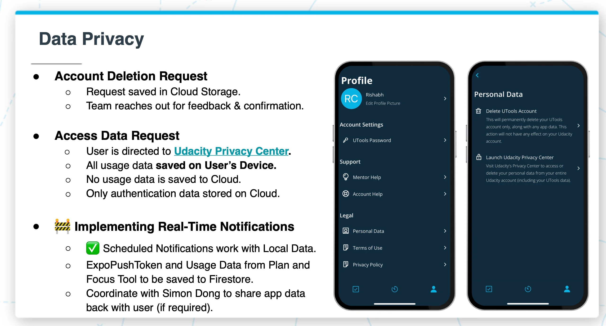 Account deletion: Built a full account deletion flow — accessible from Profile → Personal Data → Delete Account. Request logged, team confirms, data purged within 7 days.