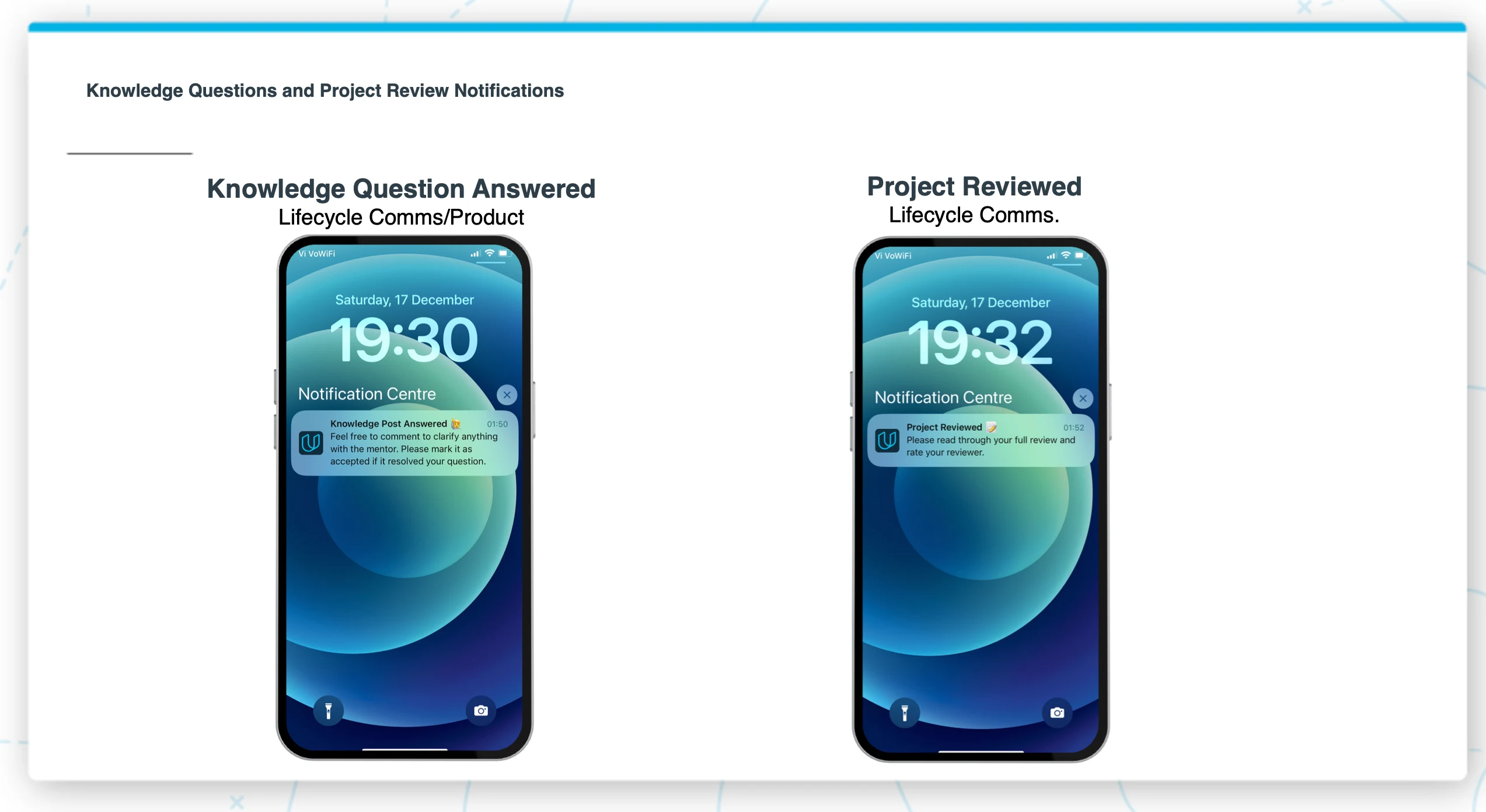 Additional Phase 2 notifications covered knowledge questions, project reviews, and gamification through Student of the Month — each one automating work that previously required manual effort from multiple teams.