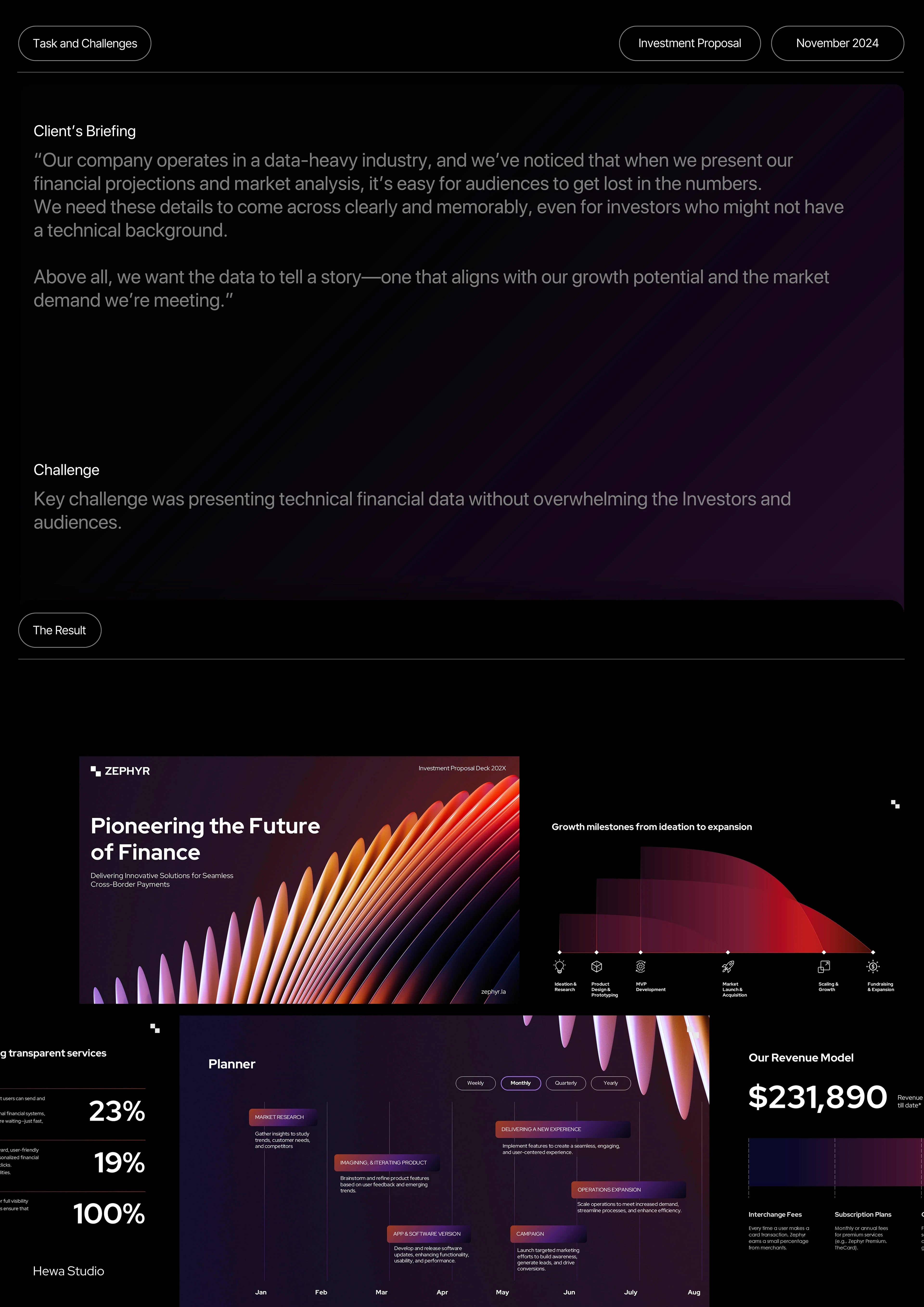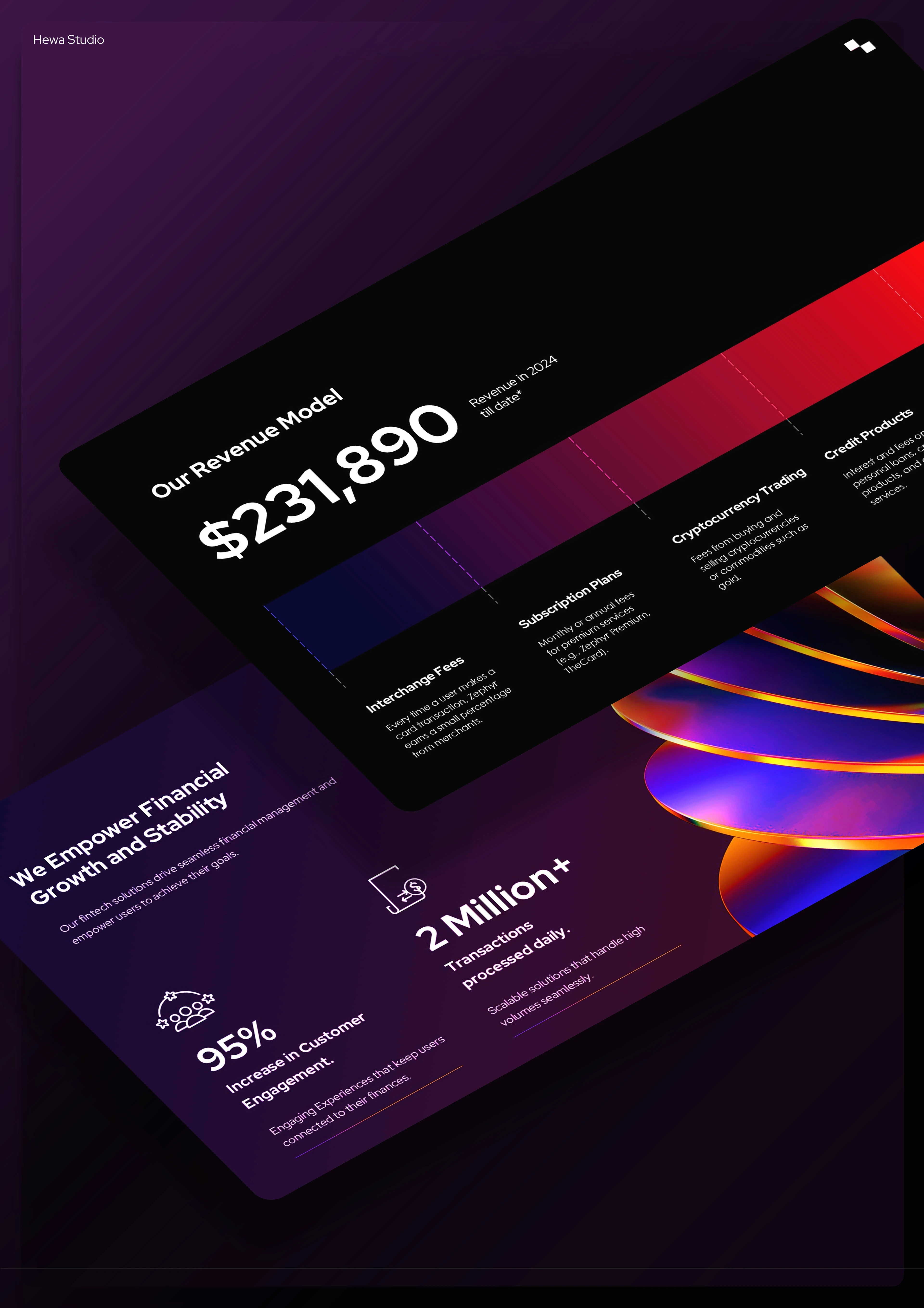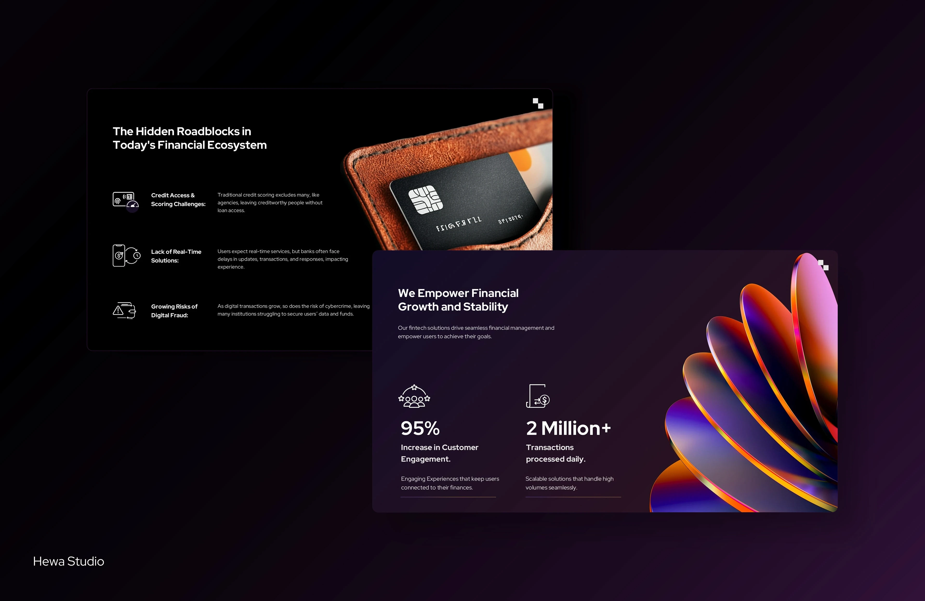 The visual direction focused on clarity, minimalism, and modern fintech styling — using high contrast, sharp typography, and clean layouts to guide the investor’s eye and highlight key metrics.